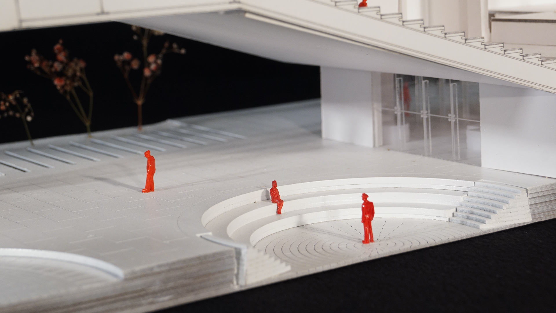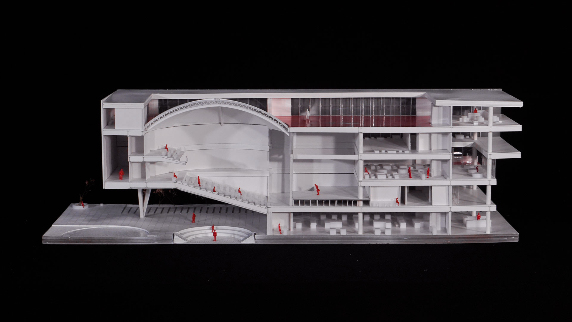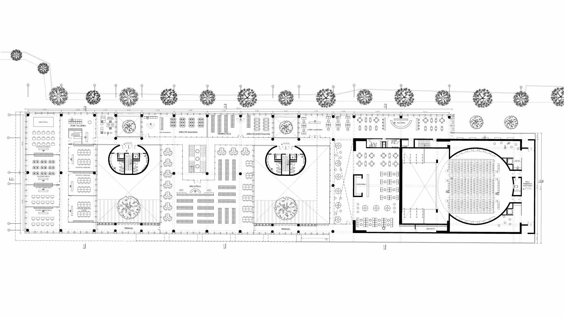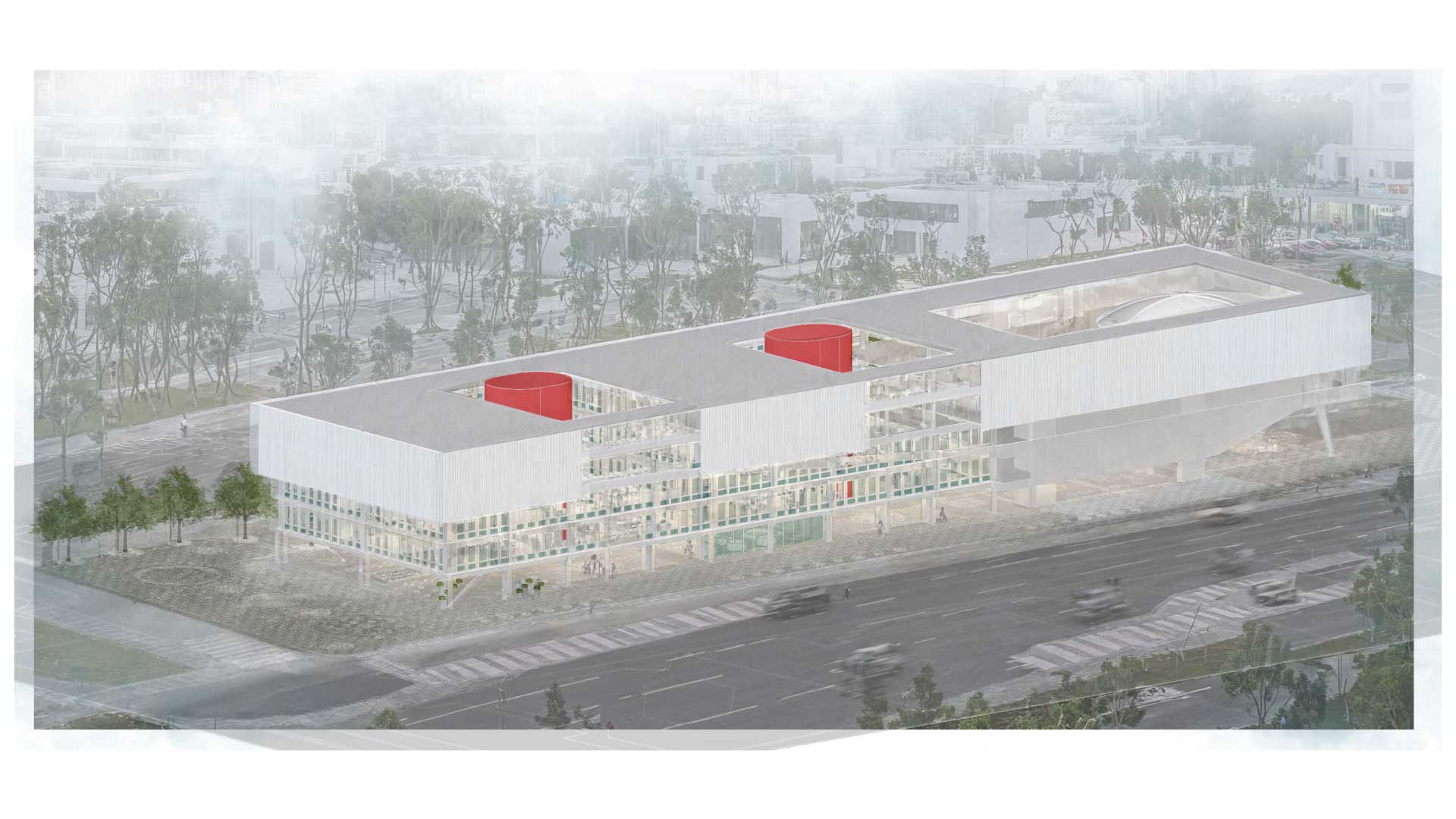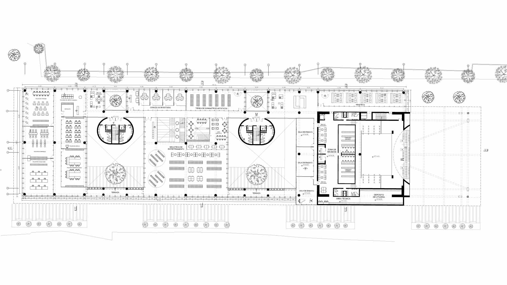A partir del segundo nivel, se distribuyen los programas culturales en tres volúmenes: el primero está dedicado al arte, el segundo se enfoca en una biblioteca y el tercero alberga un auditorio.
