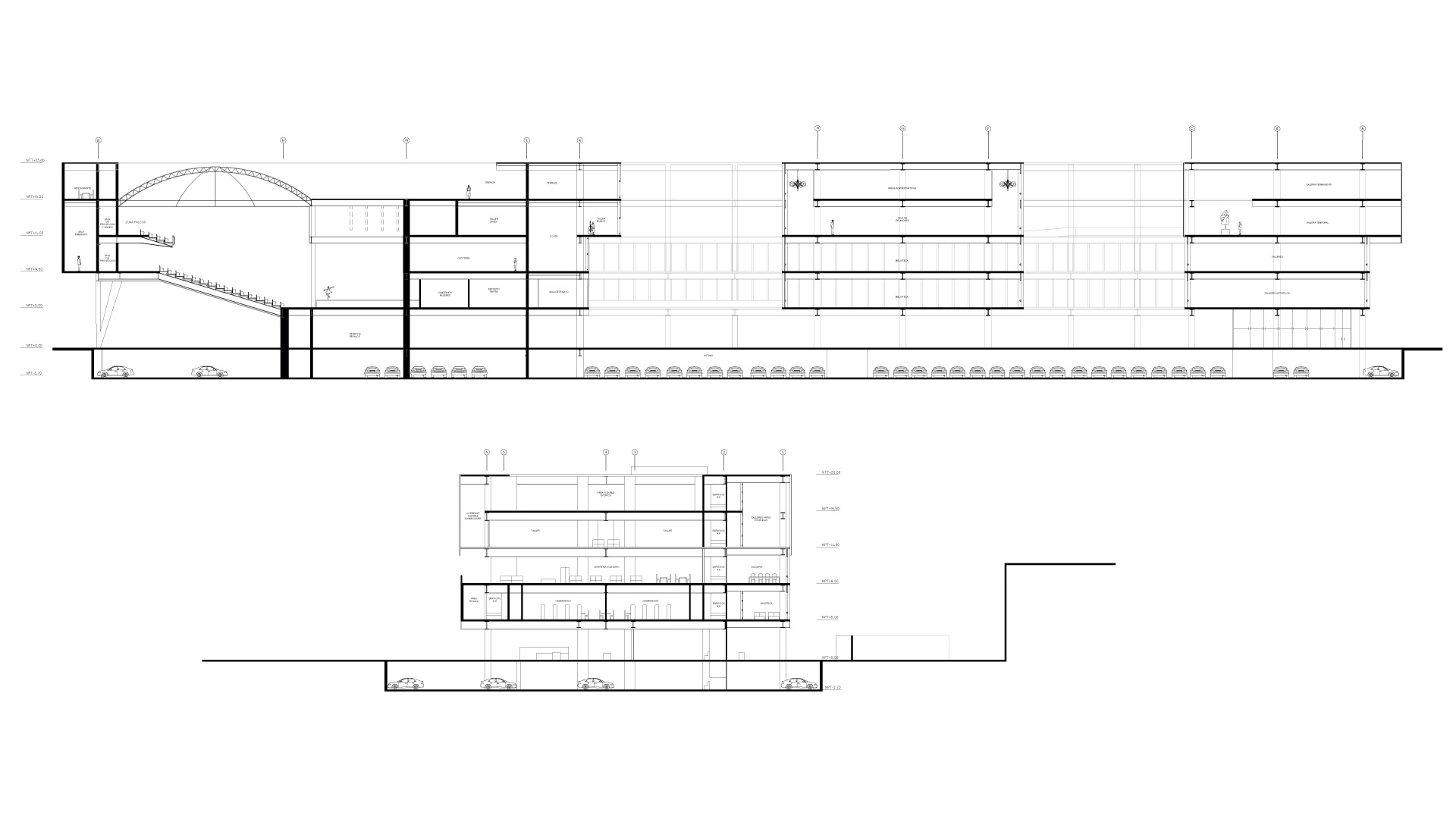 El edificio consta de cinco niveles, donde se incluyen dos patios centrales que albergan núcleos de circulación expuestos, lo cual facilita el recorrido de los usuarios y organiza el espacio de manera eficiente.