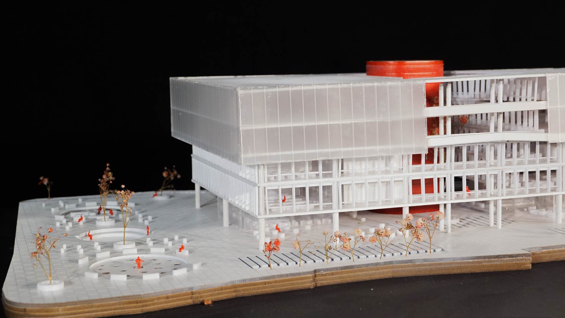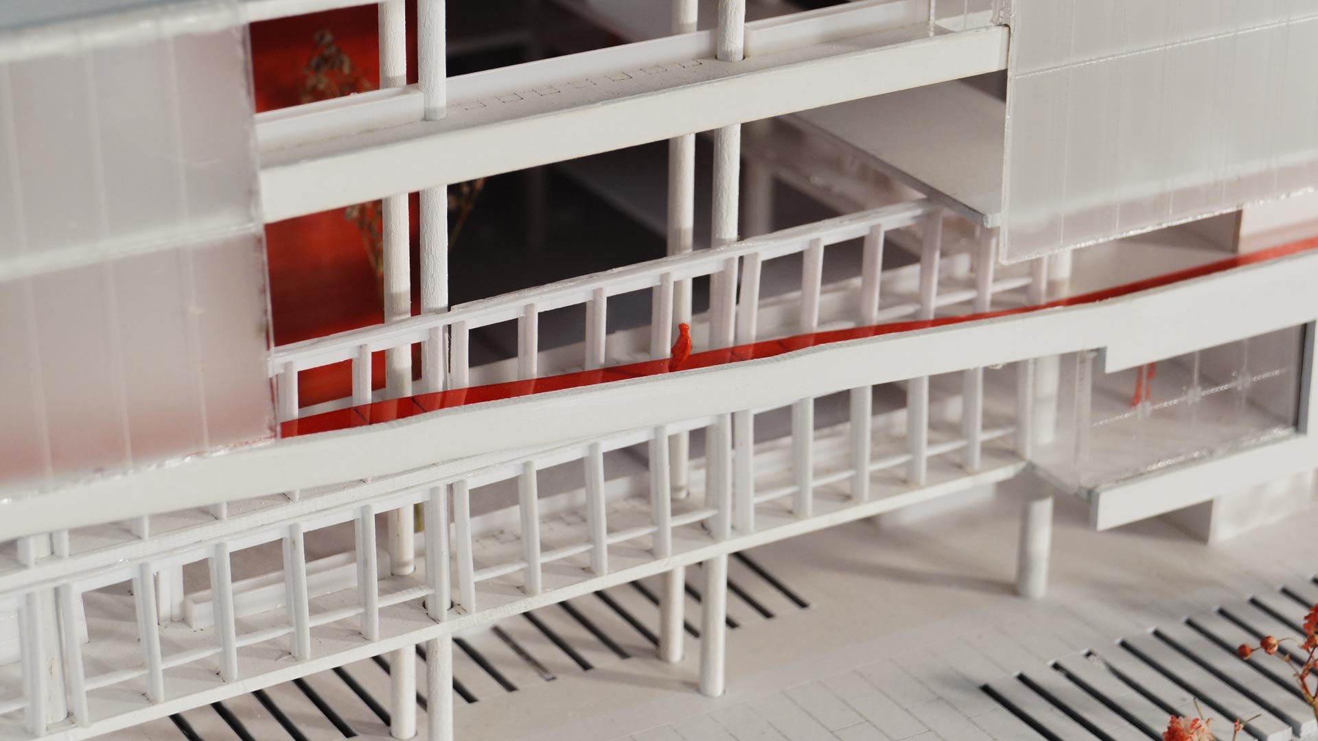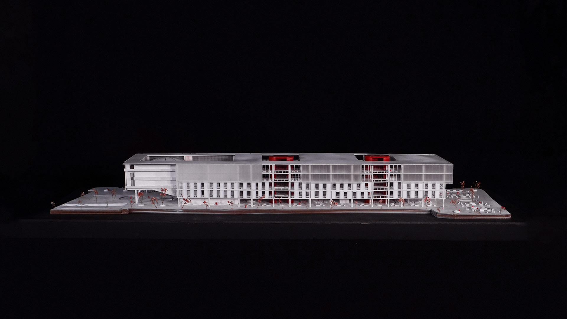 En cuanto a la fachada, se trabajó con diferentes niveles de transparencia según el programa que alberga cada volumen. Los programas que requieren un mayor control visual se ubican en los niveles superiores, que utilizan materiales como policarbonato, que proporcionan privacidad sin cerrar completamente el edificio al exterior.