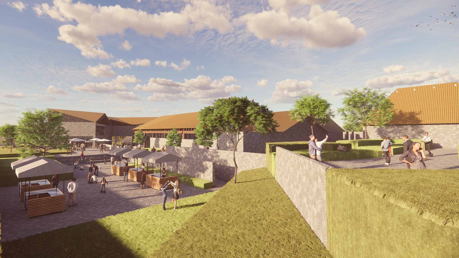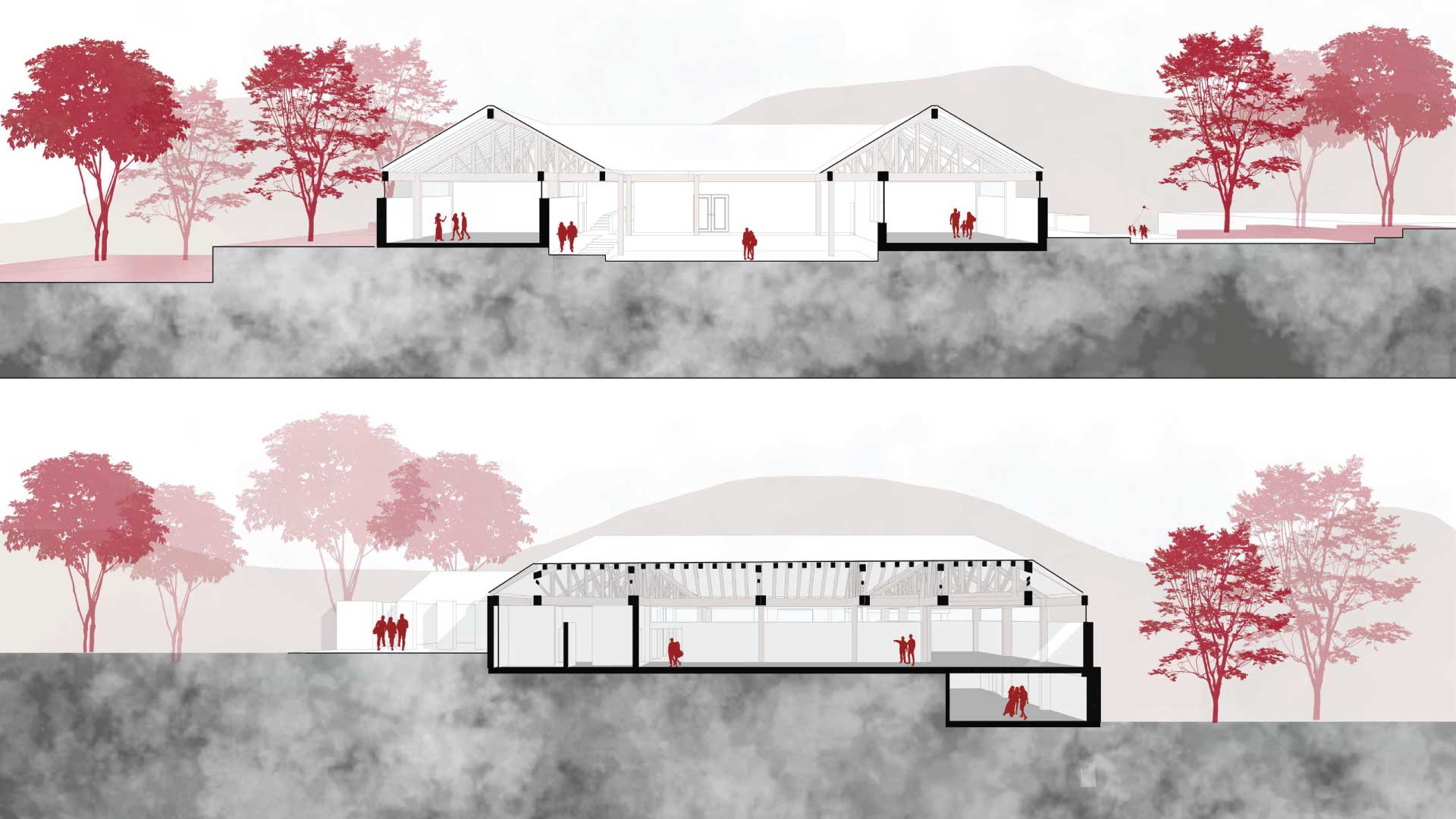 La propuesta integra elementos vernáculos y materiales locales, como piedra y madera, reinterpretados para adaptarse a las necesidades actuales. La topografía del terreno se aprovecha mediante plataformas inspiradas en la andenería incaica, lo cual permite que los volúmenes arquitectónicos emerjan del paisaje de manera armónica, de modo que respete su entorno natural.