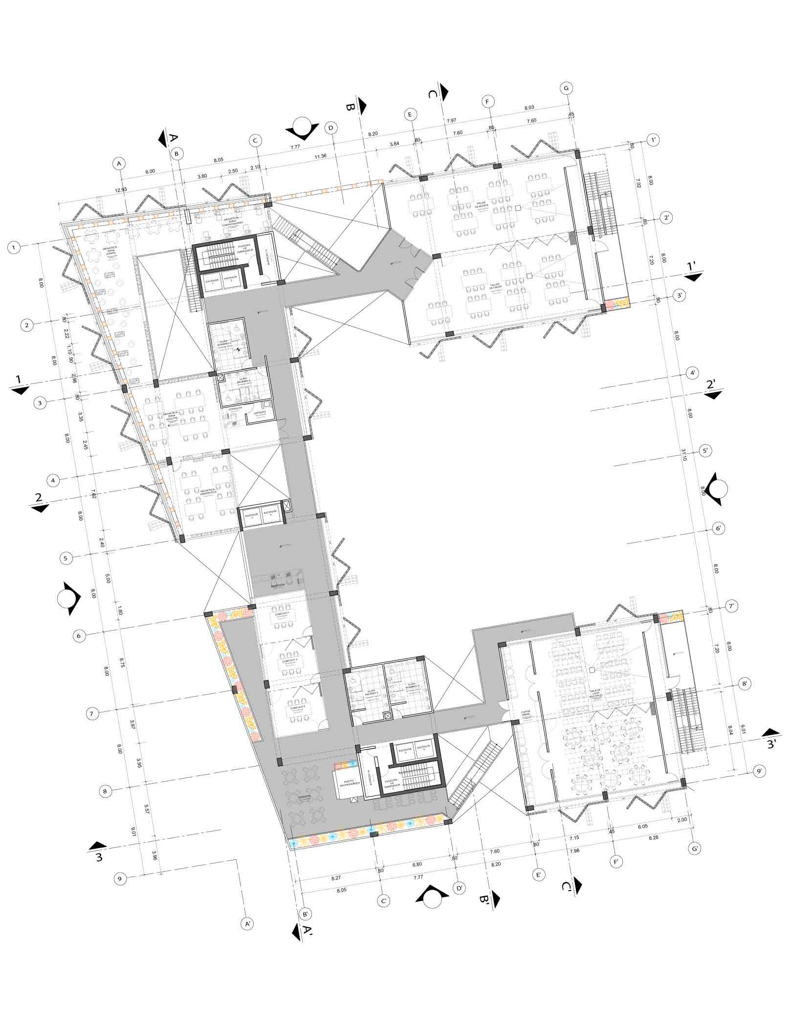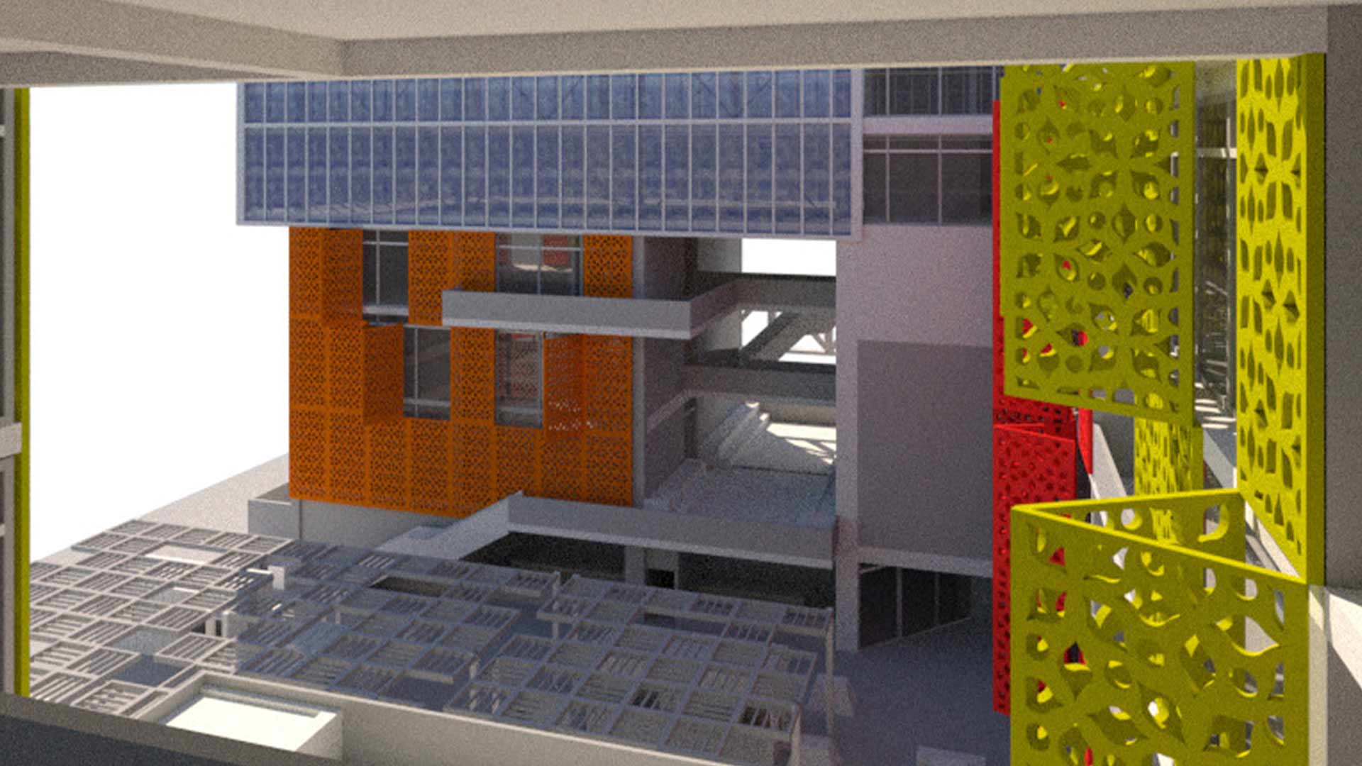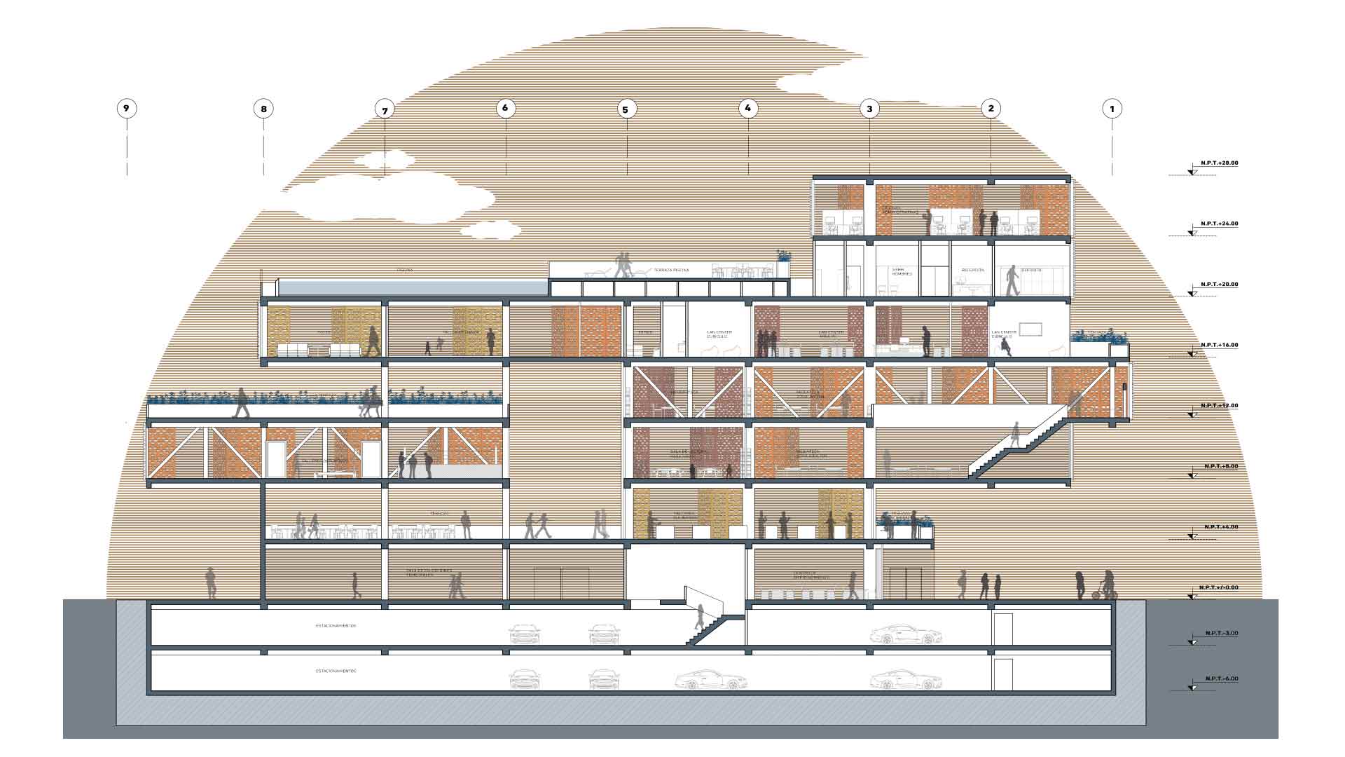 El proyecto adopta un sistema estructural mixto en el que las vigas y puentes asumen un papel protagónico, de modo que aporta carácter y riqueza arquitectónica al espacio. Estas decisiones no solo responden a criterios técnicos, sino que también contribuyen a una narrativa espacial única, donde la estructura se convierte en un componente expresivo del diseño.