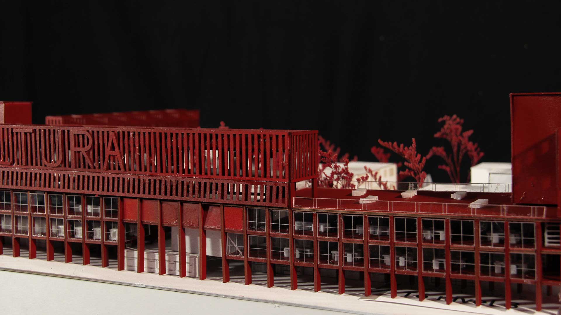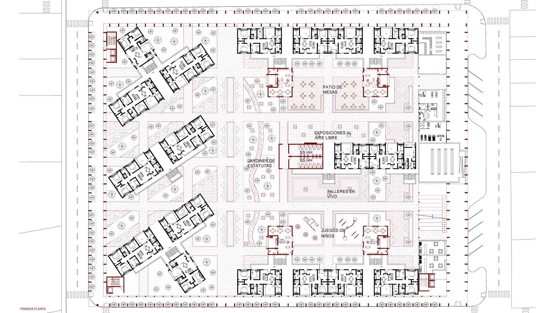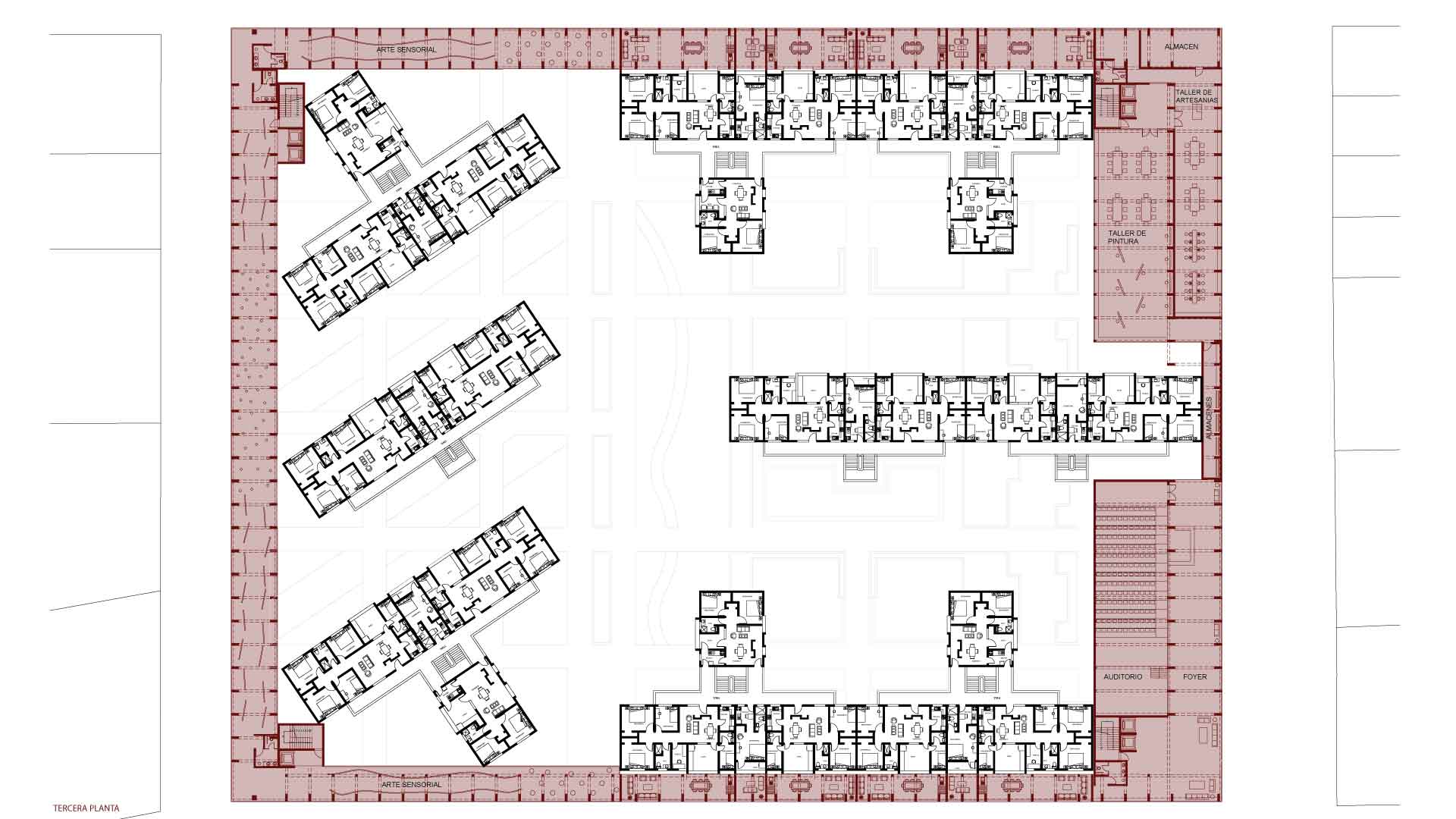 Por último, puestos comerciales donde el usuario puede comprar tanto las obras de exposición como diferentes materiales de arte. La propuesta cuenta con cinco pisos, cada uno especializado en un programa por mostrar, los primeros pisos son los privados, con bibliotecas, auditorios y talleres. En el cuarto piso, se presentan las tiendas y mercados de arte tanto cerradas como al aire libre, y en el último piso, las galerías de arte de los distintos tipos.
