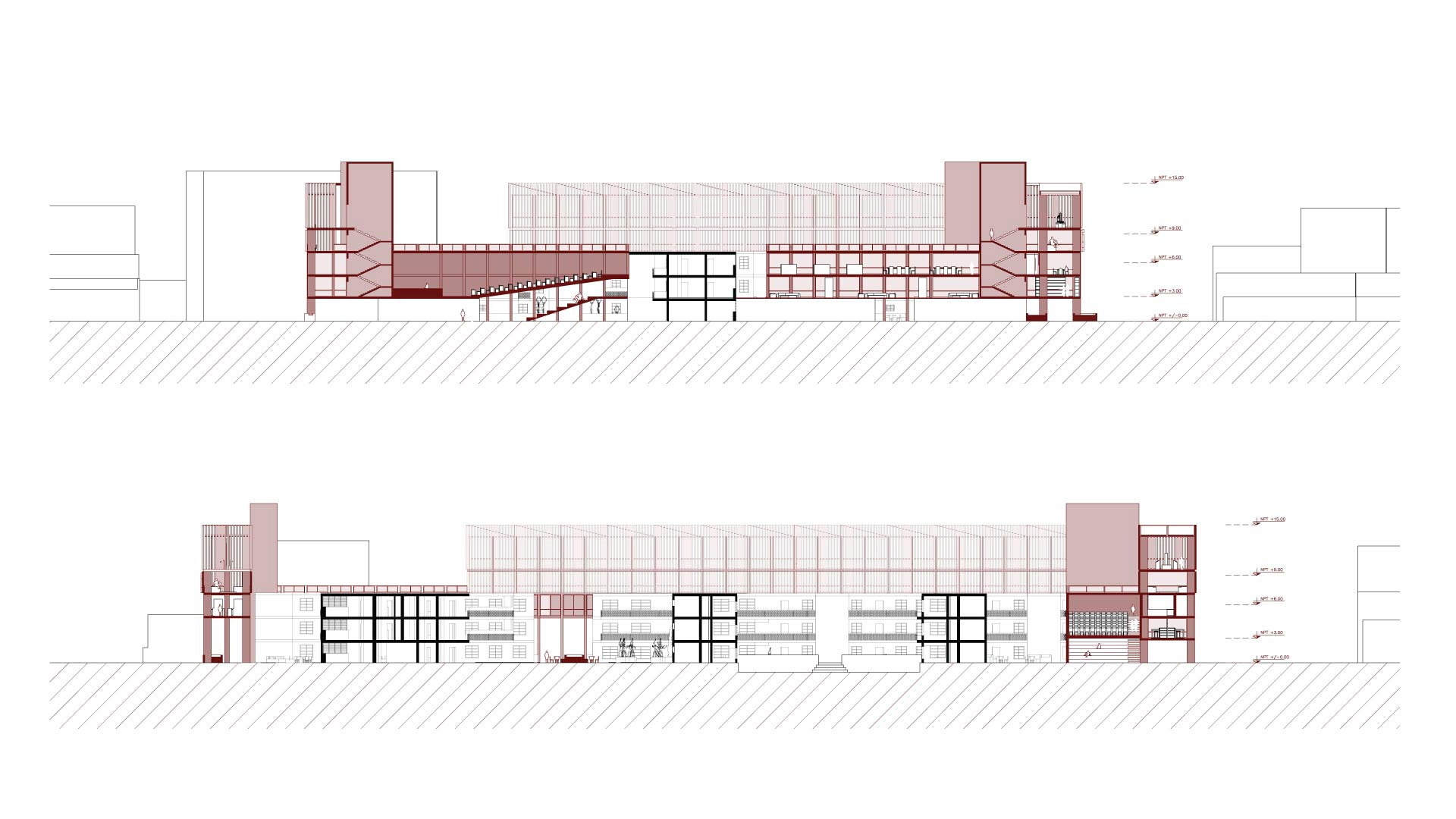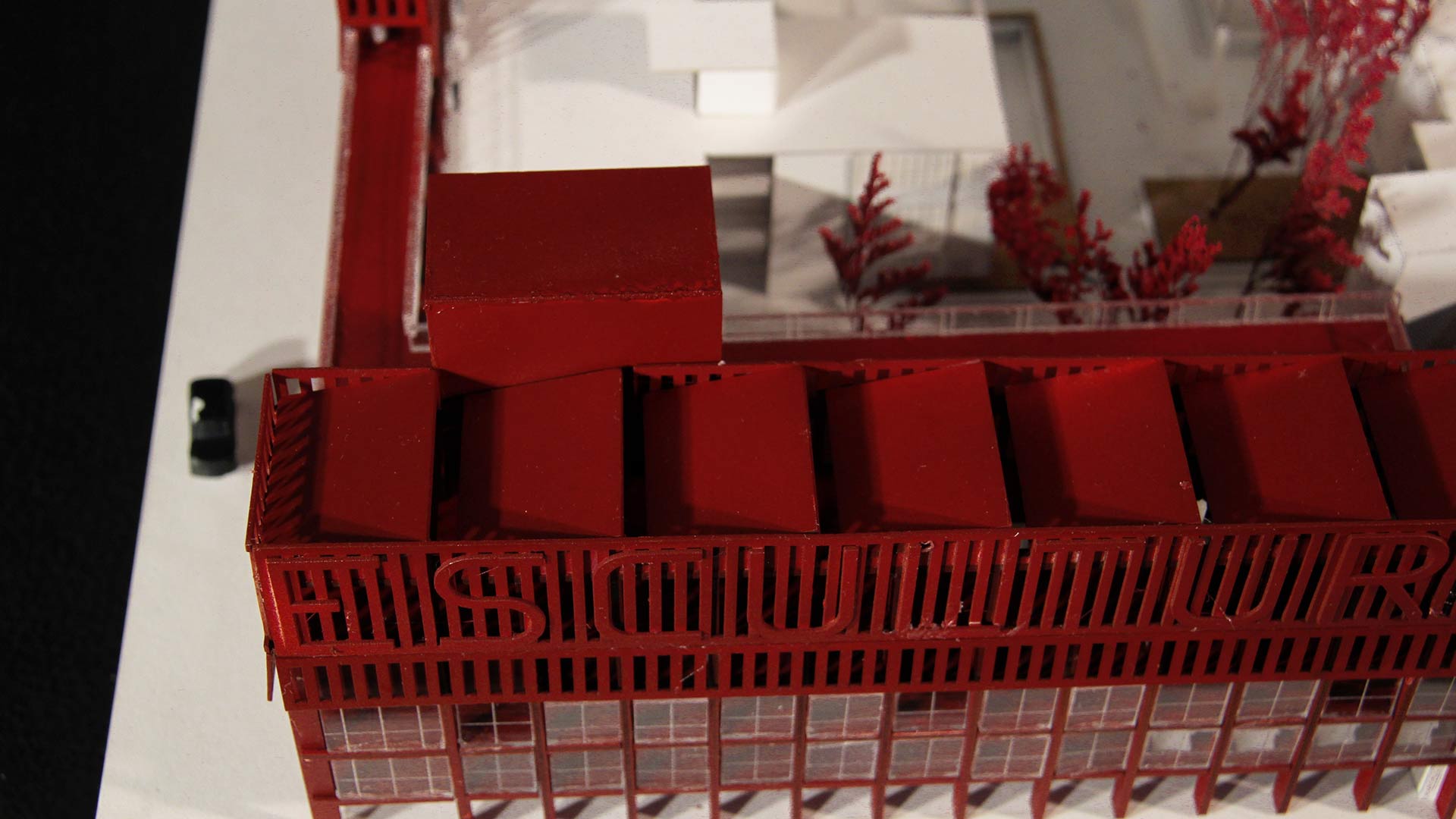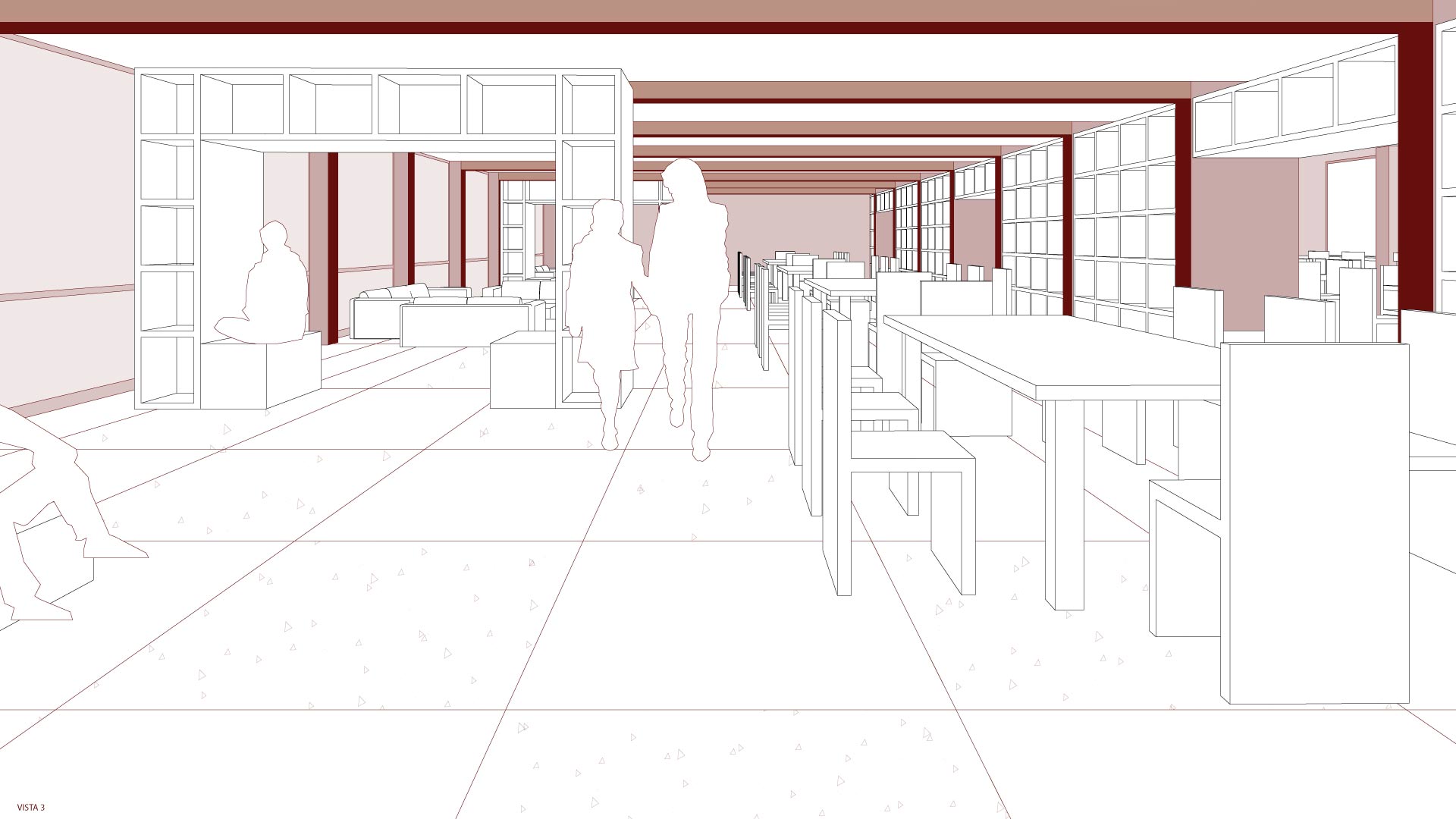 Por último, puestos comerciales donde el usuario puede comprar tanto las obras de exposición como diferentes materiales de arte. La propuesta cuenta con cinco pisos, cada uno especializado en un programa por mostrar, los primeros pisos son los privados, con bibliotecas, auditorios y talleres. En el cuarto piso, se presentan las tiendas y mercados de arte tanto cerradas como al aire libre, y en el último piso, las galerías de arte de los distintos tipos.