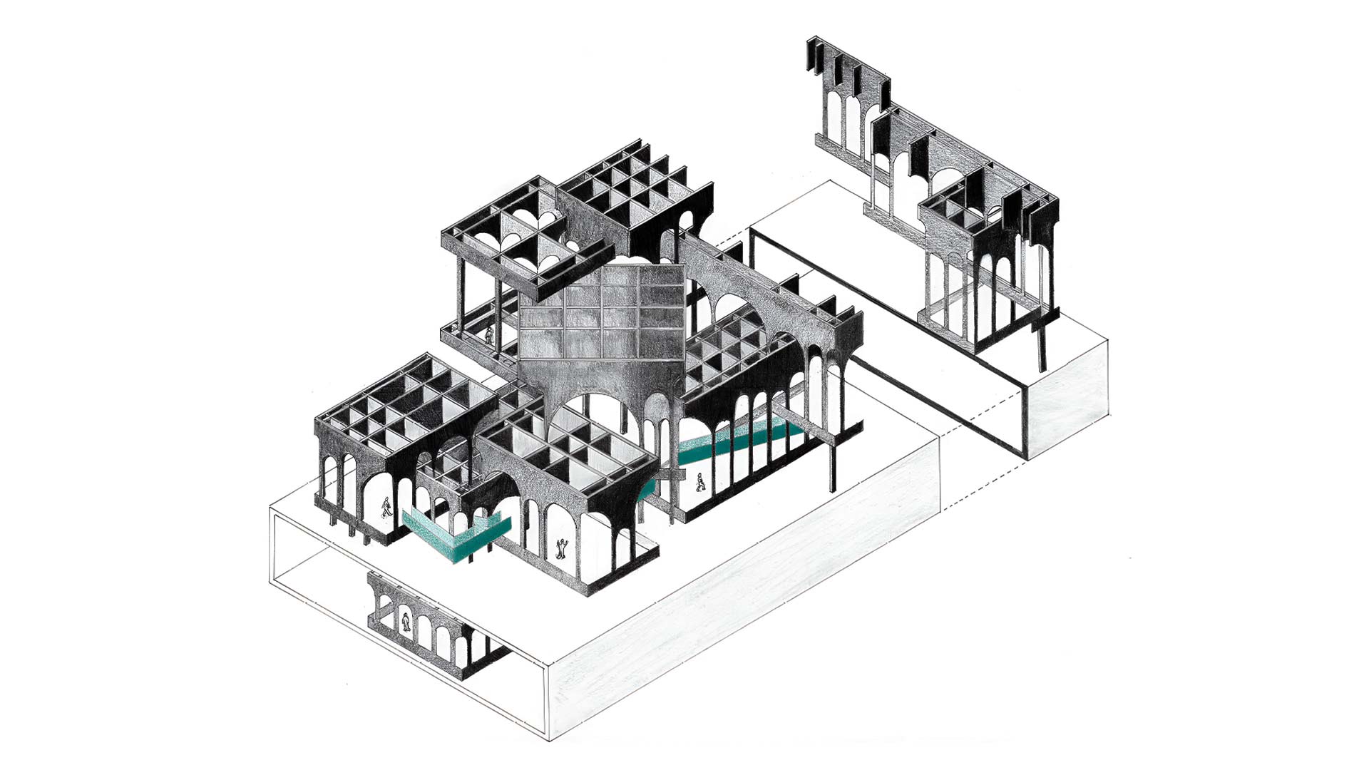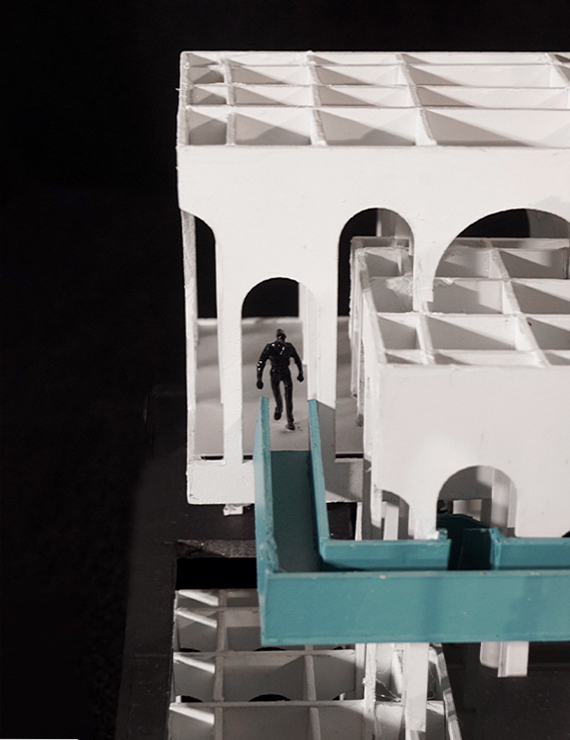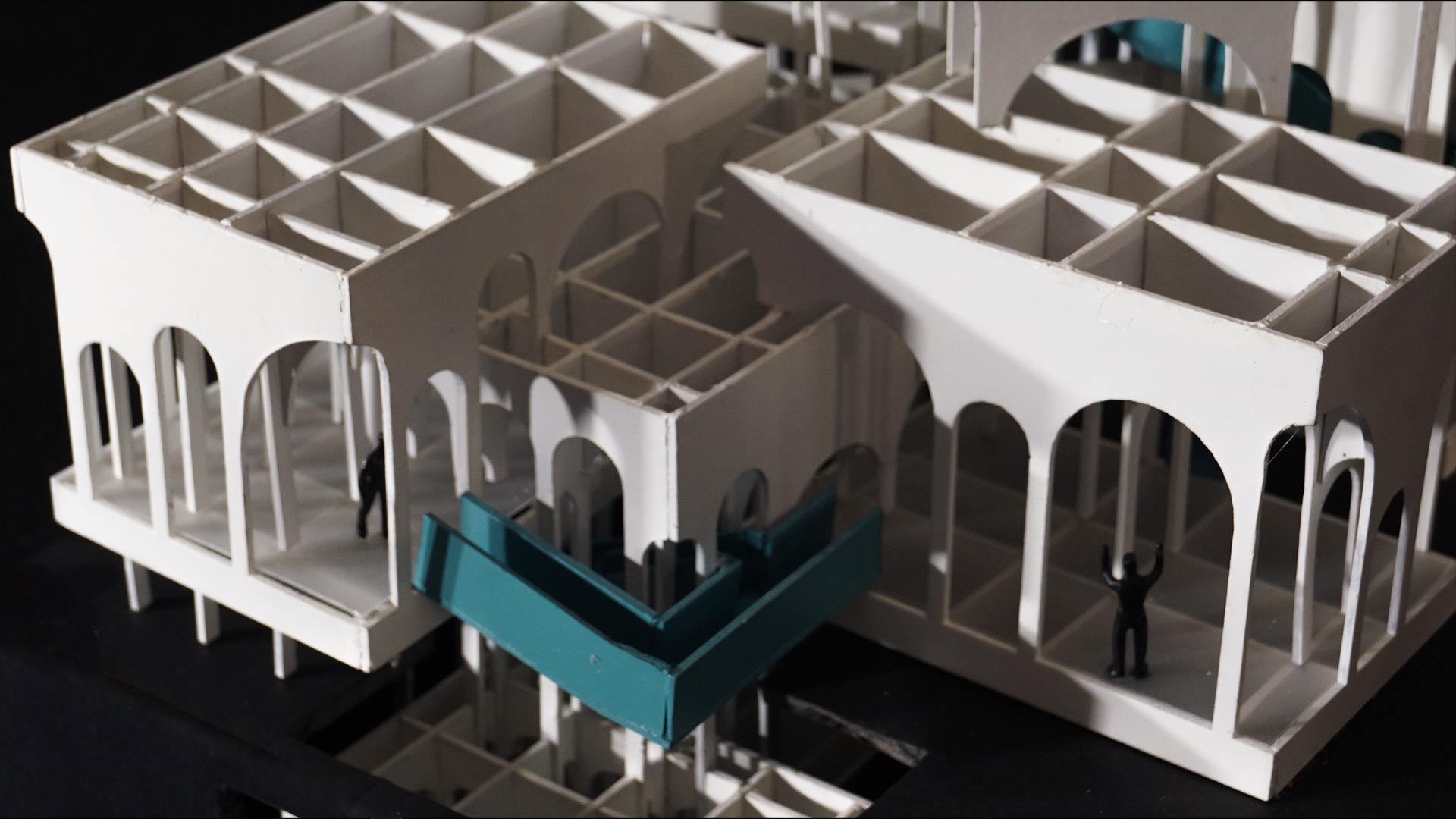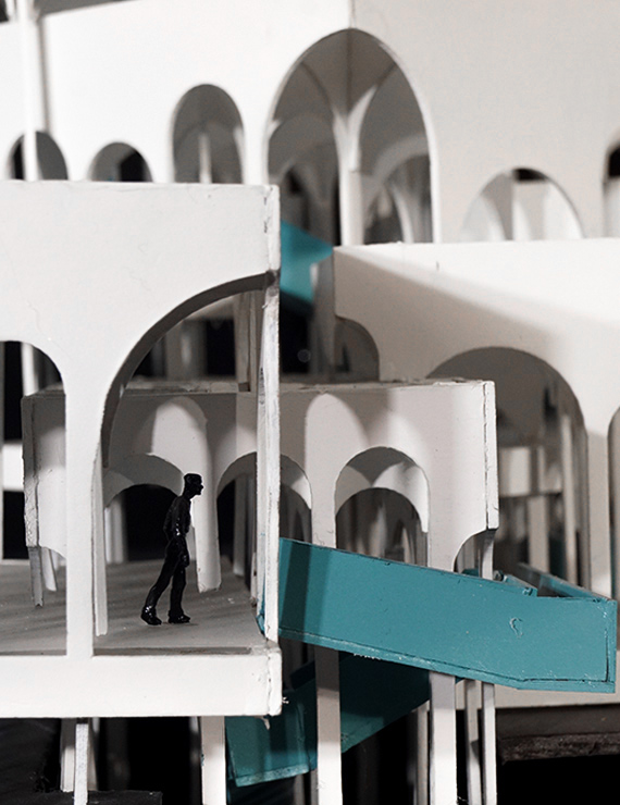La complejidad estructural y espacial del proyecto surge del proceso de composición conforme con una grilla establecida en la base del ejercicio, complementada con la incorporación de arcos que siguen una modulación de dos de altura. En los distintos tamaños de arcos, degradé las alturas, lo cual se refleja en la composición de los volúmenes que ayudan a resaltar el ingreso de la luz natural a través de ellos, de modo que se añade profundidad y perspectiva al interior.