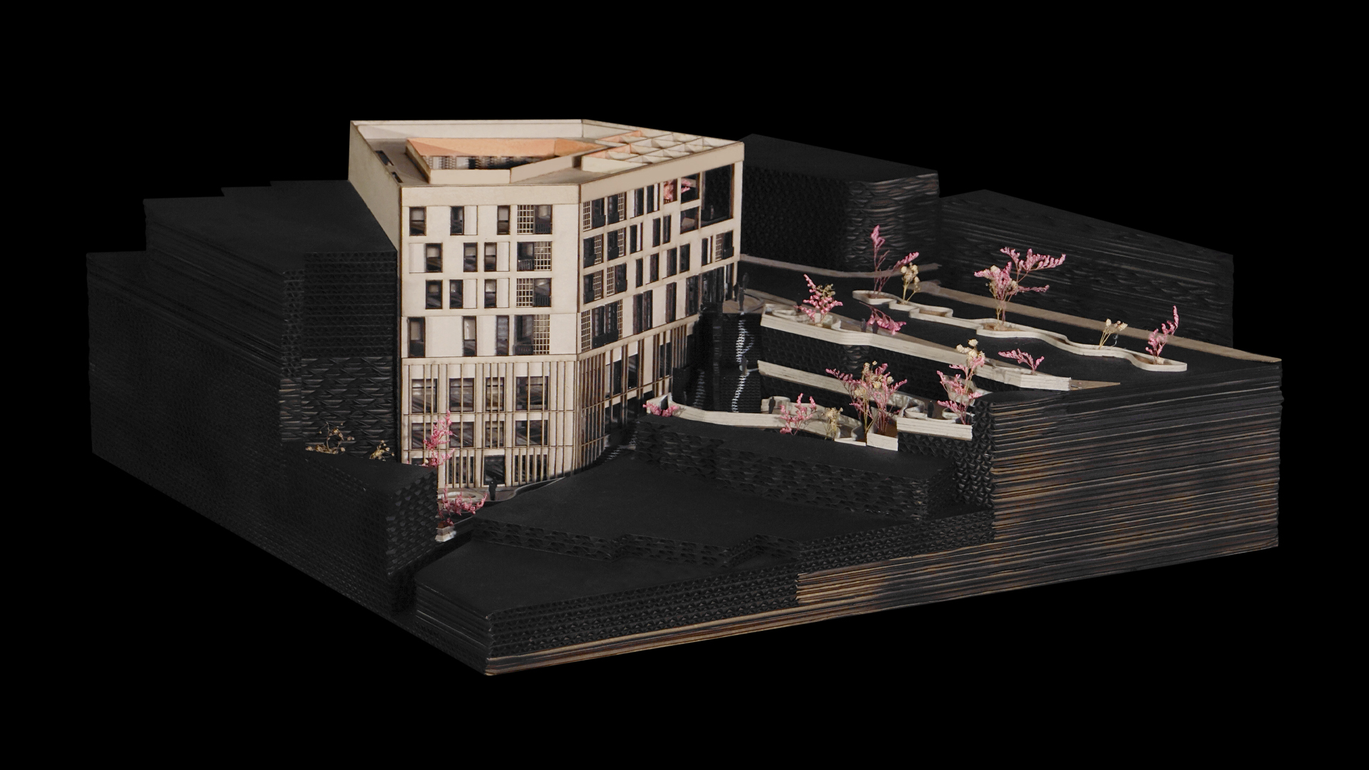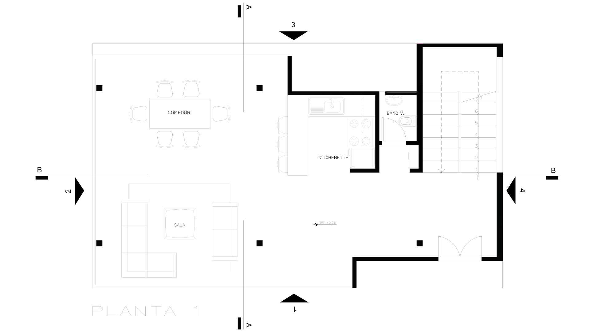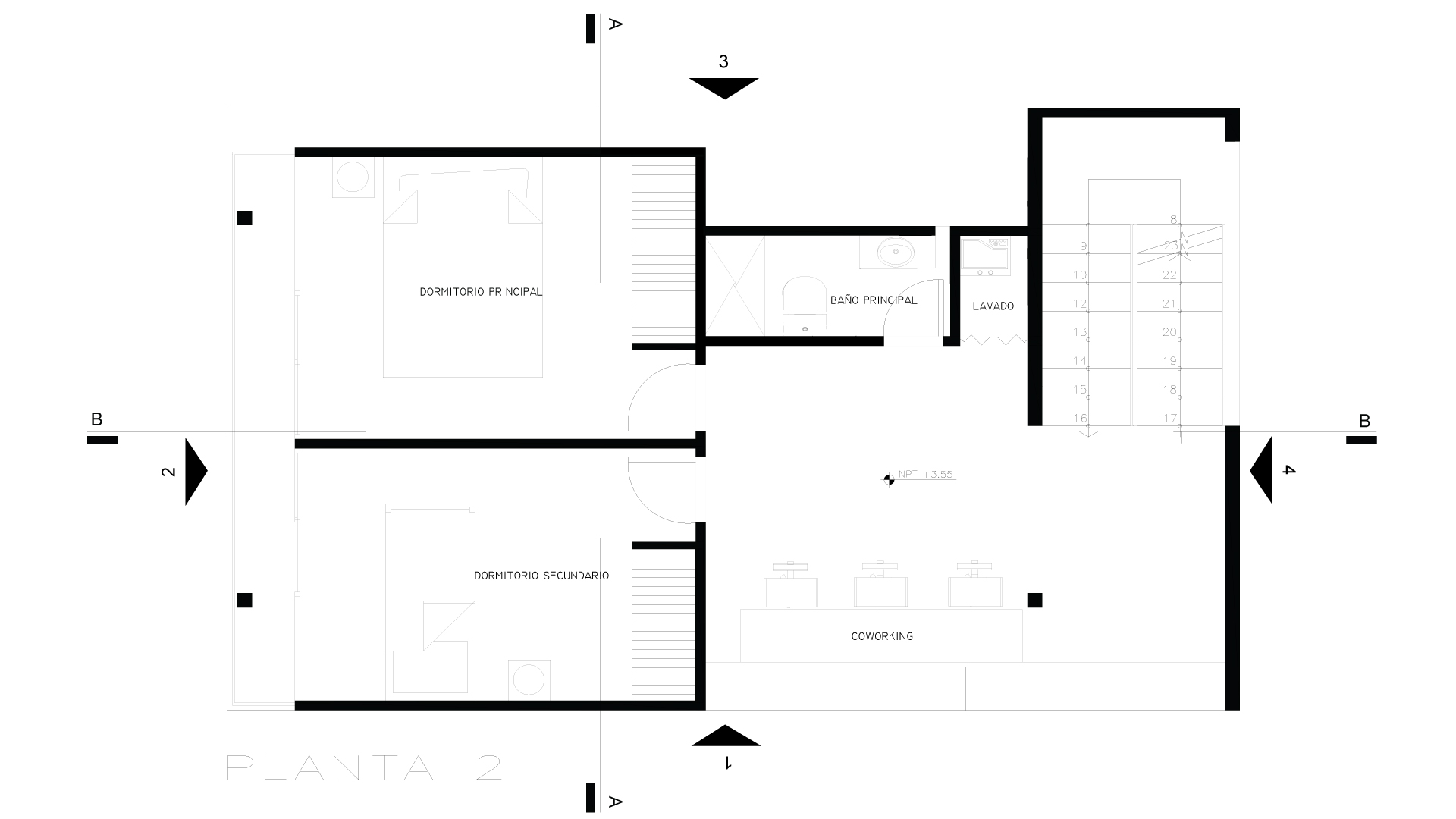 Las escaleras, concebidas con tablones, se convirtieron en un elemento estético y funcional, potenciado por un gran ventanal que genera una iluminación dramática en el espacio de circulación. La propuesta mantuvo los principios estructurales de las columnas expuestas, de modo que dialoga con la idea de transparencia y continuidad espacial, donde los límites entre lo público y lo privado se desdibujan sutilmente mediante el tratamiento lumínico y la configuración arquitectónica.