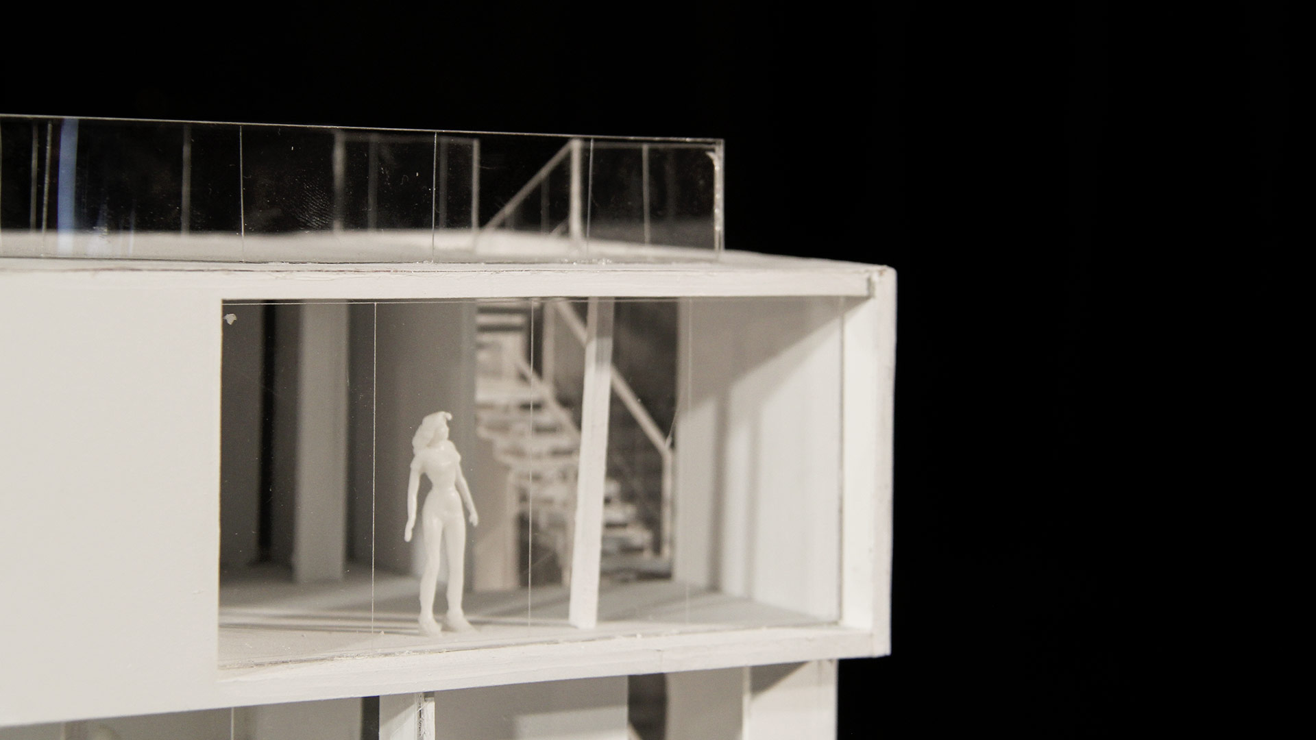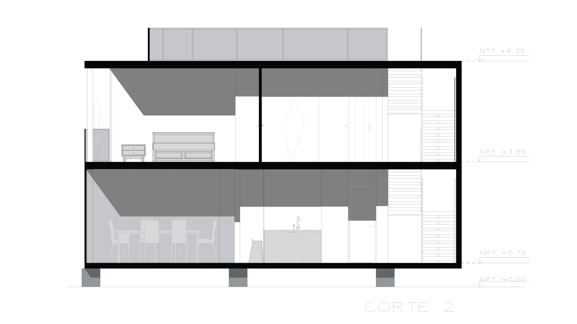 El proyecto arquitectónico se fundamentó en la filosofía de la planta libre de Le Corbusier, que explora una propuesta espacial que juega con la privacidad y la luminosidad. La distribución espacial contempló una estratégica organización programática: en el segundo nivel, los dormitorios, el baño principal, el cuarto de lavado y el espacio de coworking; mientras que, en el primer nivel, una cocina abierta integrada con sala y comedor, complementada por un baño de visitas. La intención de diseño se centró en generar una experiencia sensorial a través de la materialidad y la luz. La incorporación de ventanales, mamparas y balcones permitieron una fluida penetración de luz natural, que transforma los espacios interiores.
