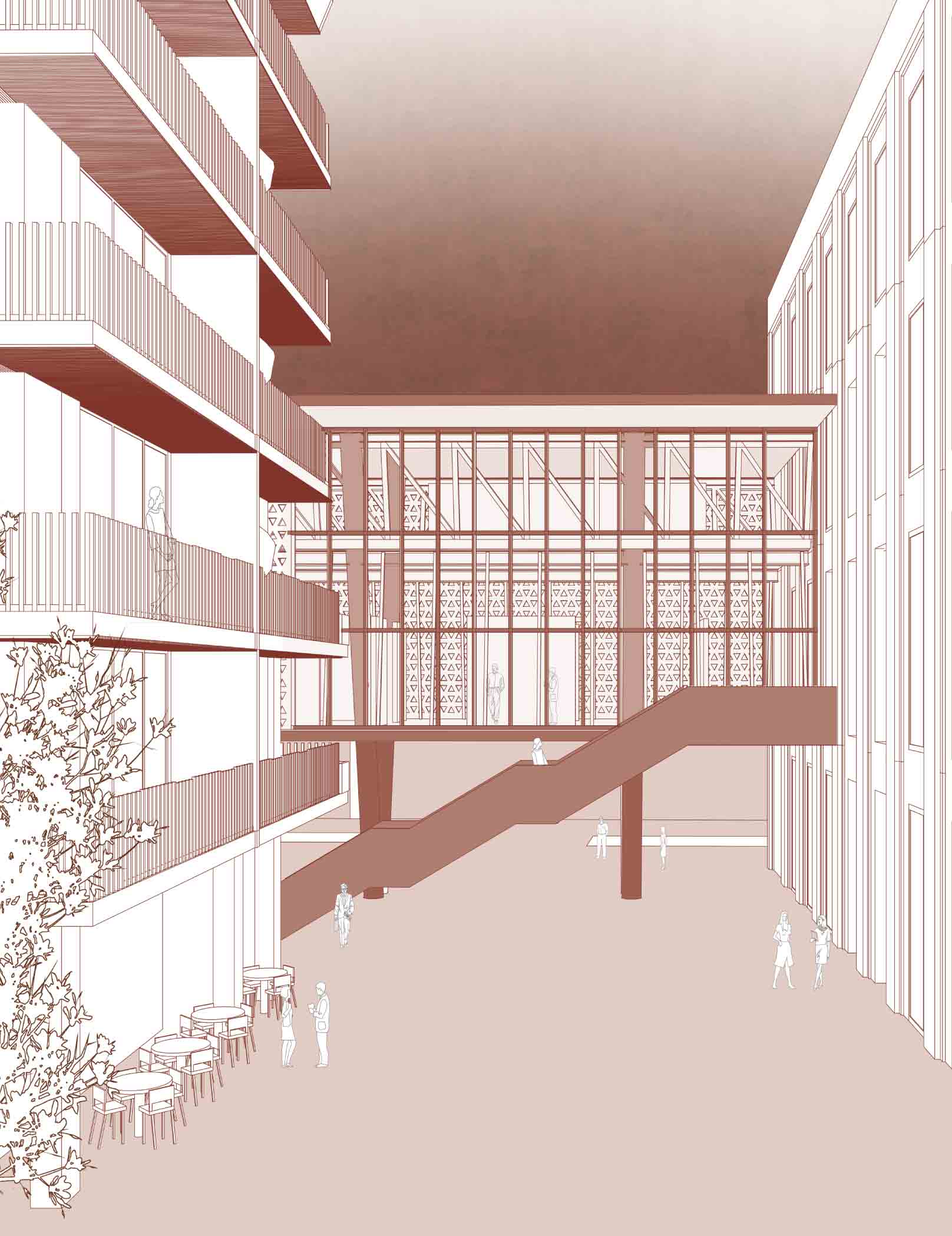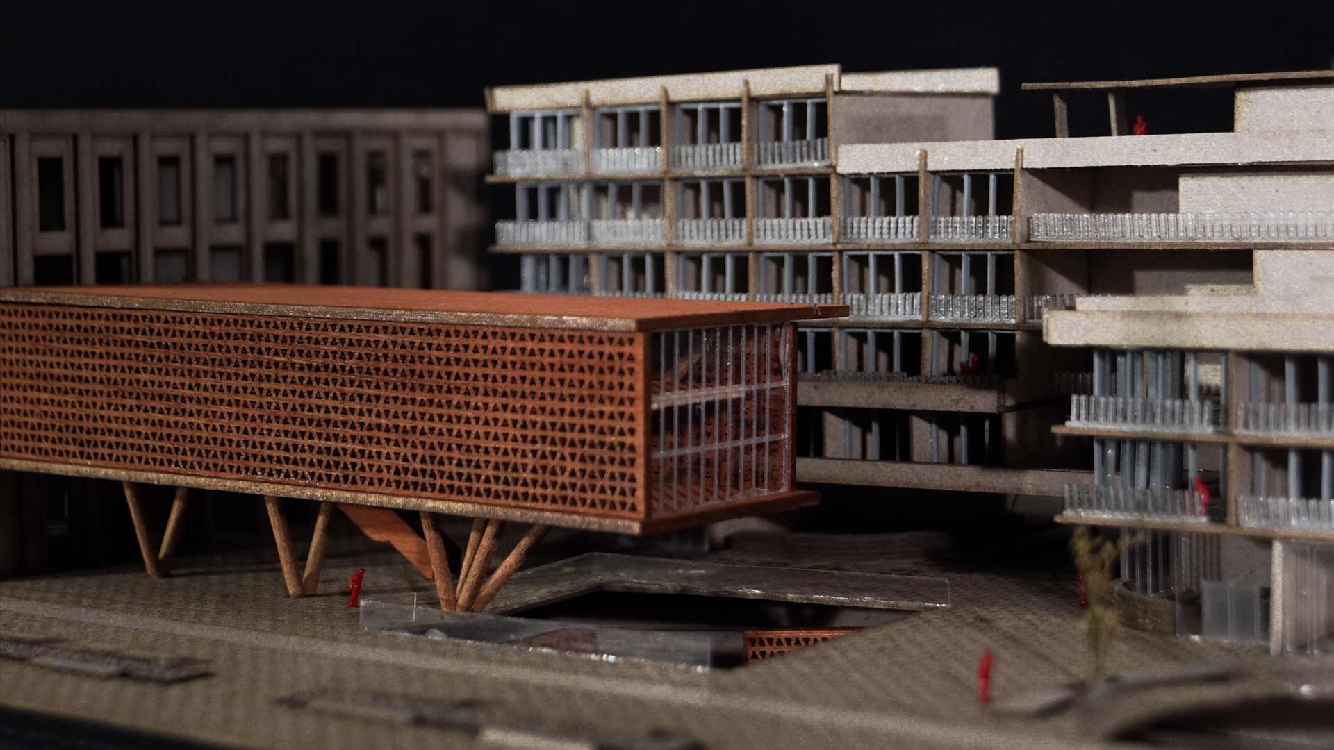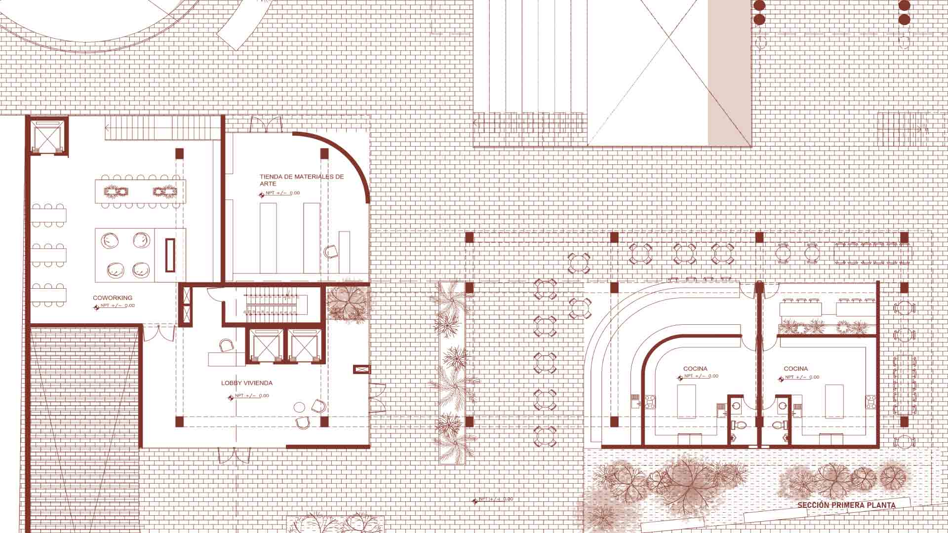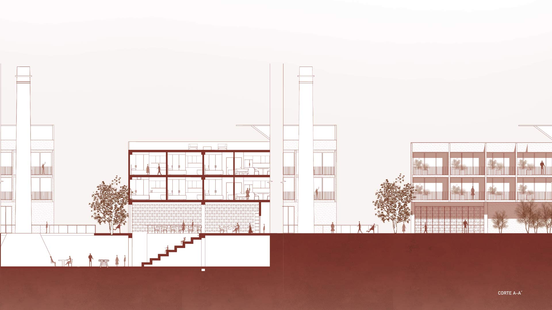 El diseño se organiza en torno a tres componentes principales: viviendas, talleres y la galería. El edificio de viviendas incluye departamentos de dos y tres dormitorios, áreas comunes como coworking, piscina y lavanderías; mientras que un segundo edificio más pequeño ofrece estudios privados. En el sótano, se ubican espacios compartidos, como gimnasio, salas de reuniones y juegos, integrados mediante un vacío circular que enmarca la preexistente chimenea.