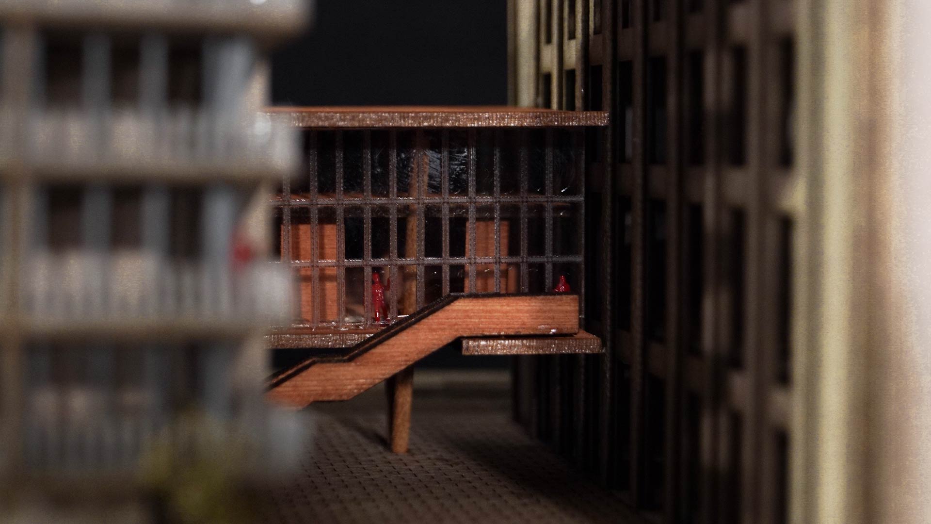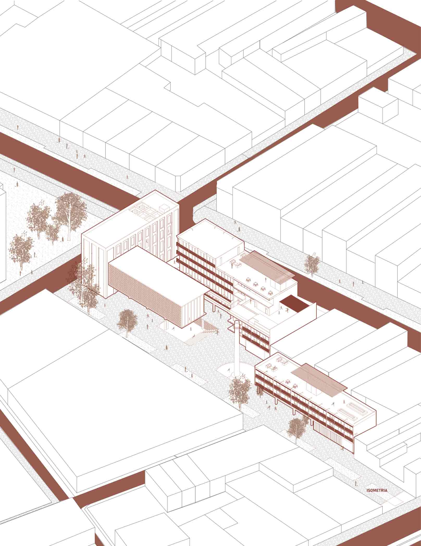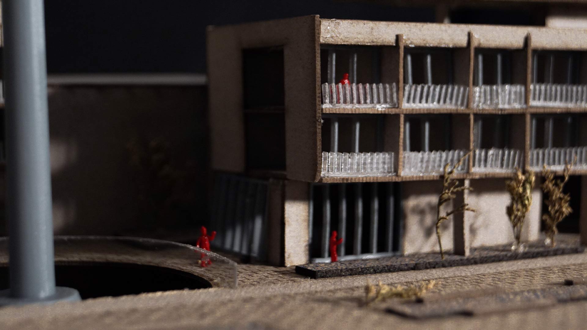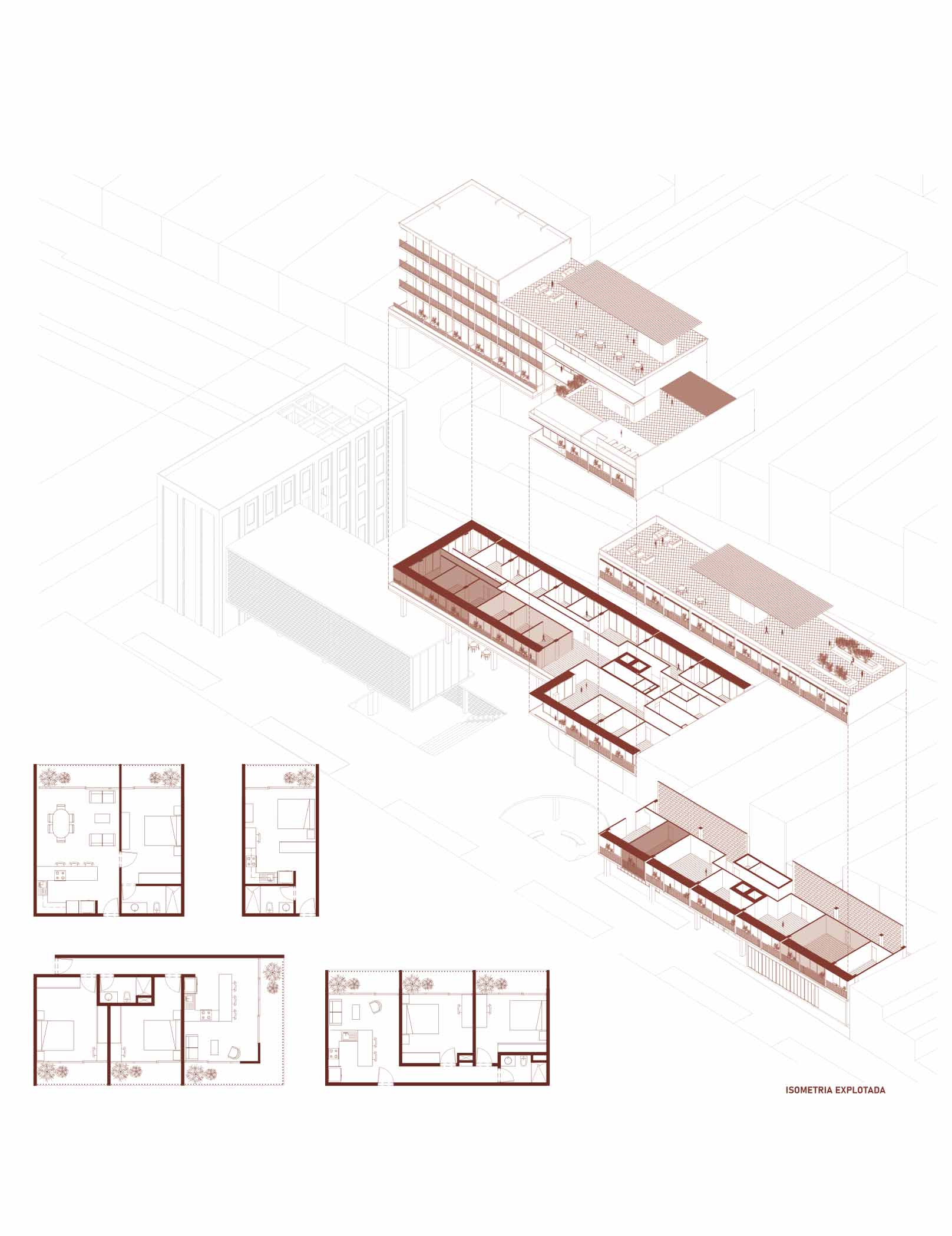 El diseño se organiza en torno a tres componentes principales: viviendas, talleres y la galería. El edificio de viviendas incluye departamentos de dos y tres dormitorios, áreas comunes como coworking, piscina y lavanderías; mientras que un segundo edificio más pequeño ofrece estudios privados. En el sótano, se ubican espacios compartidos, como gimnasio, salas de reuniones y juegos, integrados mediante un vacío circular que enmarca la preexistente chimenea.