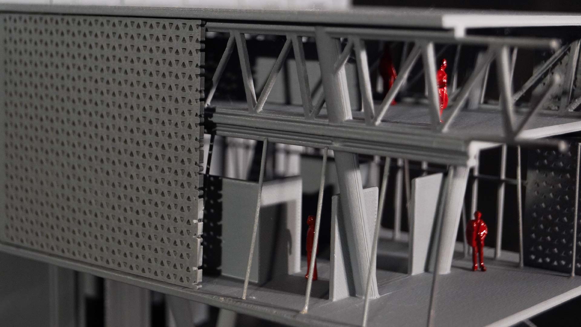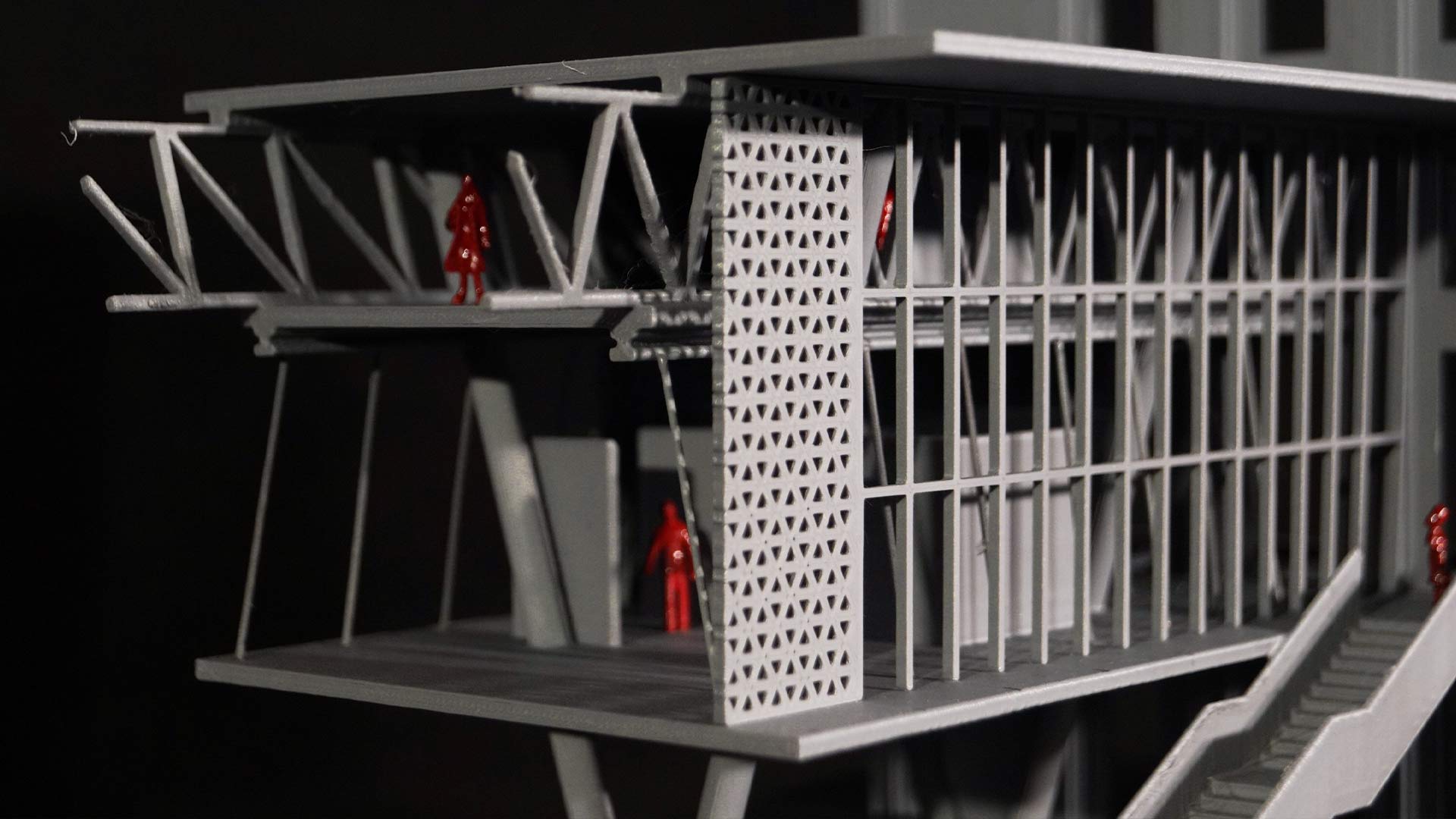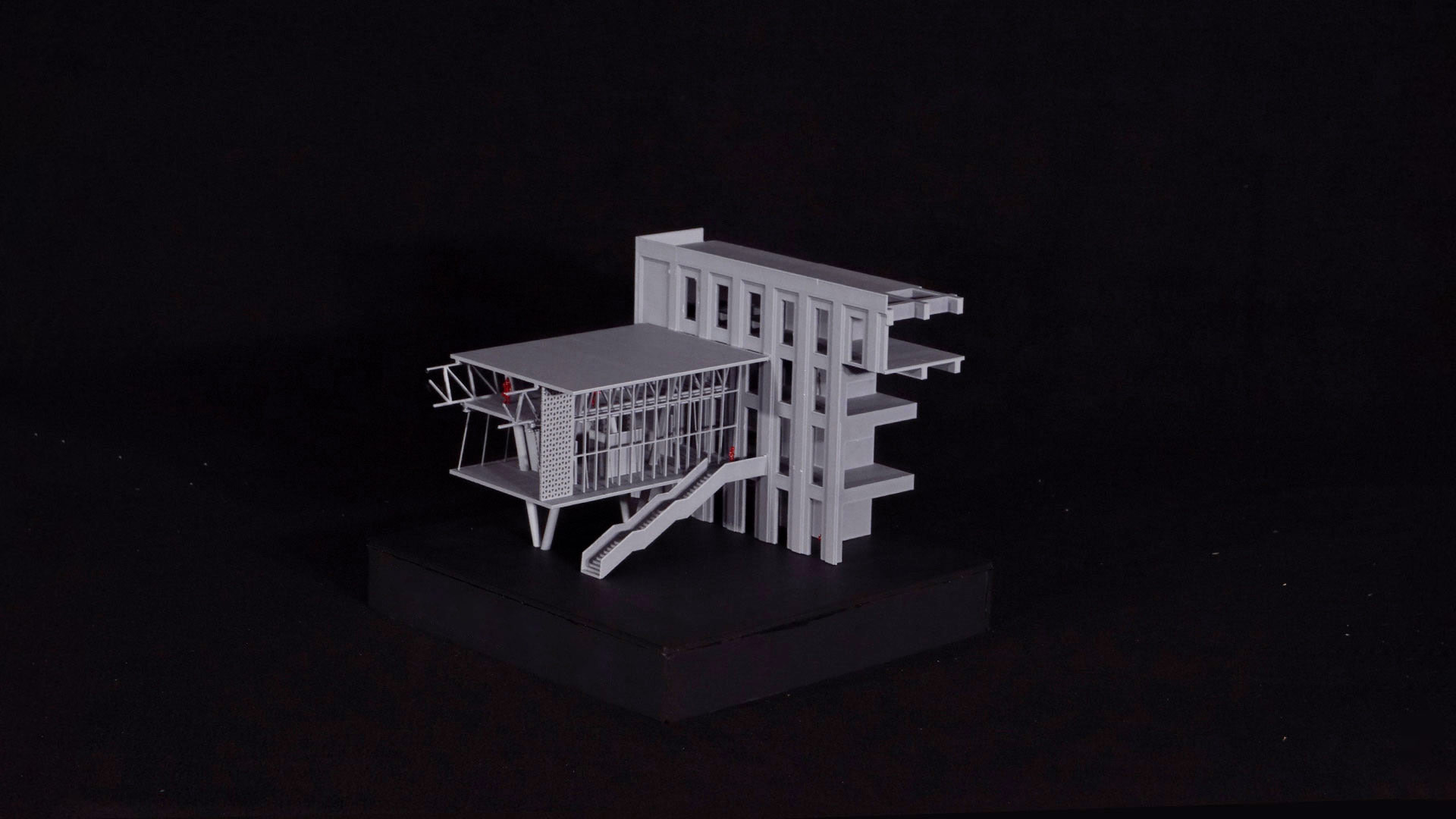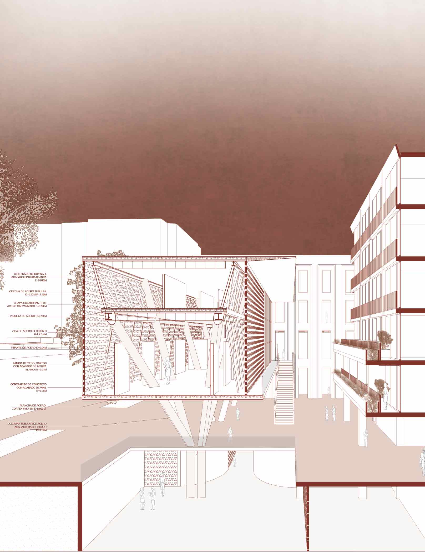 La galería, un volumen contemporáneo en acero corten, contrasta con la fábrica histórica y utiliza una estructura ligera que libera el espacio público. La planta baja incluye bares, restaurantes y una tienda de arte, que activan la plaza de día y noche. Este proyecto híbrido combina restauración patrimonial, diseño contemporáneo y actividades diversas, de modo que fomenta la convivencia comunitaria y expresión artística en el corazón del Callao.
