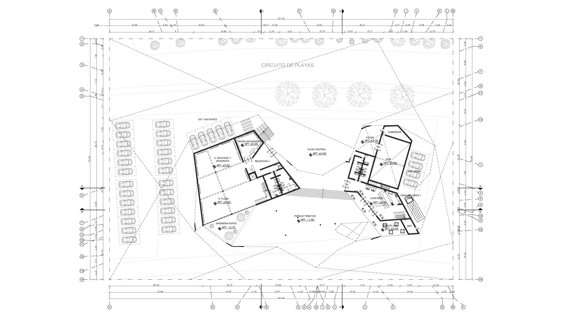 El proyecto organiza el flujo permanente al parque temático, el acceso al complejo en horario restringido y separa el recorrido del personal de servicios generales y abastecimiento a ambientes interiores como la cafetería.