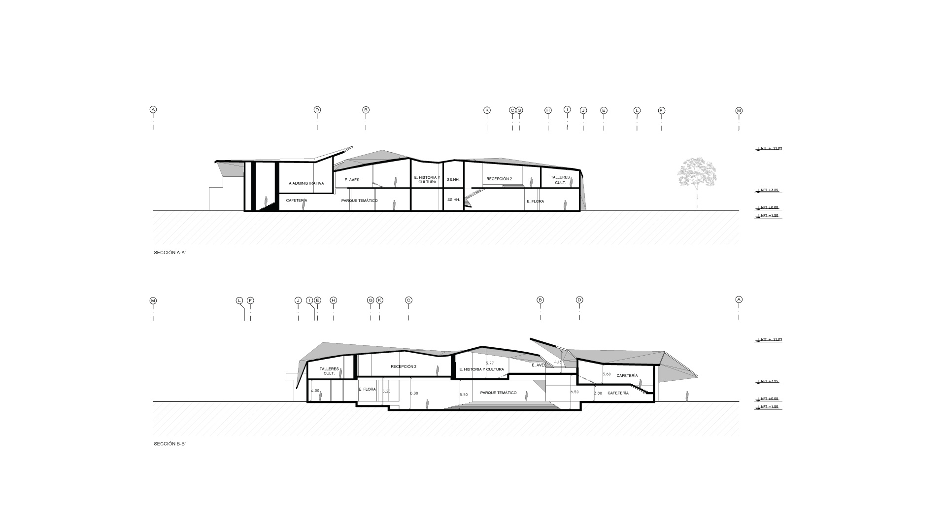 La cobertura y fachada del proyecto, hechos de perfiles metálicos y paneles, además de proteger los ambientes interiores de la brisa y el clima, proveen distintas permeabilidades que cuidan la relación entre los espacios interiores y el parque exterior.