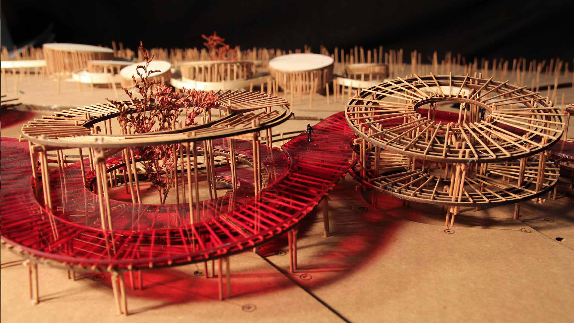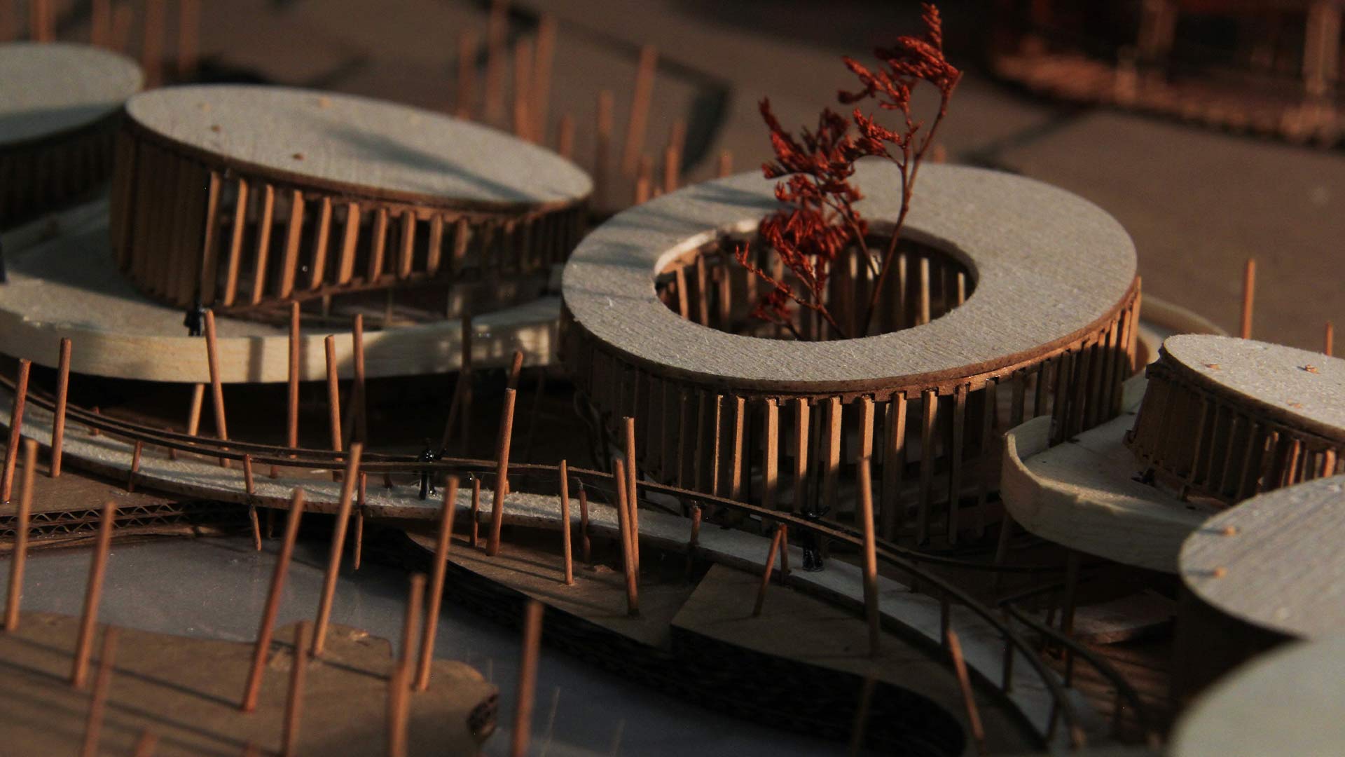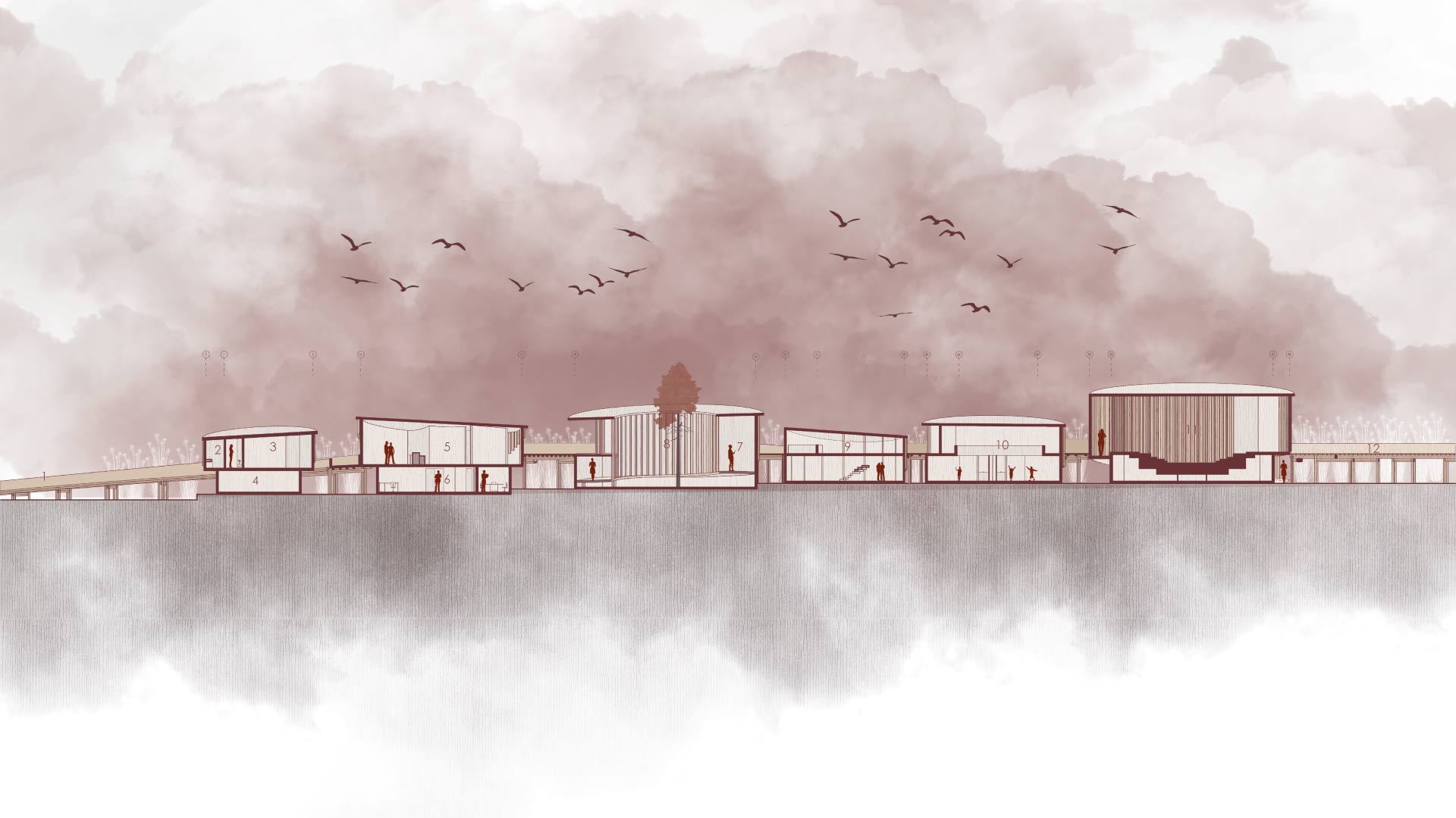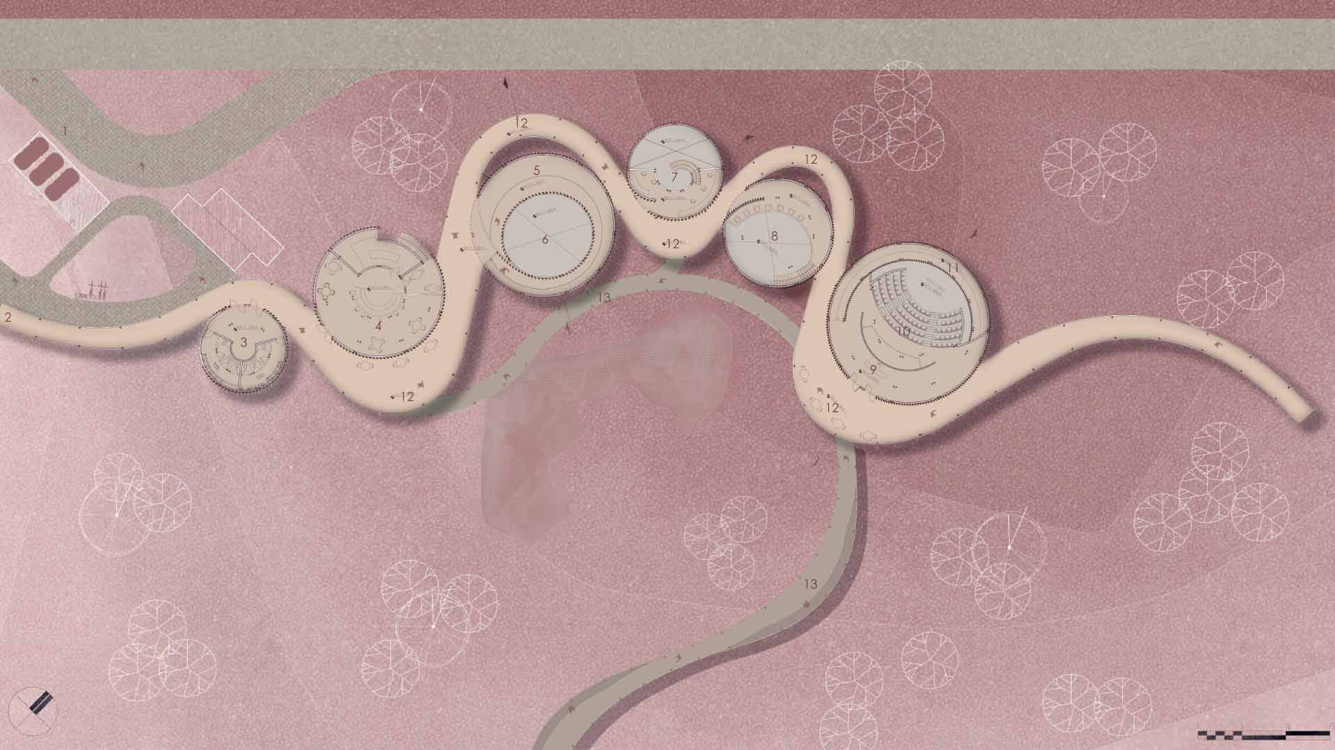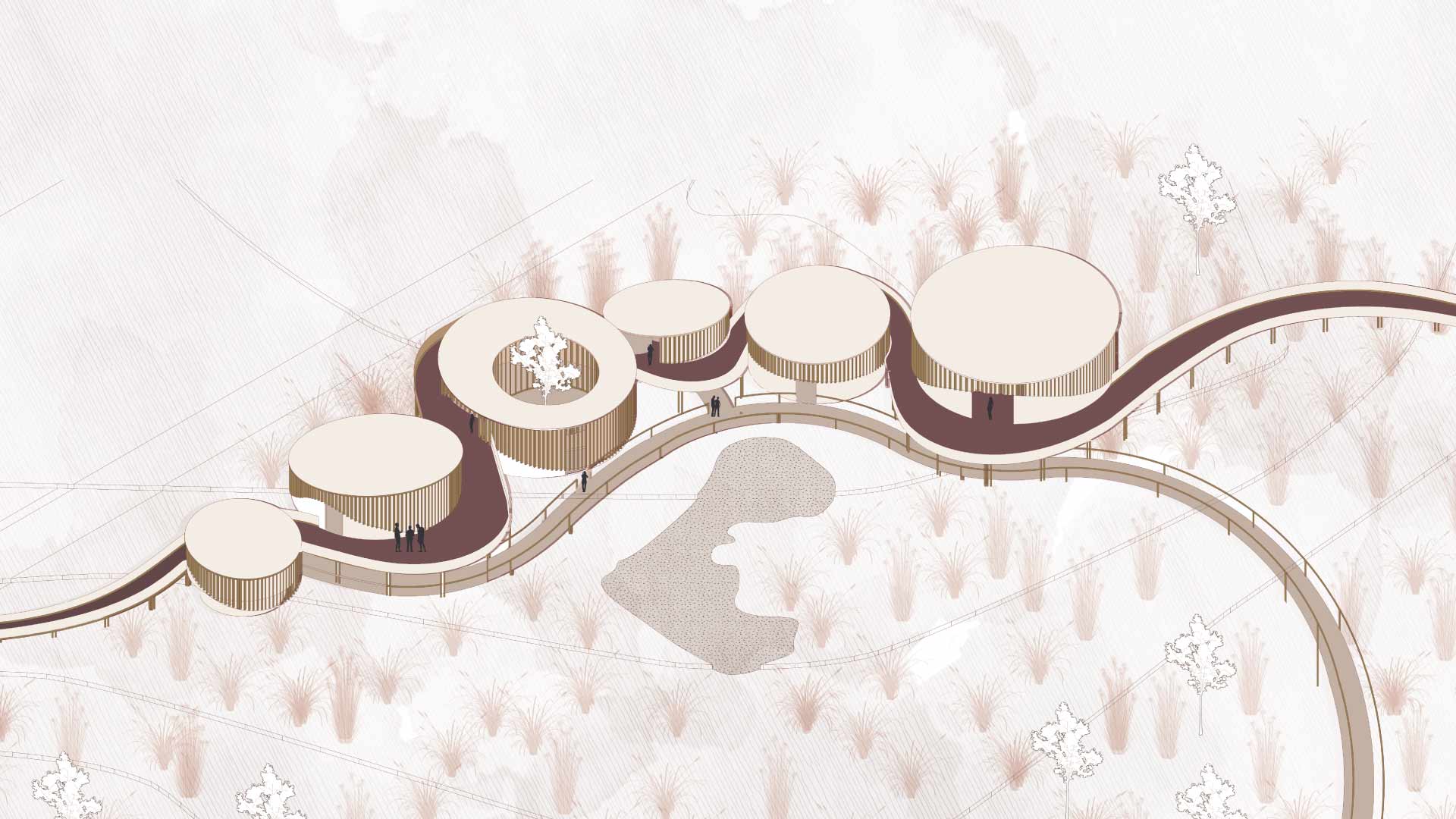 El proyecto está compuesto por seis volúmenes independientes, conectados por una pasarela continua que garantiza una relación directa con el entorno natural durante todo el recorrido. Cada volumen permite la entrada de luz difusa; además, crea una transición suave de luz y sombra al interior, que genera un ambiente acogedor y natural.