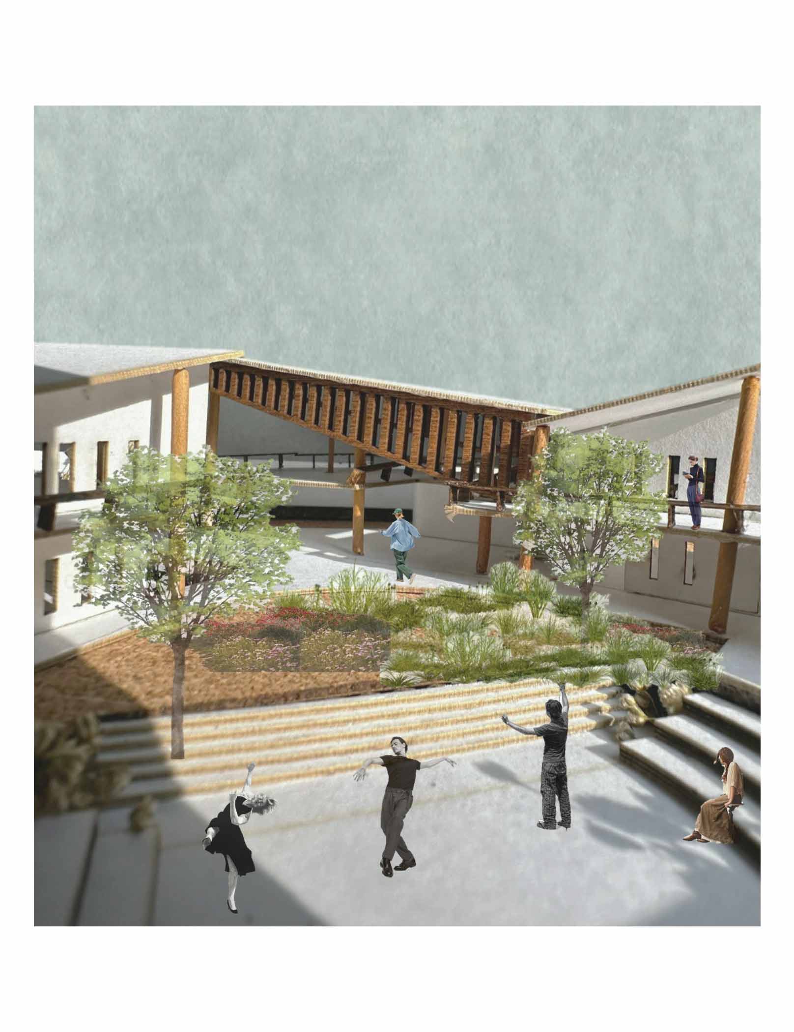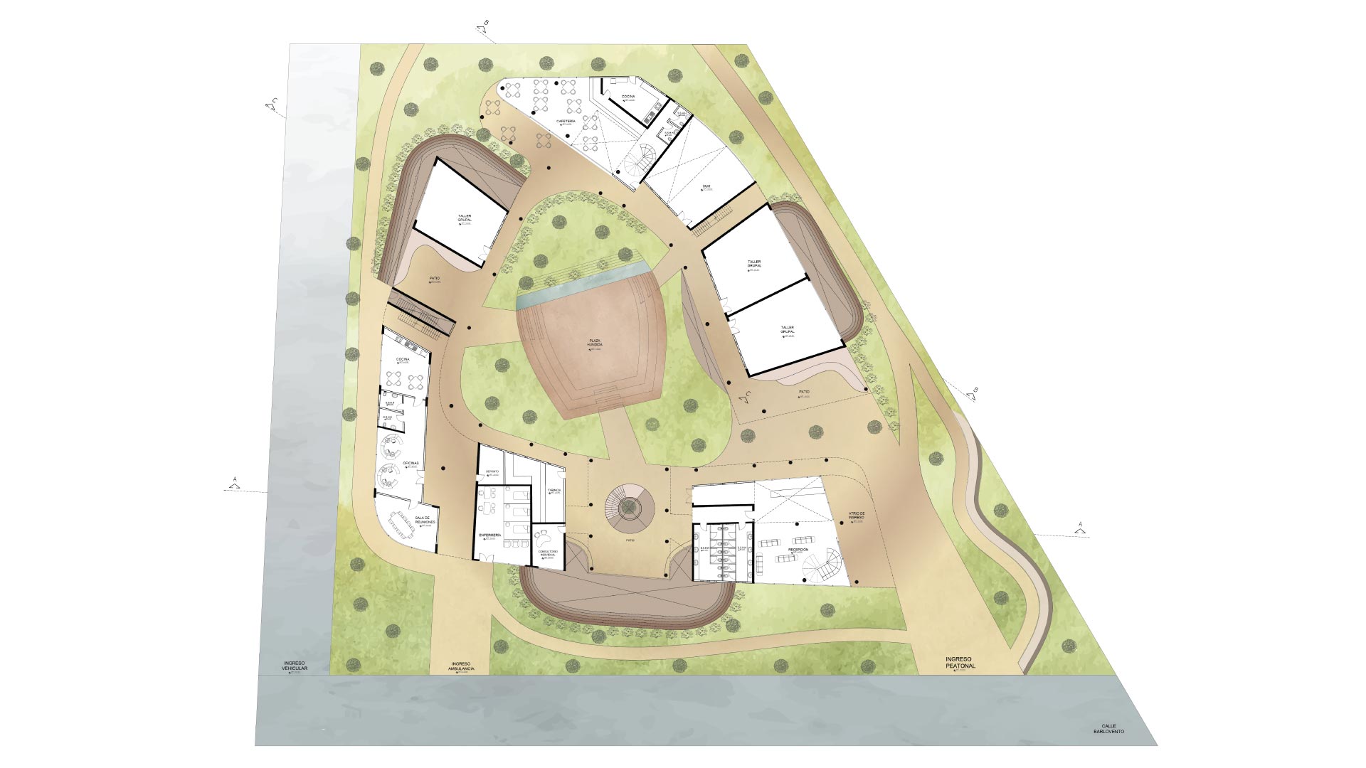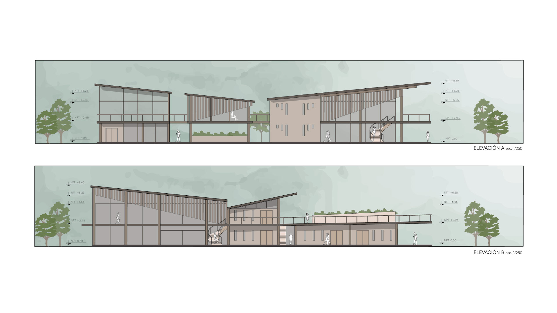 Además, se plantearon tres niveles: una planta hundida en la que se ubicaron talleres grupales, consultorios individuales y zona de mantenimiento para generar privacidad; una primera planta en la que se trabajaron las circulaciones diferenciadas, los espacios públicos y las zonas de estar (espacios jerárquicos como la recepción, el SUM y la cafetería, los cuales tienen dobles alturas que los relacionan con las terrazas del segundo nivel y otros talleres grupales que aprovechan las visuales del mar y los humedales de villa).