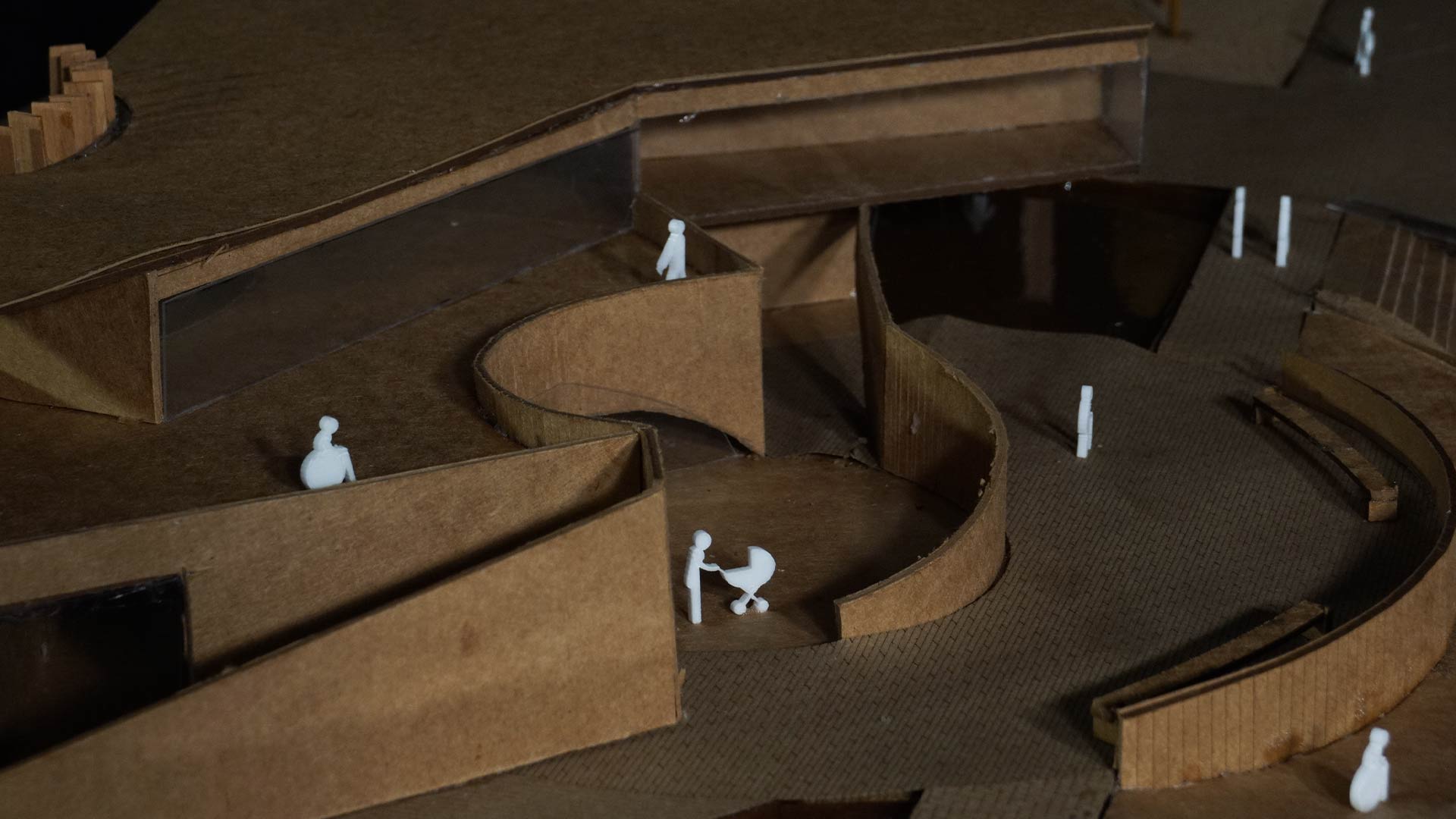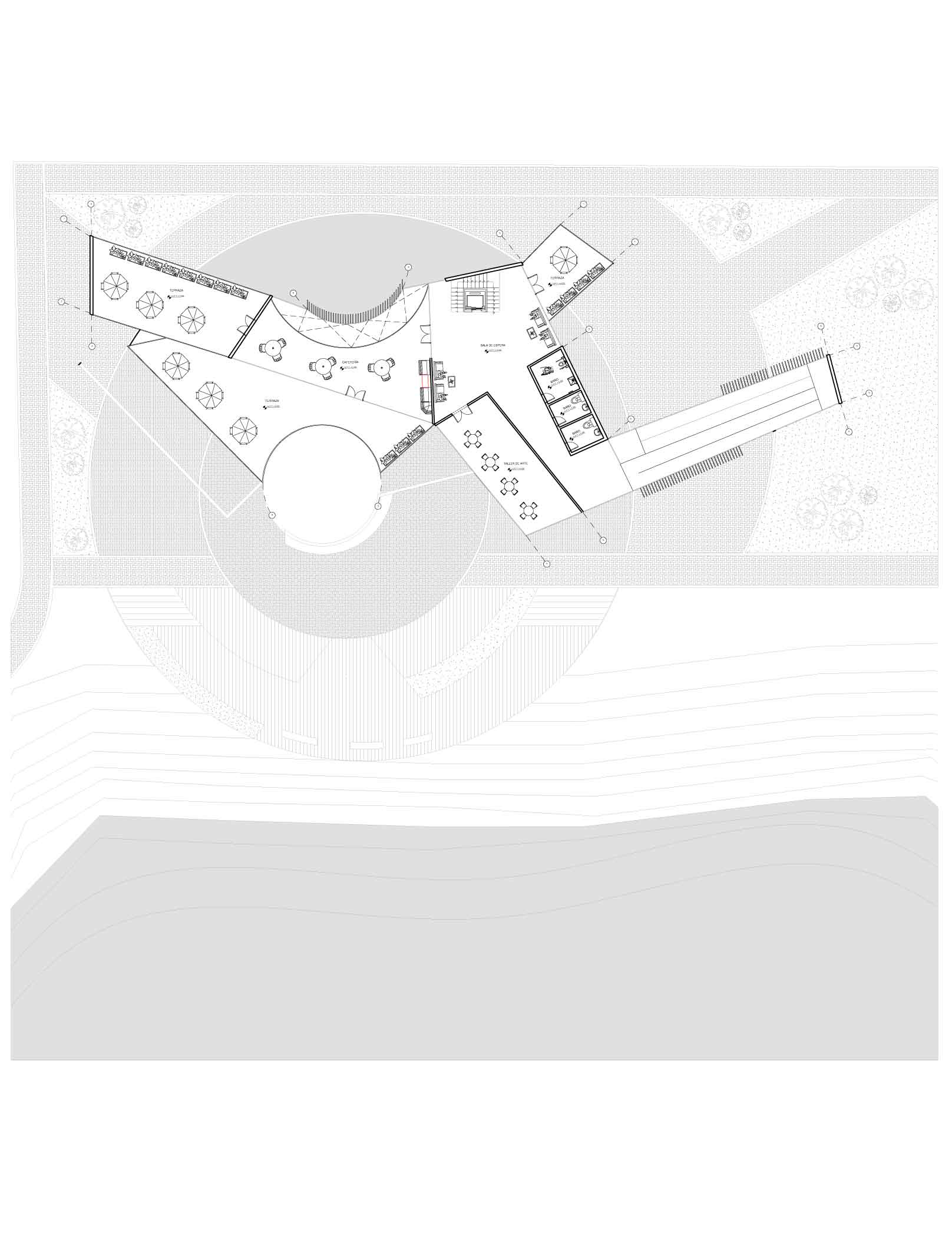 Otro aspecto destacado es la rampa doble, cuyo tamaño imponente atrae la atención. Esta rampa se complementa con caminos diferenciados mediante el uso de texturas diversas, lo que facilita la circulación de las personas y permite una clara delimitación de los espacios. En conjunto, estos elementos refuerzan el carácter funcional y estético del proyecto.