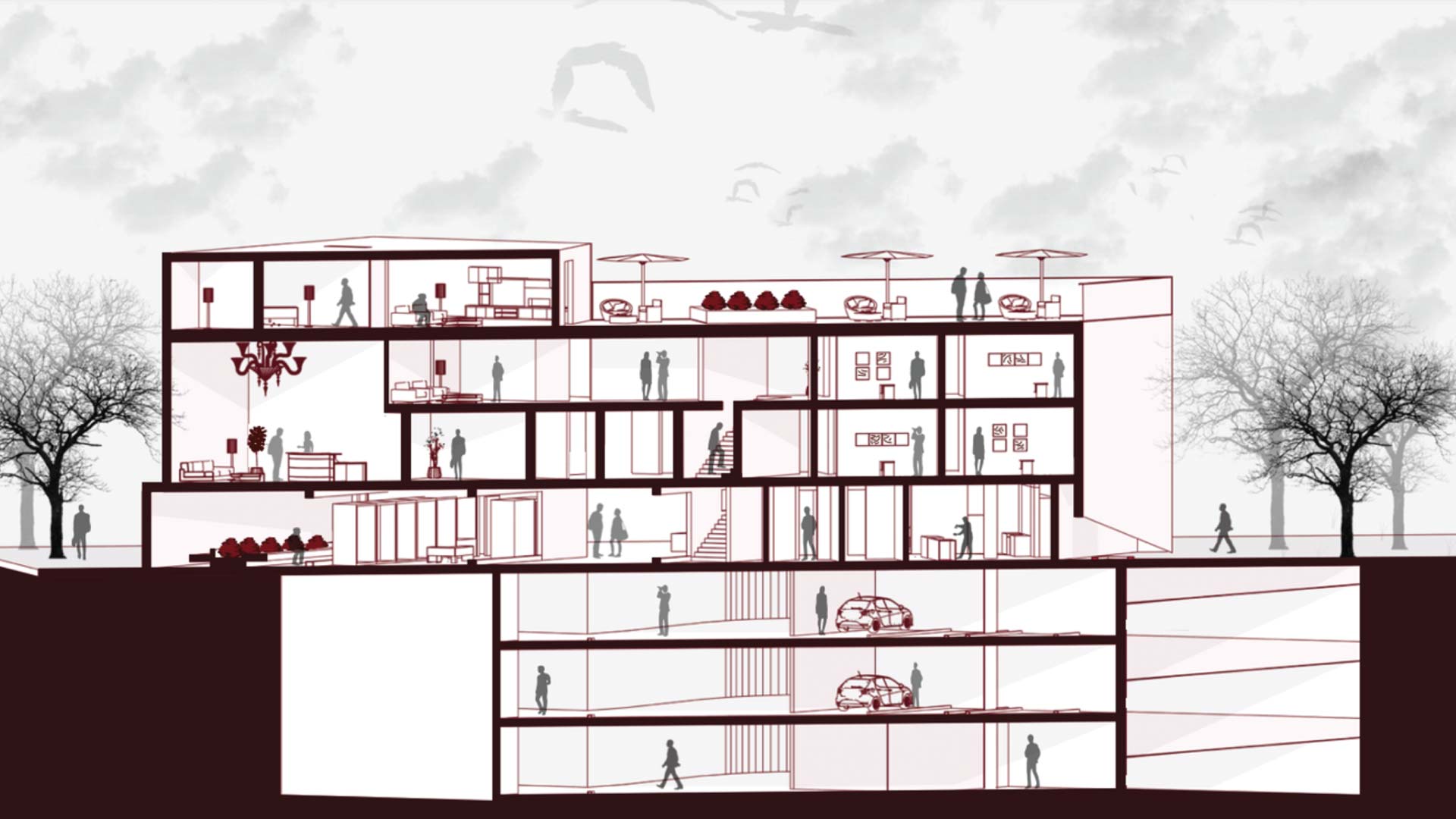 Por ello, se escogió el uso de celosías para la fachada de esta parte del edificio donde se encuentra la entrada que conecta a este puente, para visualmente resaltarlo como el espacio jerárquico del proyecto. Por otro lado, el proyecto cuenta con 2 plazas exteriores, un estacionamiento para bicicletas, un patio interior y una terraza que fomentan las interacciones sociales en el edificio. Por último, el proyecto cuenta con 3 estacionamientos subterráneos con una capacidad de 57 autos.