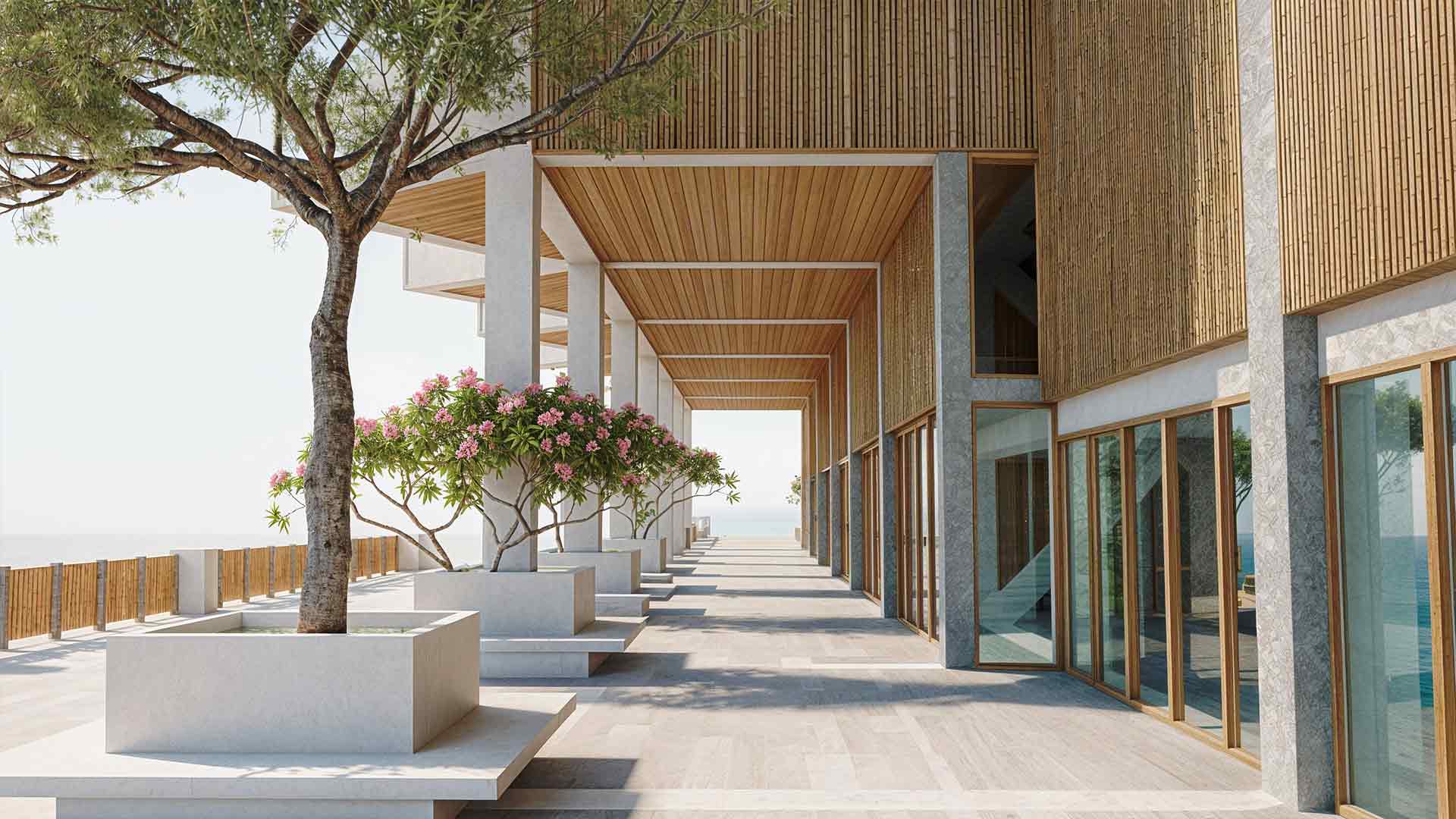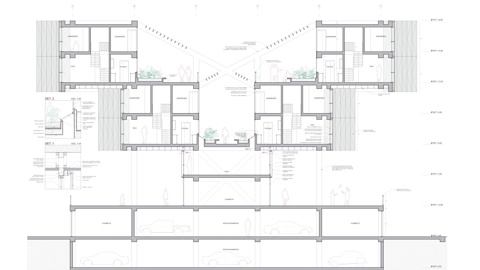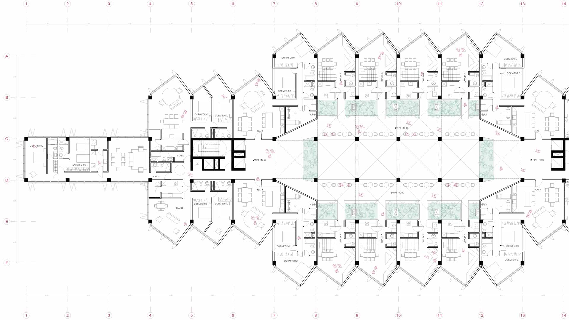 La fachada combina celosías de carrizo y muros de concreto diagonales, que ofrecen una estética cálida y resistente al clima costero. Este proyecto no se limita a ofrecer viviendas, sino que propone una nueva manera de habitar, donde los límites entre lo público y lo privado se desdibujan, y la arquitectura se convierte en un catalizador de conexiones y experiencias compartidas.