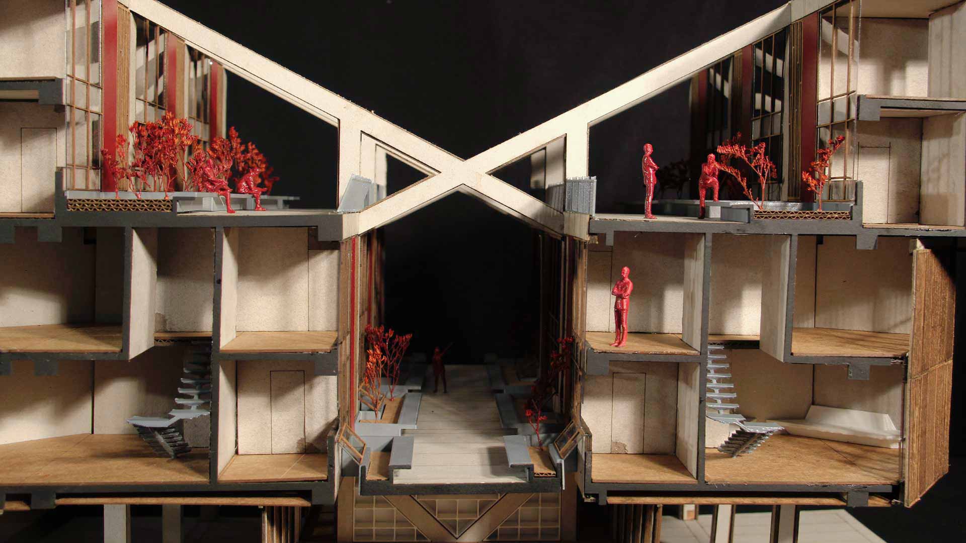 El diseño es la reinterpretación de huacas de la cultura Chancay; se vuelve una huaca moderna. Una pirámide invertida, formada por bloques residenciales, se abre hacia patios interiores que generan luz, ventilación cruzada y áreas verdes para los residentes. Estos vacíos internos no solo resuelven desafíos funcionales, sino que reimaginan cómo las viviendas pueden ser espacios de interacción y comunidad.