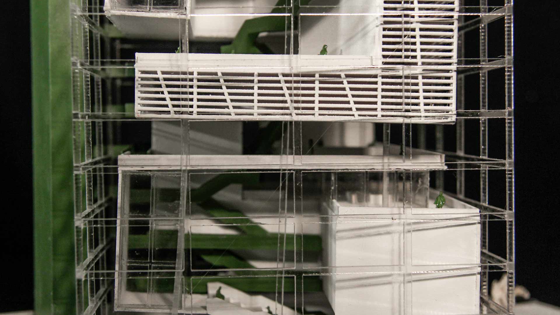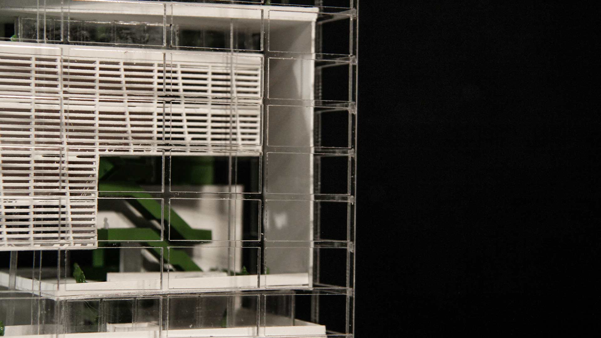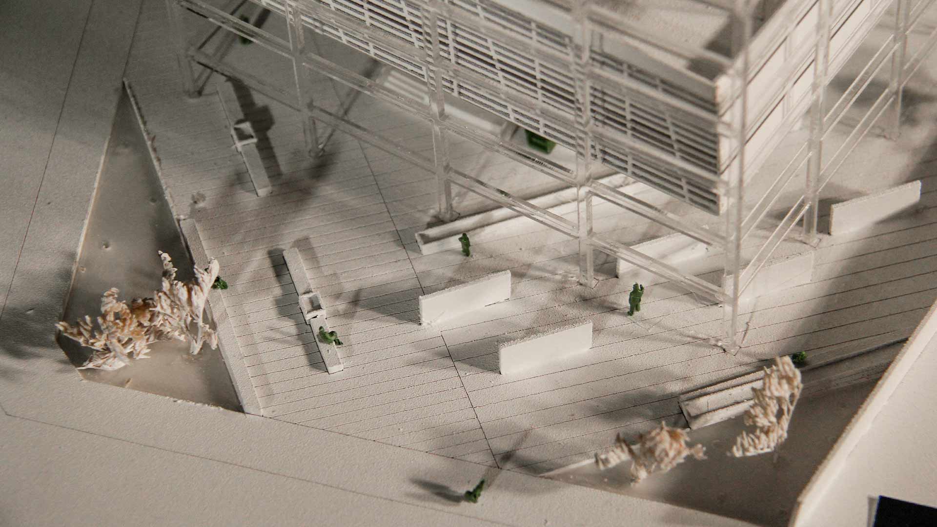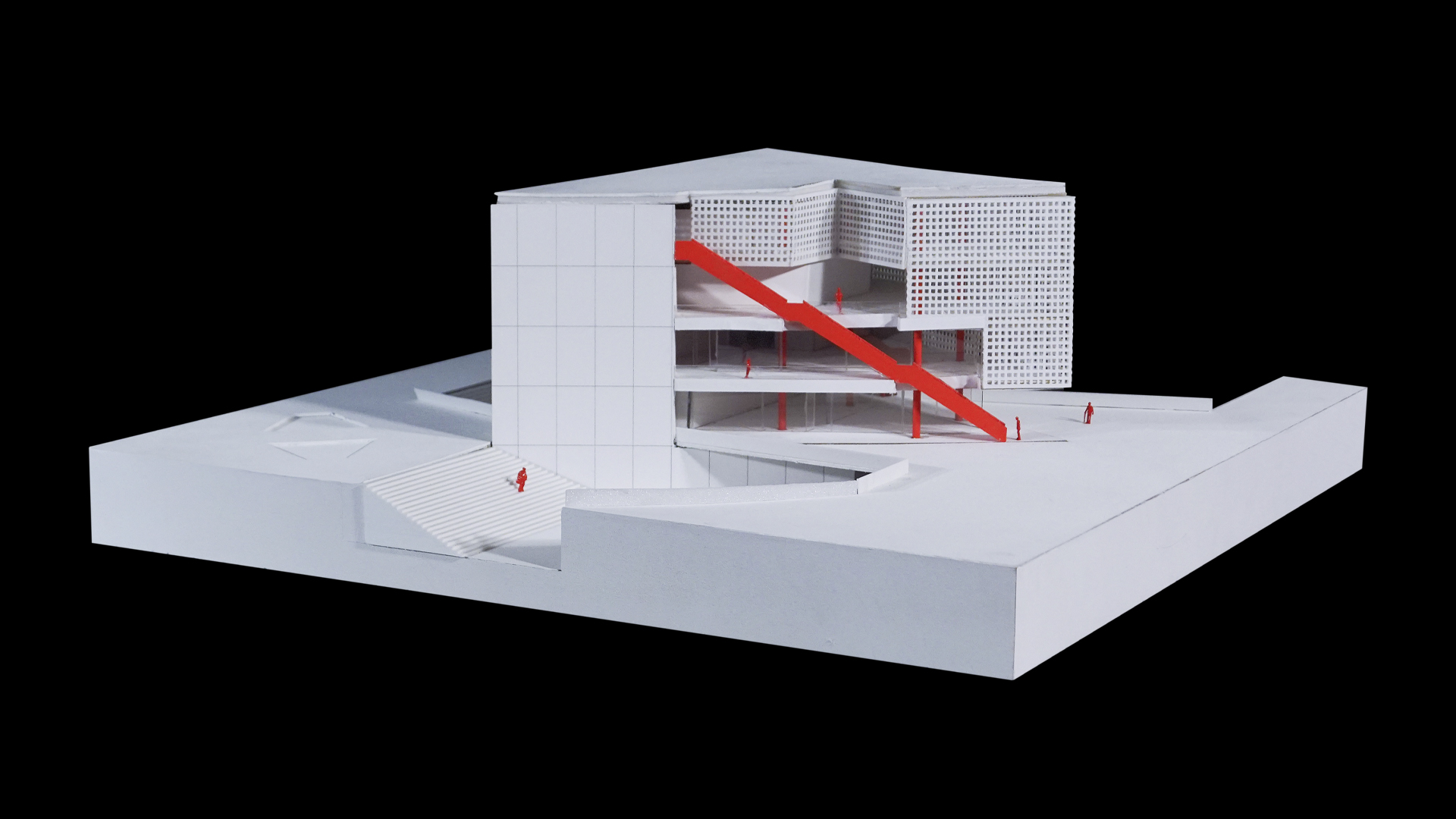 Además, se utilizaron tres tipos de envolventes: mamparas de vidrio, celosía y muro de concreto. La celosía fue el elemento predominante, que sigue el lenguaje de los volúmenes y mantiene la idea de la cinta continua.