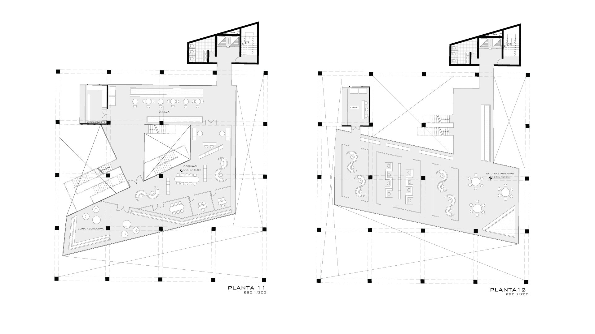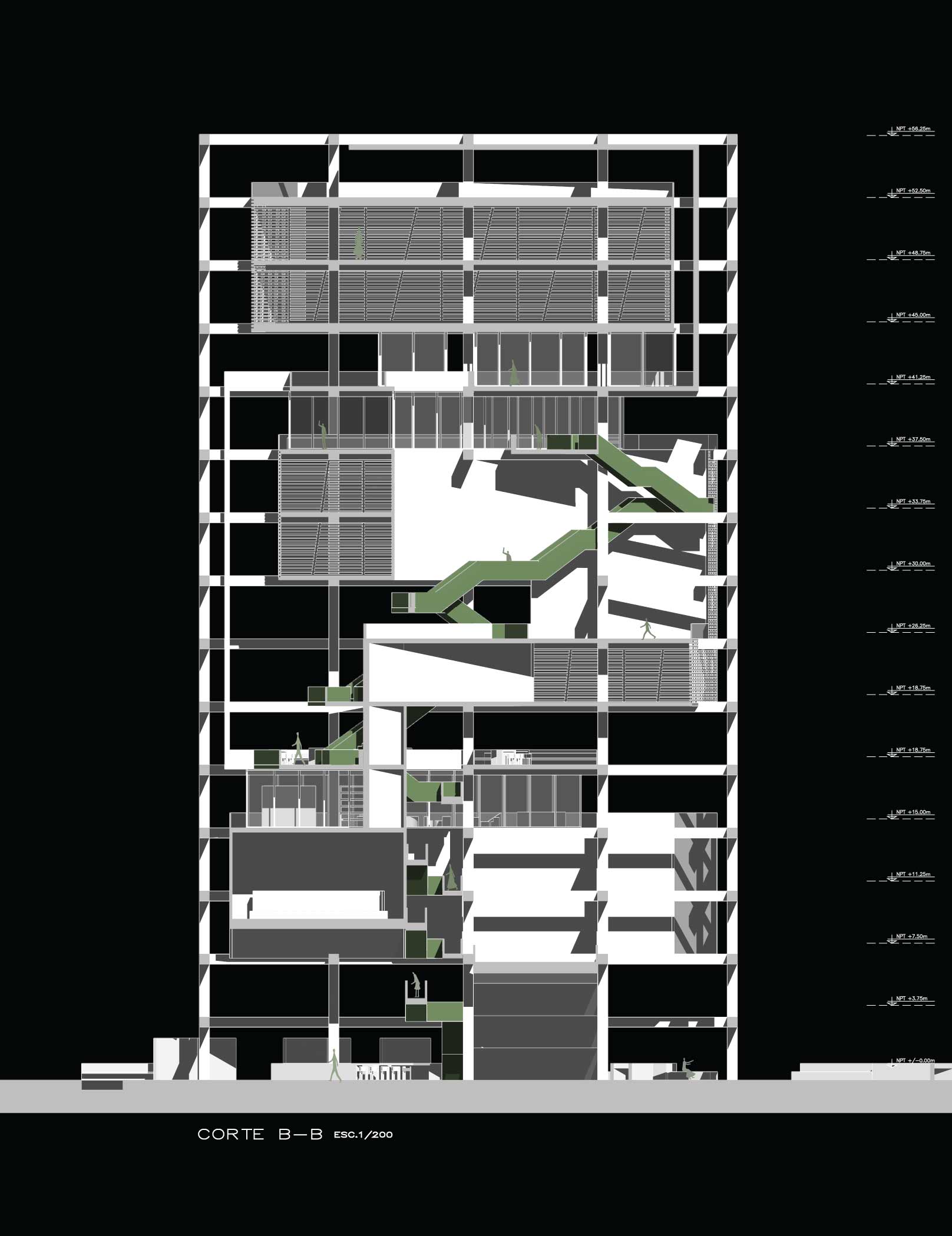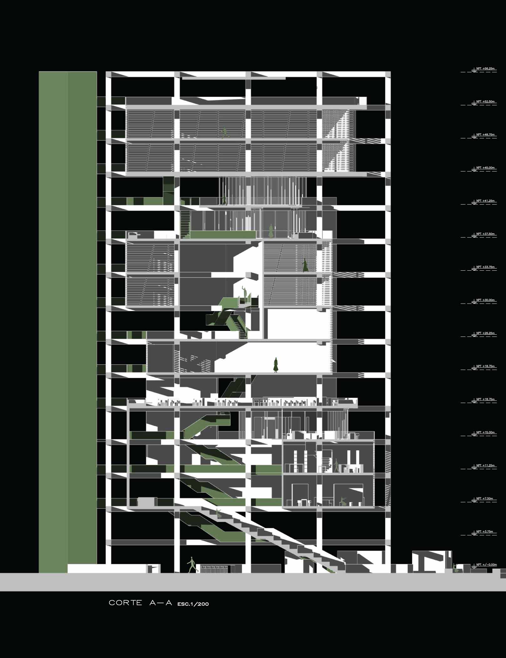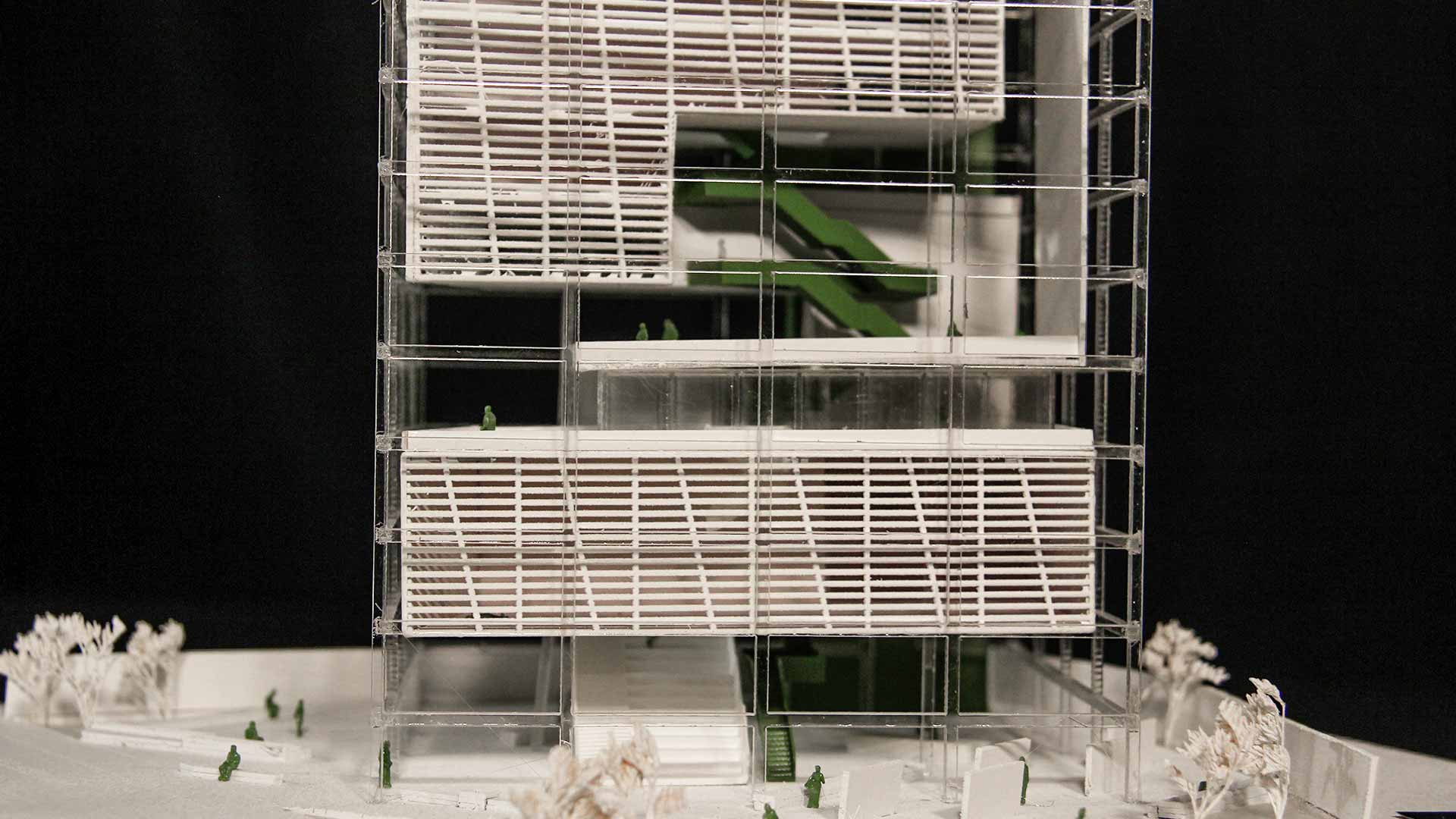 Cada volumen presenta un quiebre diagonal, el cual está acompañado por la escalera principal. El objetivo de esta escalera es crear un recorrido independiente que permita la conexión y circulación entre todos los espacios del programa.