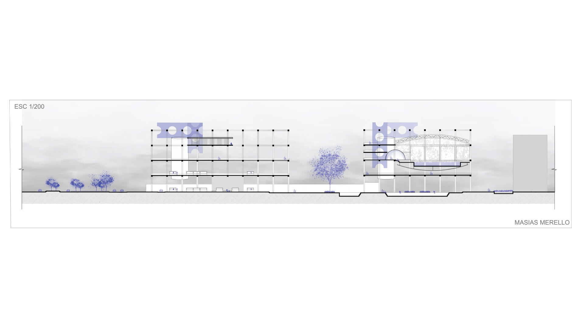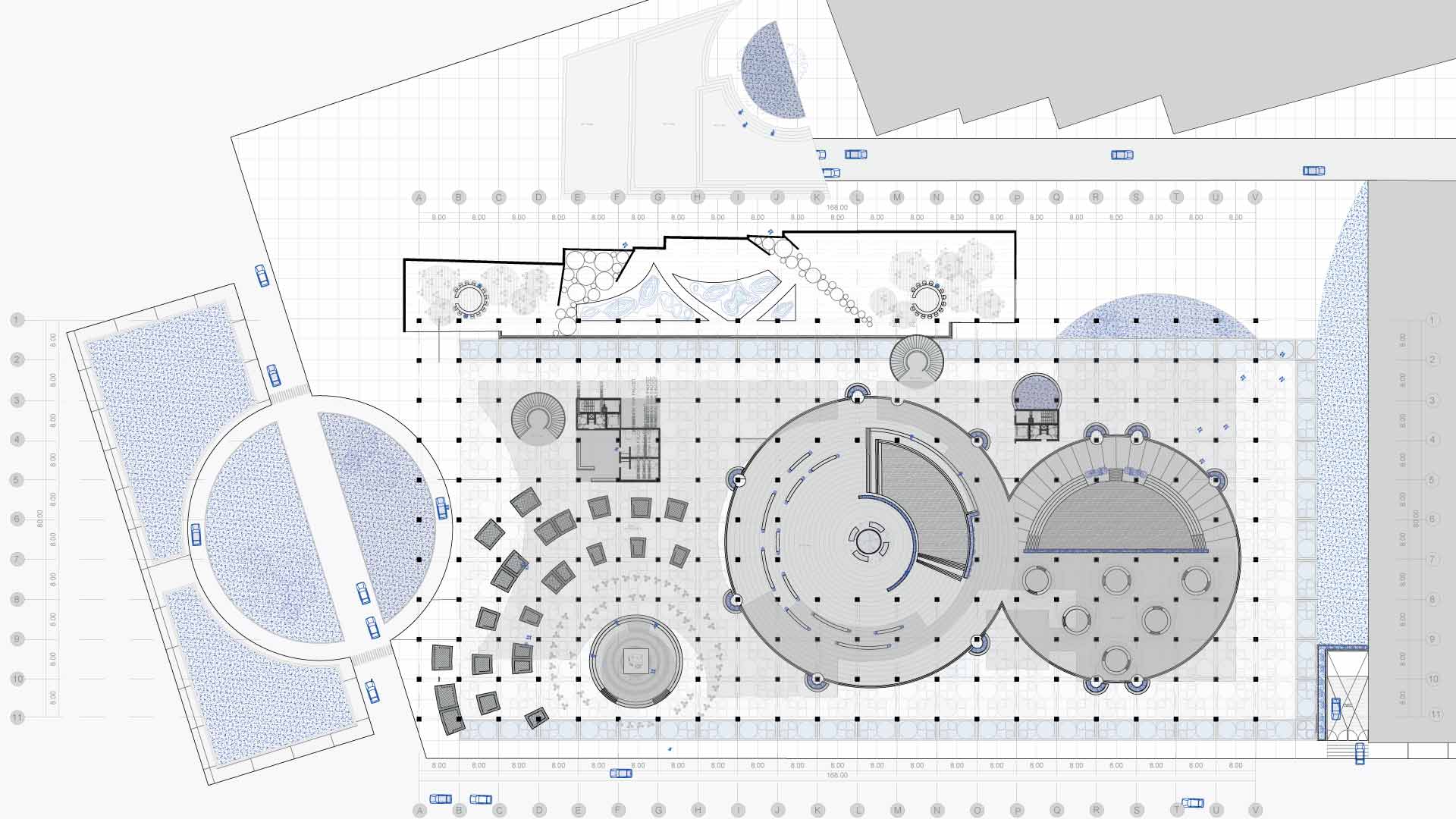 "La estructura de grilla, de forma ortogonal, contrasta con los elementos curvos que flotan sobre ella"