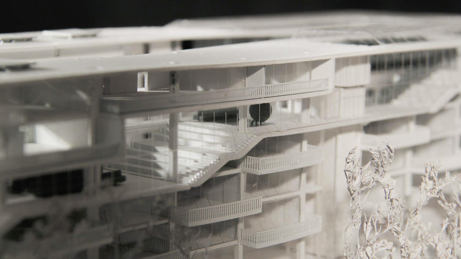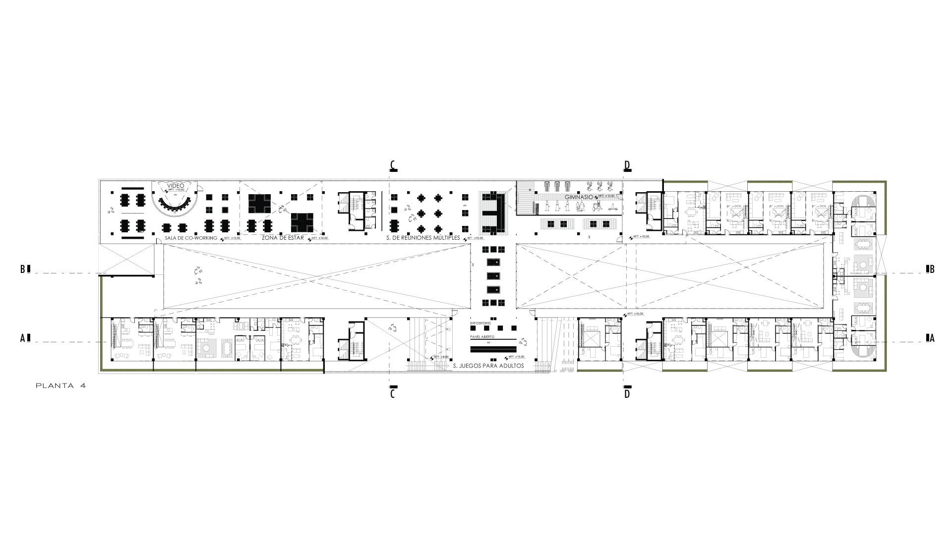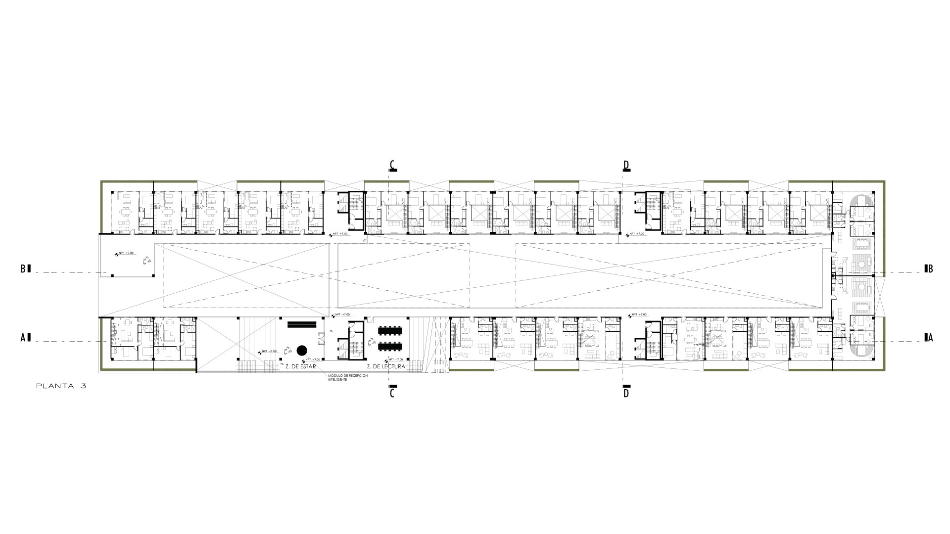 La resolución formal del proyecto incorpora espacios flexibles, de modo que eliminar muros y tabiquerías tradicionales. En su lugar, los núcleos de circulación vertical funcionan estratégicamente como separadores hacia ambientes más ruidosos, mientras que las transiciones espaciales se logran mediante mobiliario diseñado para crear espacios de estar. Este enfoque impulsa la vida social al reinterpretar las dinámicas del espacio público dentro del edificio.