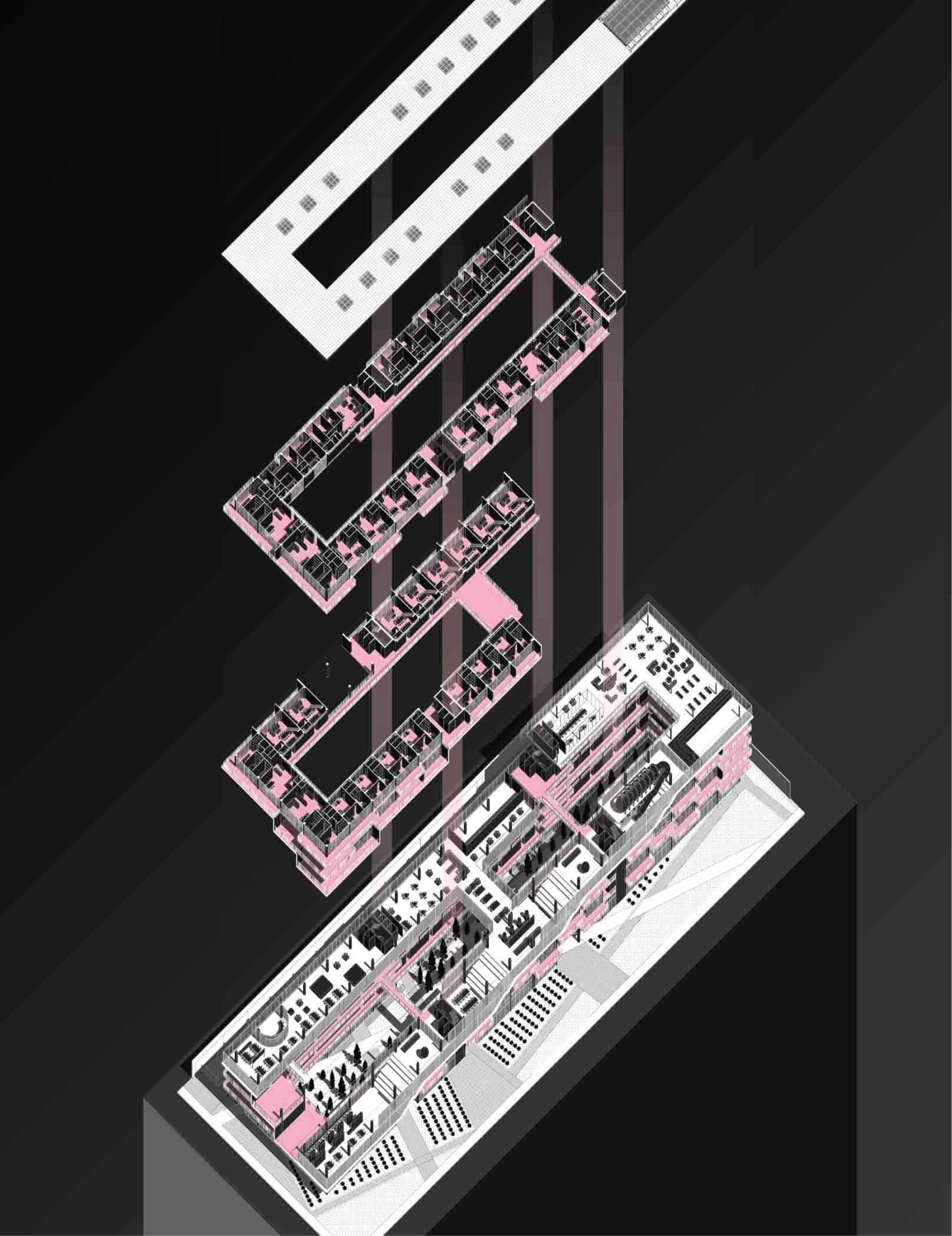 El proyecto se plantea con la premisa de qué haré para definir la creación de espacios que faciliten el encuentro entre los habitantes y fortalecer los vínculos sociales. Este objetivo se desarrolla con base en lo que ocurre en el espacio público fuera del edificio privado, como las interacciones en vías, veredas, parques y edificaciones públicas. A partir de ello, el concepto se materializa en una reinterpretación inversa del diagrama de Nolli, donde los vacíos se conciben como llenos (espacios comunes) y los llenos como vacíos (departamentos). De esta manera, se logra una plataforma que unifica todos los espacios.