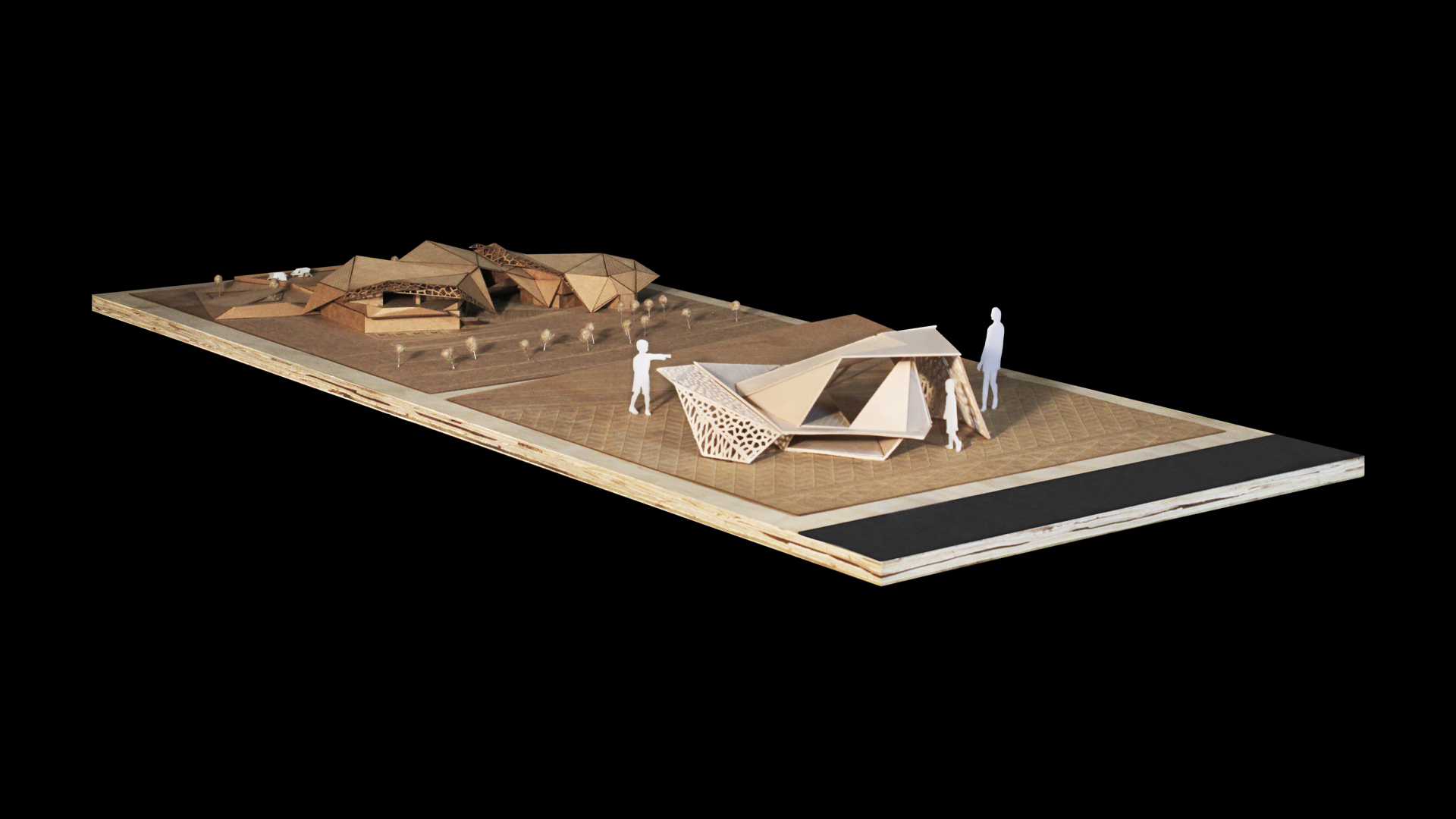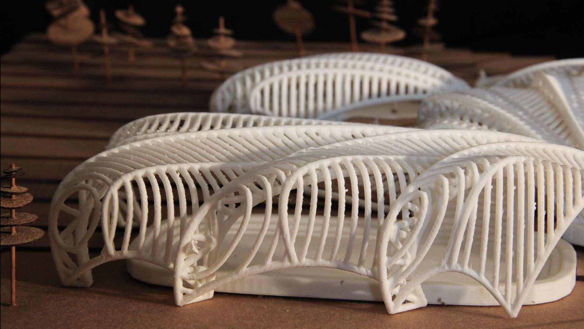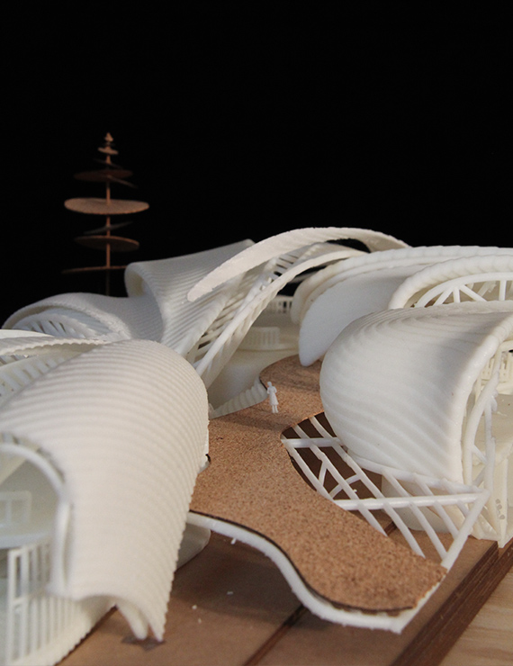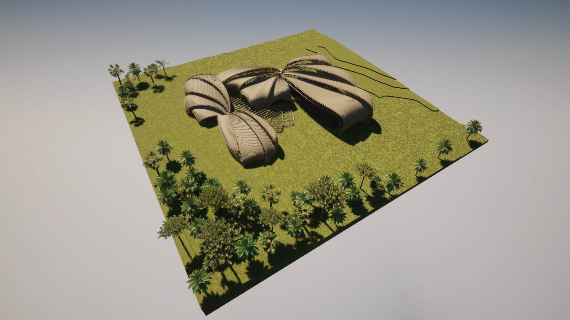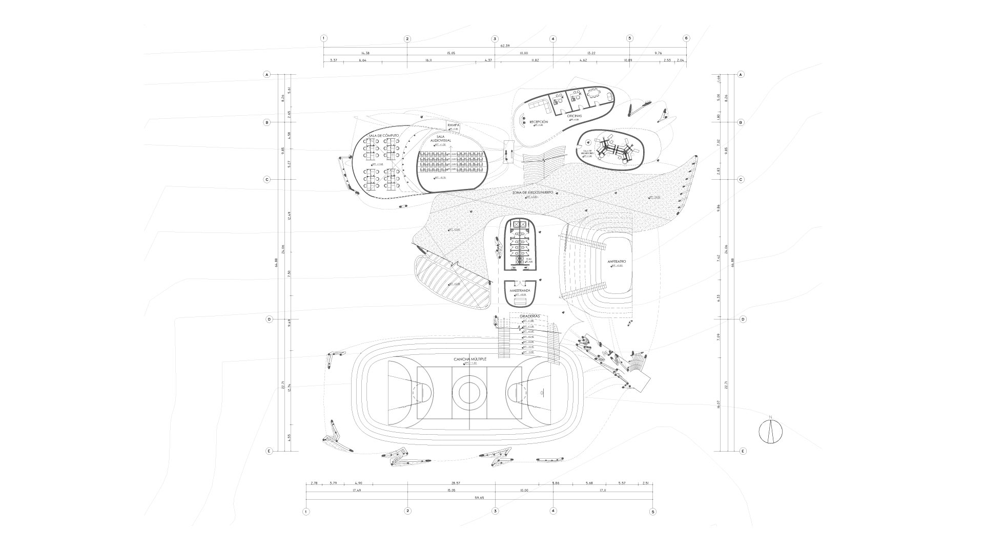 Para cumplir con las grandes luces que el programa y los tipos de espacios asignados requerían, se usó una estructura principal a base de cerchas. Su disposición radial ayudó a reforzar las líneas orgánicas que busca el proyecto; así, logra que la estructura se manifieste como el elemento principal para la concepción de la forma y el espacio.