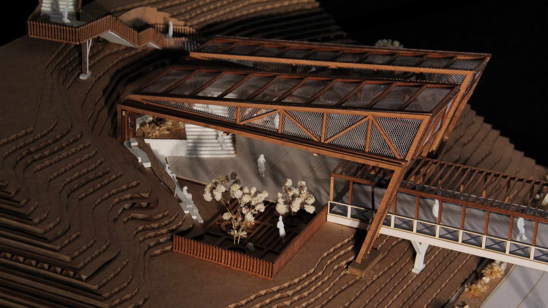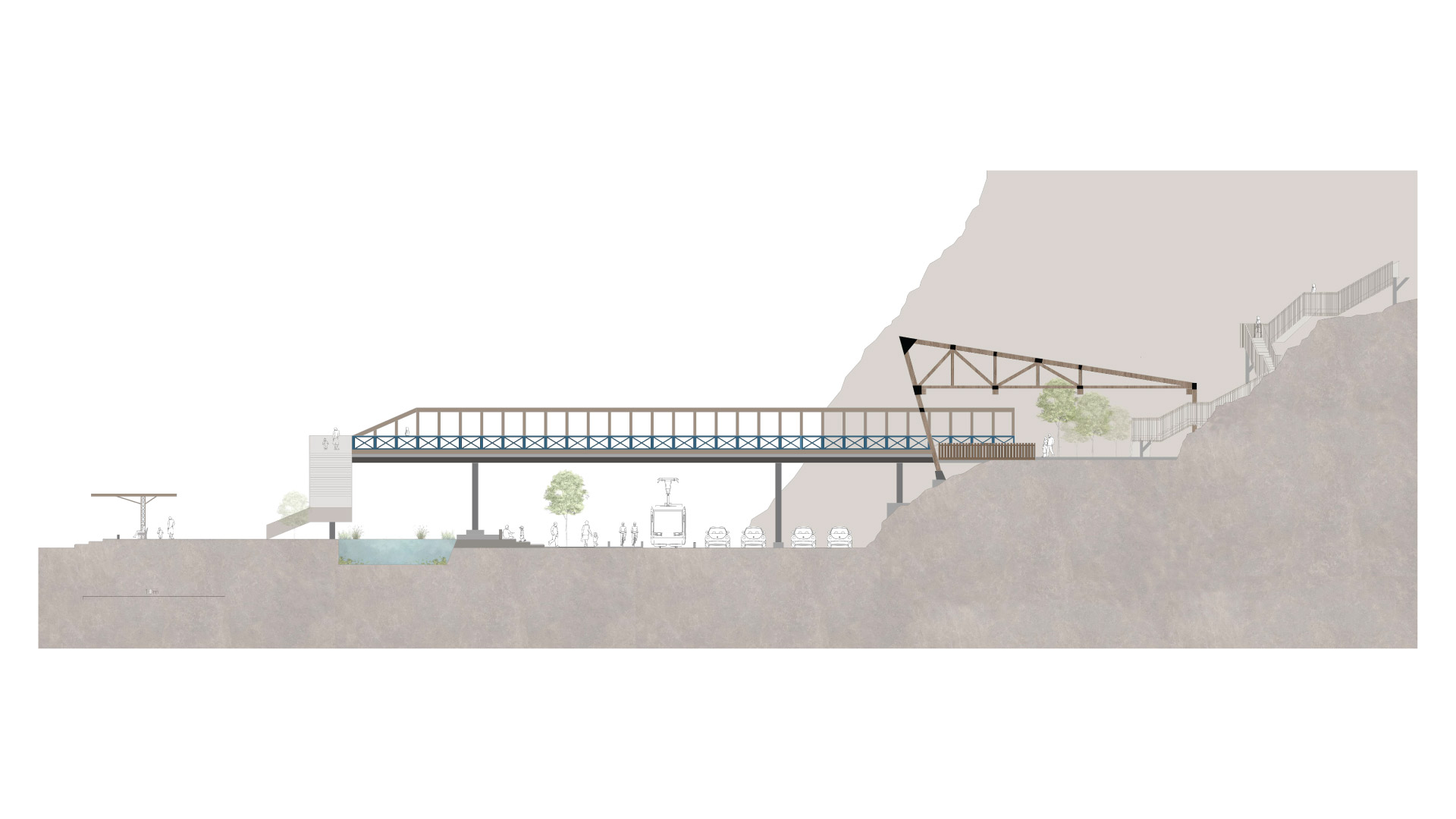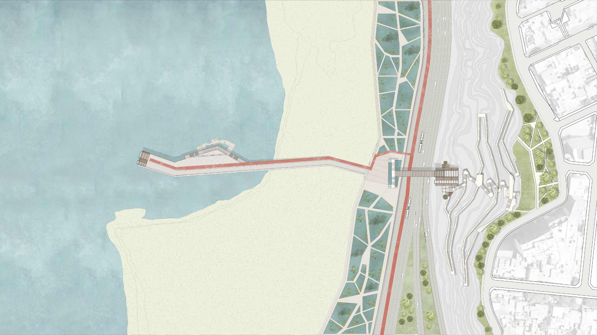 Ubicado a una altura intermedia, el edificio crea una sutura urbana entre mar y ciudad. Hacia el mar, se extiende como un puente peatonal sobre un parque inundable, que desciende hacia el muelle. En dirección opuesta, asciende por escaleras y rampas hacia la cima del acantilado, y se integra con la plaza y las áreas verdes que inician el recorrido.