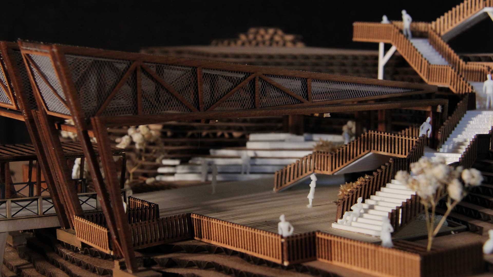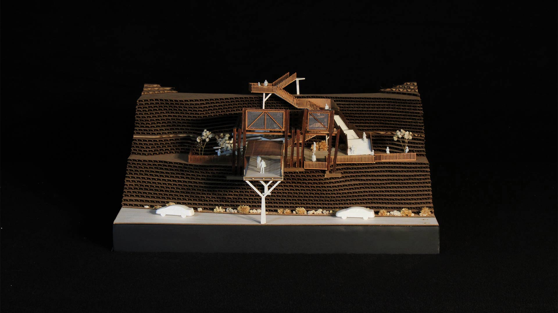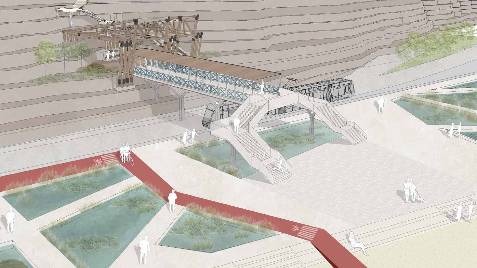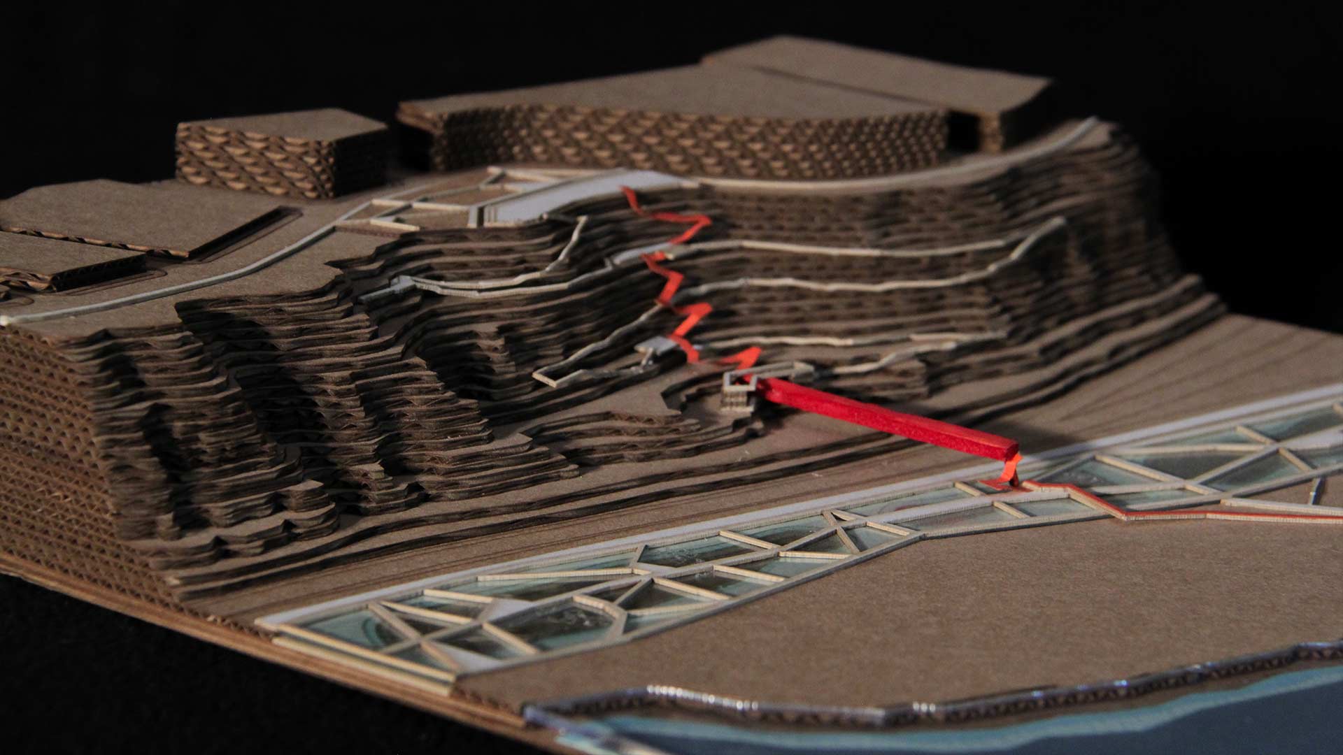 Ubicado a una altura intermedia, el edificio crea una sutura urbana entre mar y ciudad. Hacia el mar, se extiende como un puente peatonal sobre un parque inundable, que desciende hacia el muelle. En dirección opuesta, asciende por escaleras y rampas hacia la cima del acantilado, y se integra con la plaza y las áreas verdes que inician el recorrido.