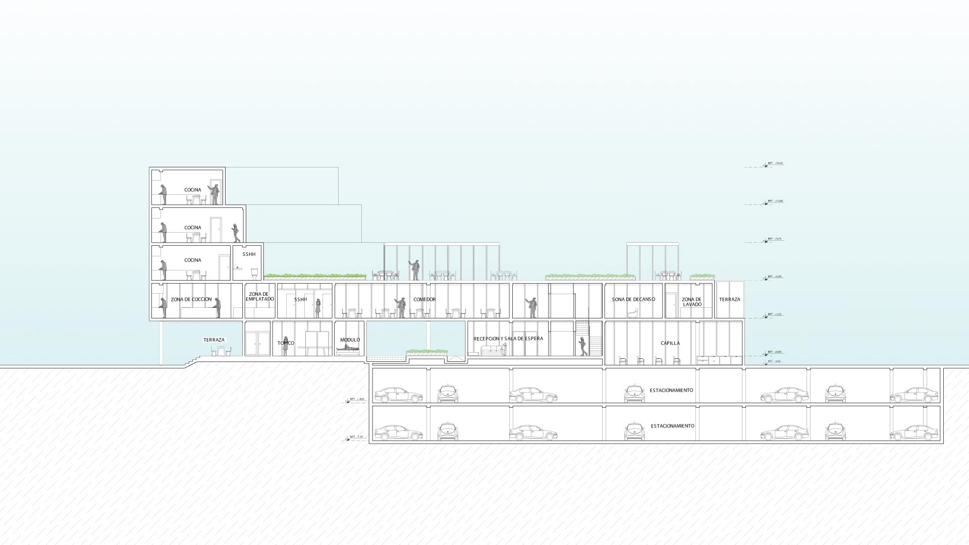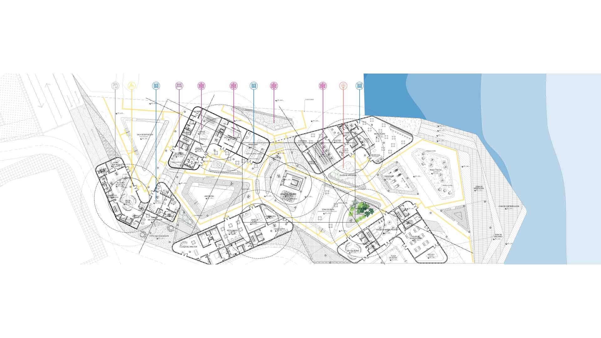 El espacio público en el primer piso busca la conexión entre los vecinos de la zona, y en pisos superiores, la interacción entre los habitantes para reforzar el sentido de comunidad. Se usan estrategias sensoriales que diferencien las zonas olfativa, auditiva y perceptualmente. También, se coloca vegetación para conectar con la naturaleza y se le da vital importancia a la relación con el mar.