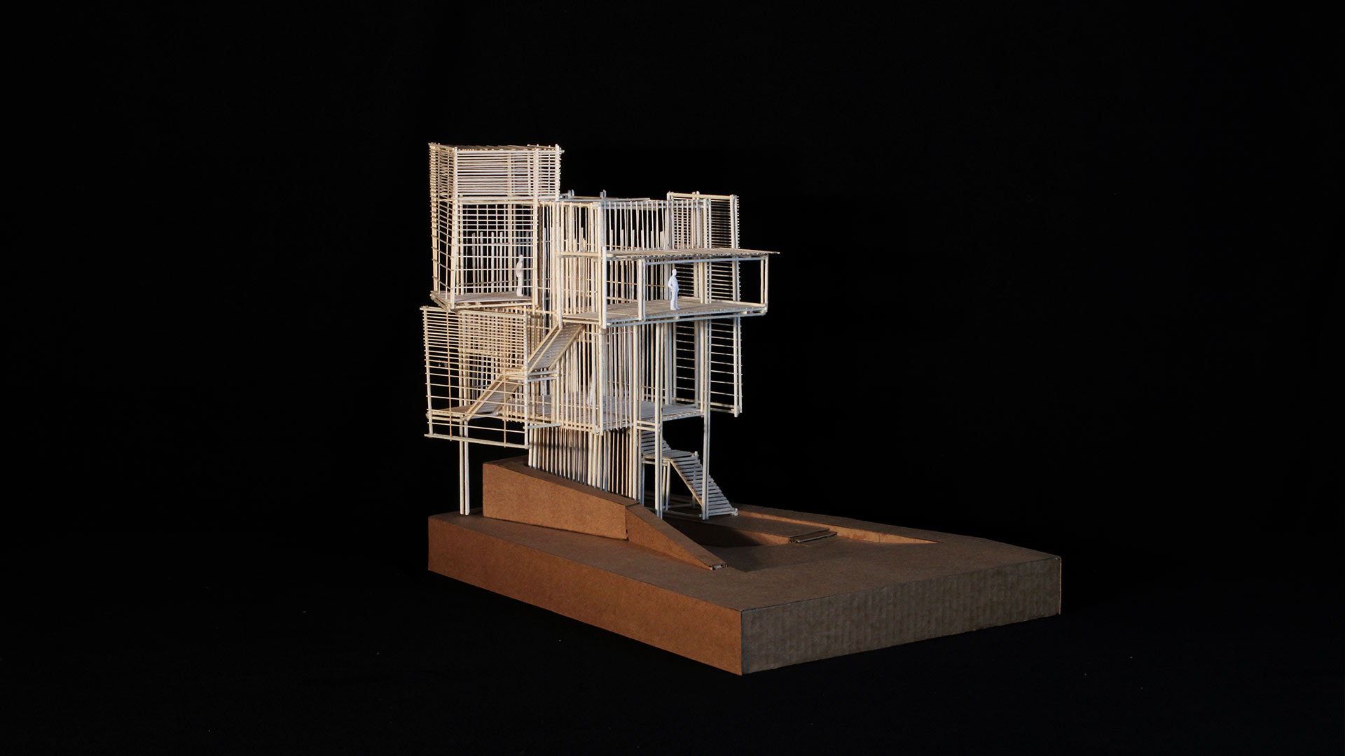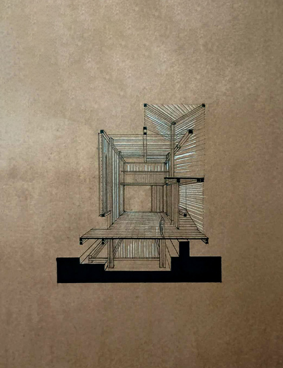 La base cuenta con una huella profunda que pasa por debajo de la estructura principal y complementa el primer espacio del recorrido: el patio de audiencia. A este espacio se accede al bajar por dos rampas con un descanso intermedio. Este descanso nos lleva al segundo espacio, la preparación ascendente, un módulo de elevación que nos conduce al espacio principal, denominado rituales colectivos. Este es el área más amplia y con más conexiones a los otros espacios.