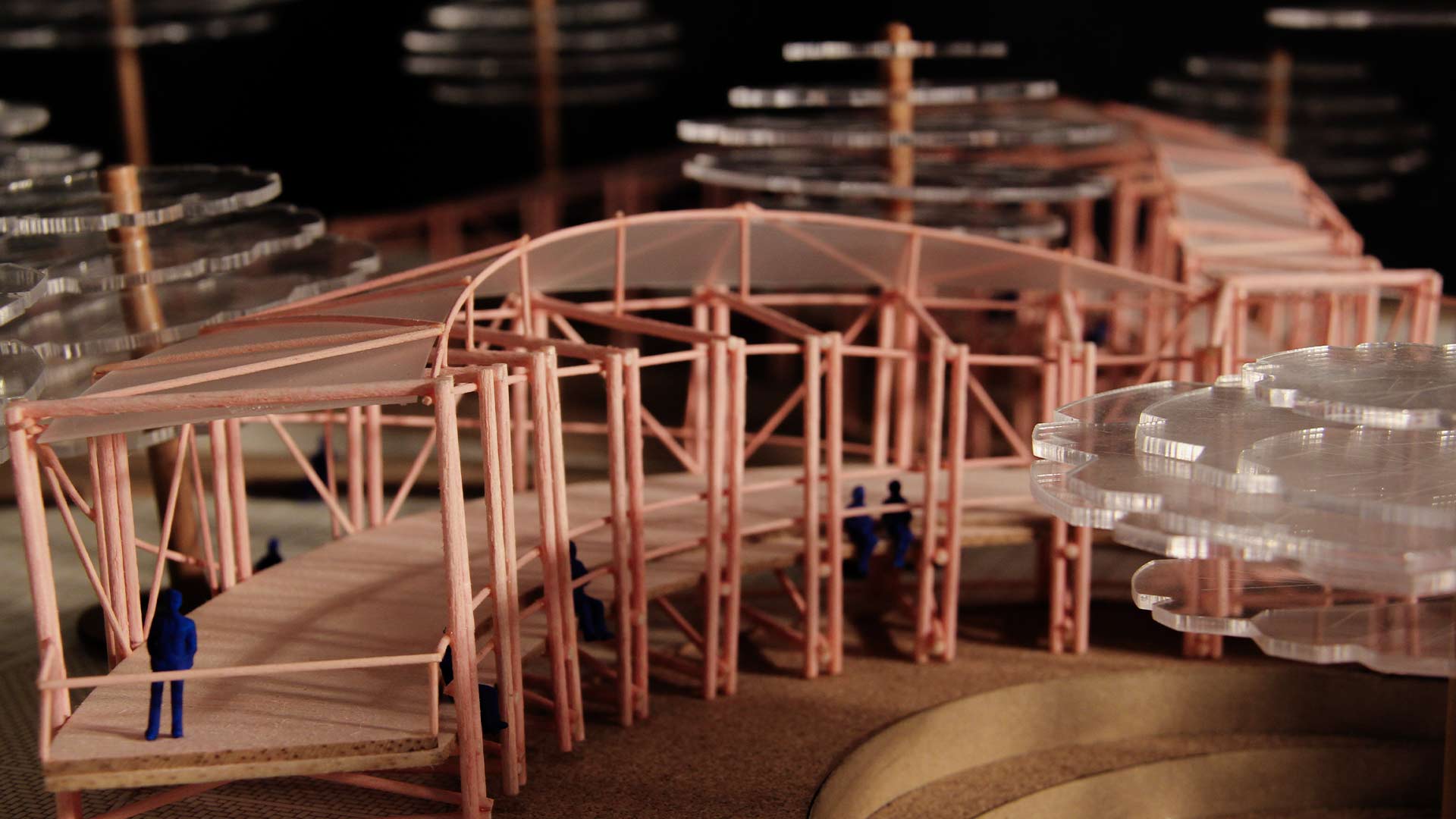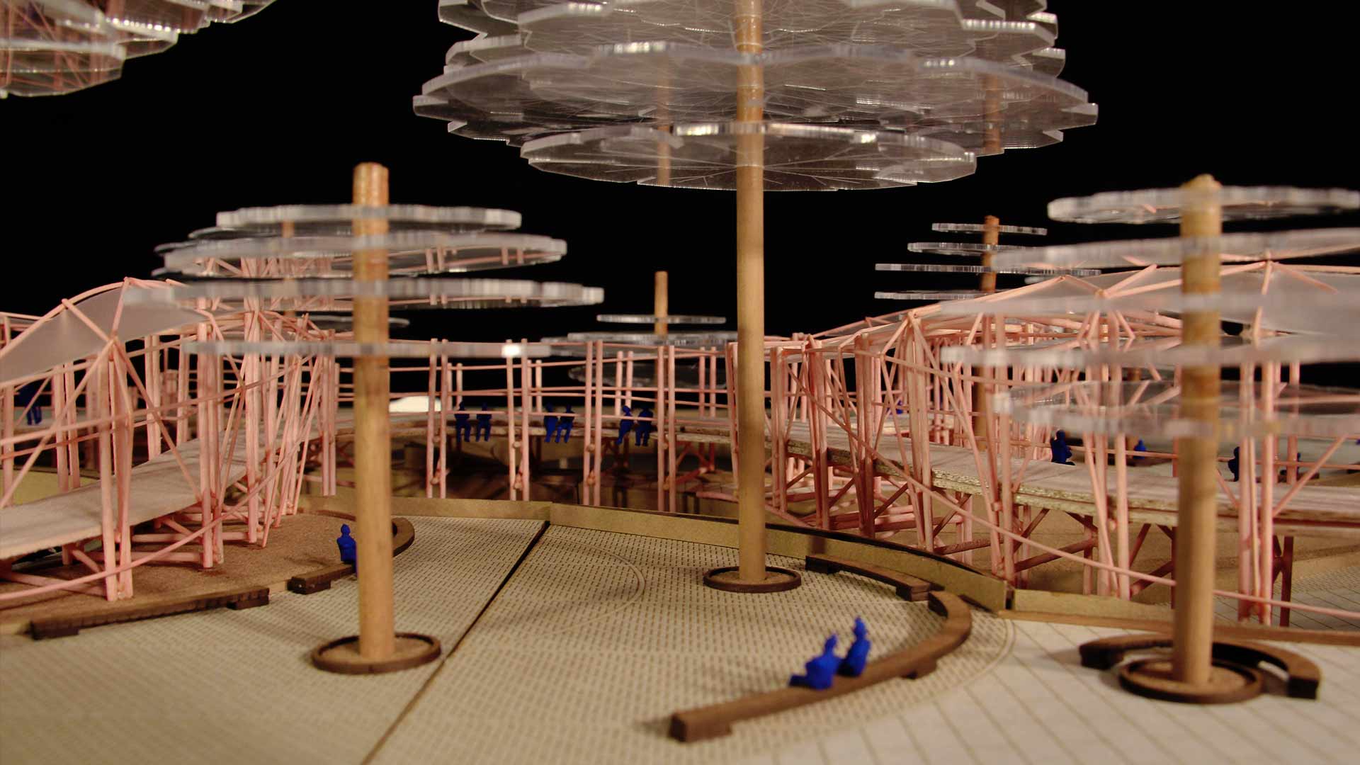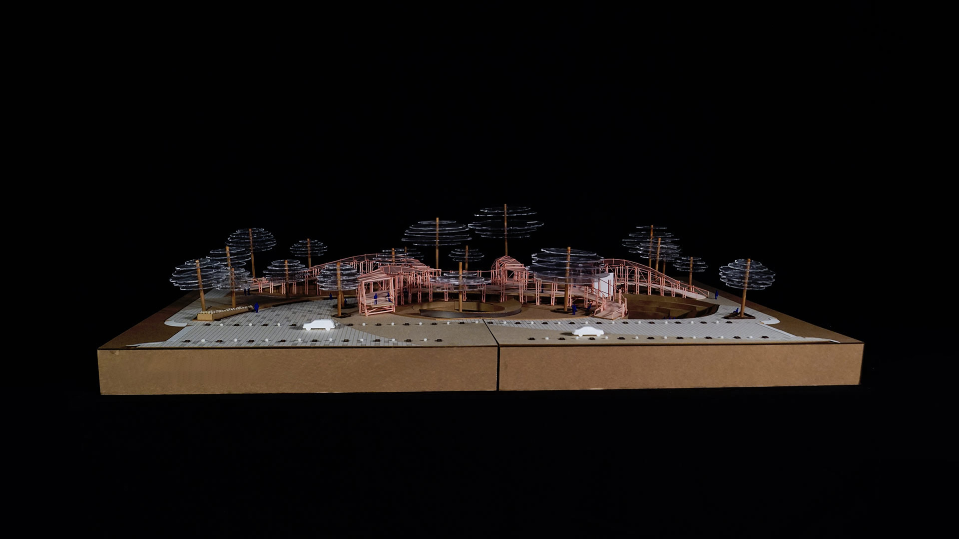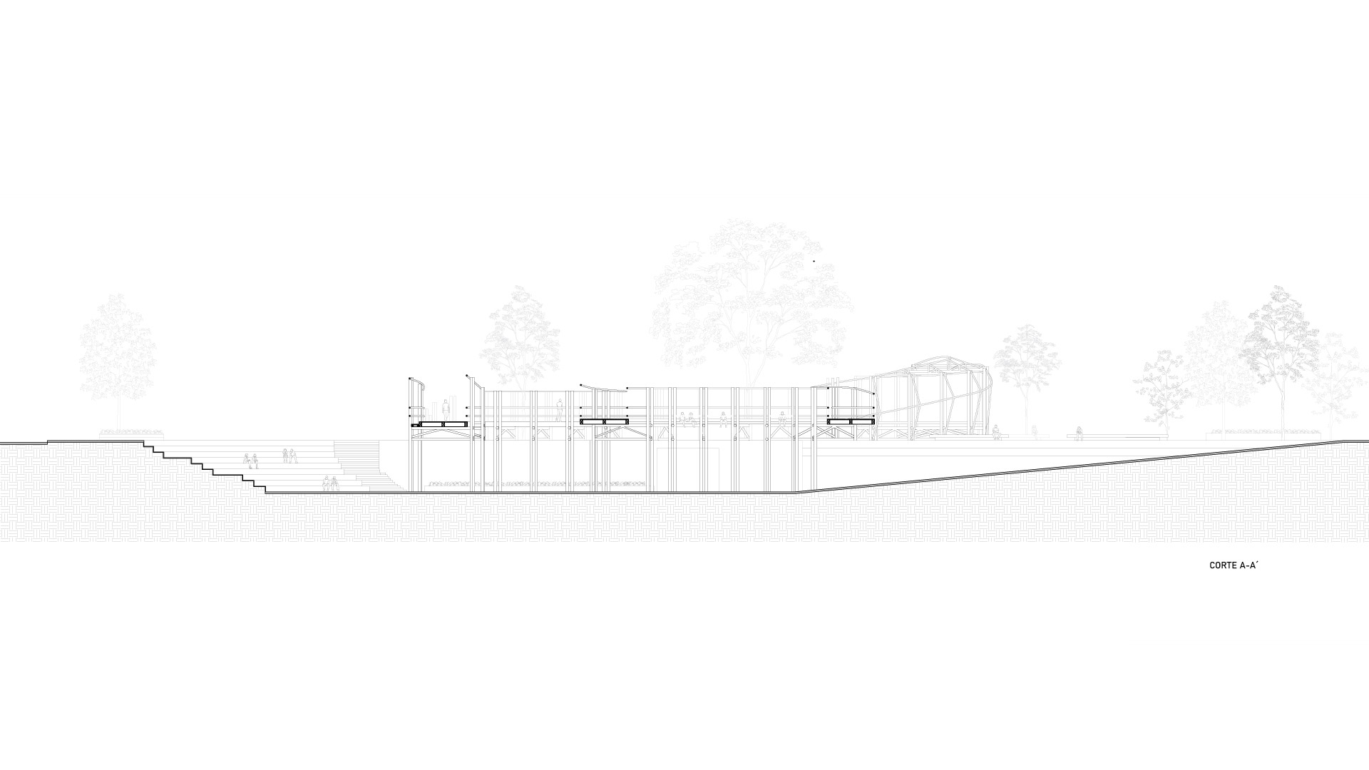La propuesta plantea una intervención en tres niveles: un nivel subterráneo, que alberga talleres de arte y espacios de reunión; un nivel cero, que mantiene la conexión directa con el parque y respeta su función como área verde, y un nivel elevado a +2 metros, conformado por una estructura temporal diseñada sobre el terreno.