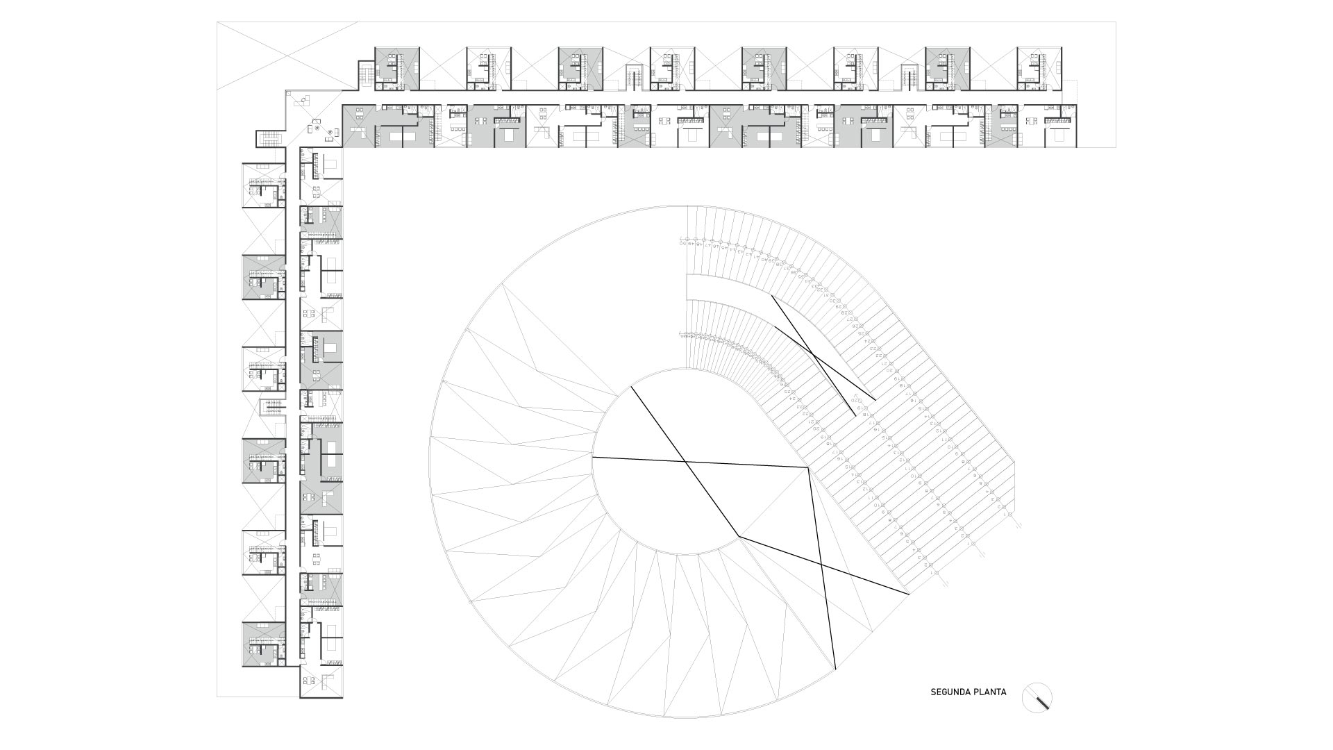 La primera planta está destinada al equipamiento, lo que promueve la comunicación con el entorno urbano y la convivencia entre el edificio. En este nivel, se encuentran espacios de uso comunitario únicamente dirigidos al edificio, como cafetería, gimnasio y lavandería. La estructura del edificio descansa sobre placas y columnas, lo que permite un diseño abierto y flexible.