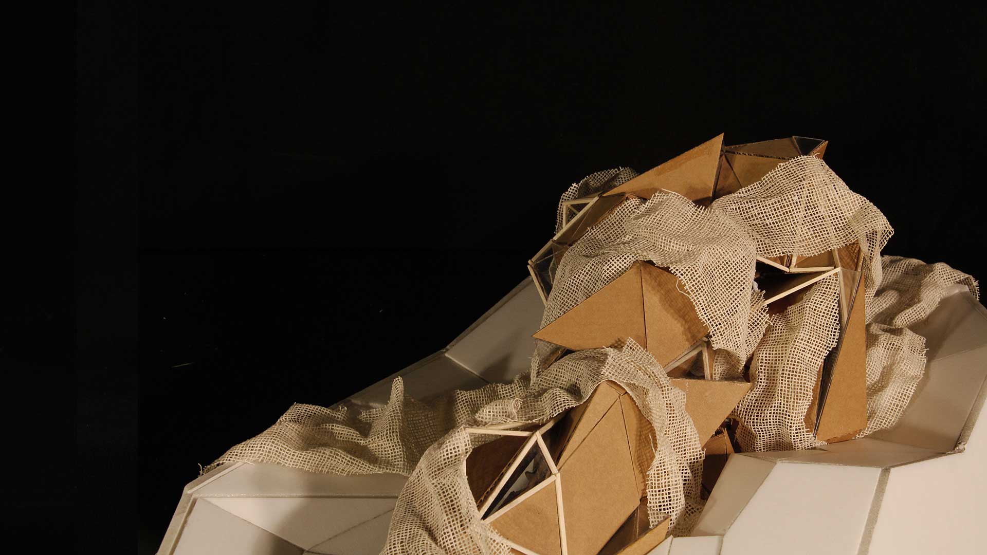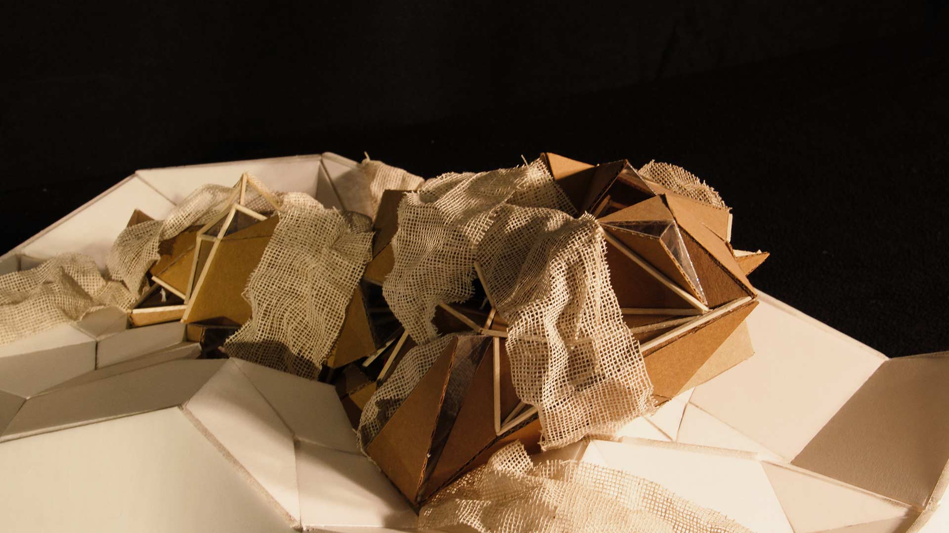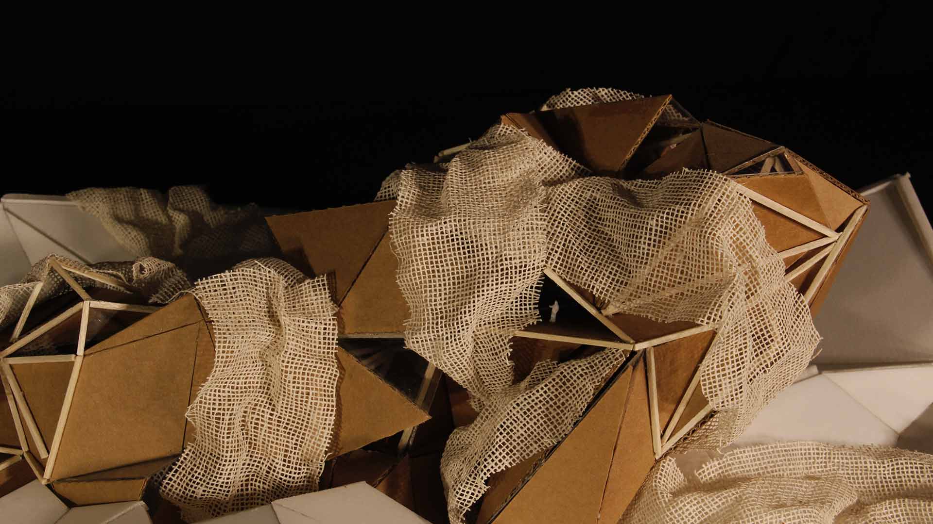 Para la estructura externa, se consideró la forma de la figura ya establecida, de modo que se realizaron cerramientos y aberturas estratégicas y se generaron diferentes emociones y sensaciones. Por otro lado, el contexto se basa en un entorno rocoso, con picos y pliegues diseñados para una correcta transmisión. Finalmente, se usó yute para crear una textura rocosa, apoyado en algunas áreas sobre varitas de madera, para fortalecer la integración entre los materiales.