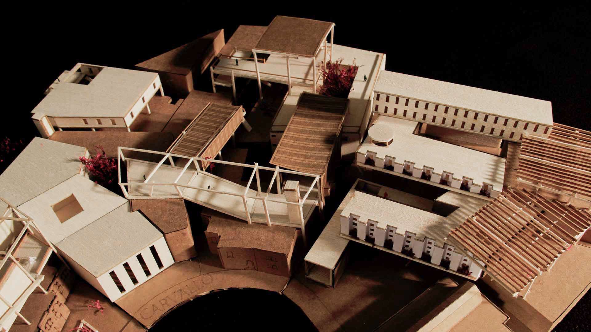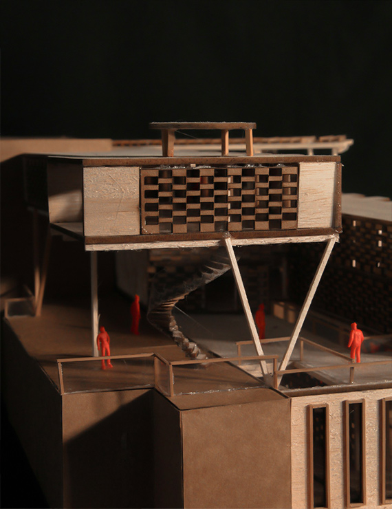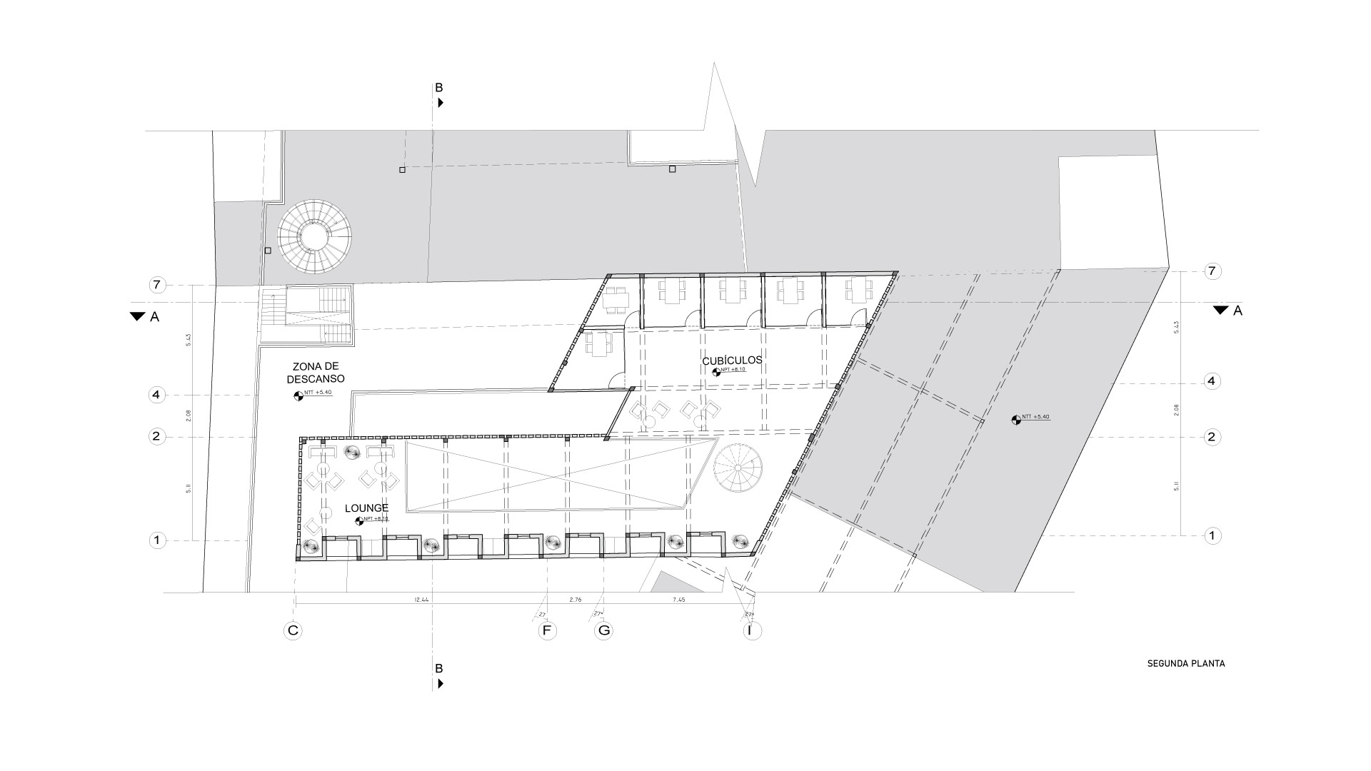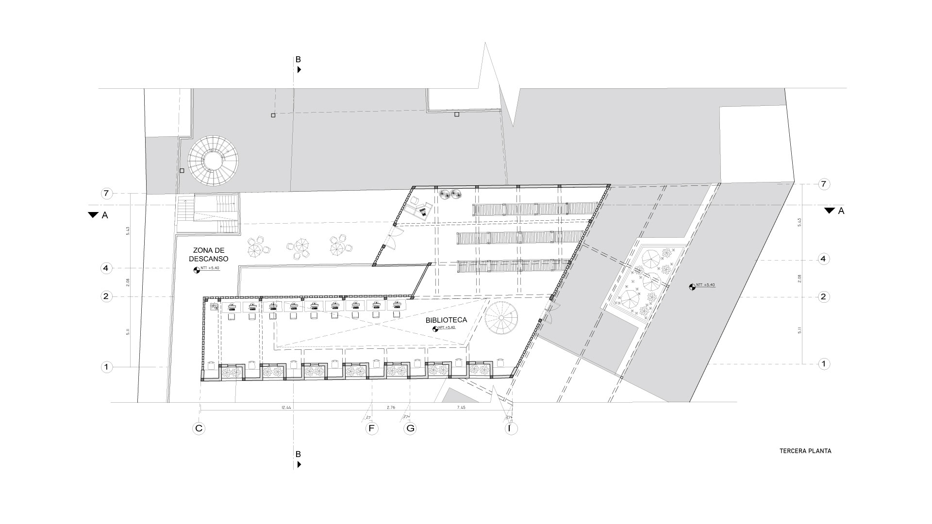 También incluye baños públicos y una lavandería. Finalmente, el último nivel es más privado y contiene los dormitorios, cada uno con cama, escritorio, clóset y baño privado. La distribución jerárquica de los niveles prioriza actividades comunes en los espacios inferiores y reserva los superiores para funciones más privadas. La arquitectura responde al contexto mediante formas y fachadas que respetan las características de la casona y el entorno. Los volúmenes generan espacios intermedios, como terrazas, mientras que el diseño de las ventanas crea dinamismo al jugar con luz y sombra, de modo que integra el edificio con su contexto.