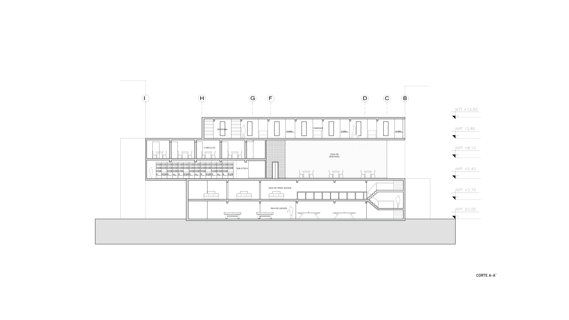 El sector de la propuesta cuenta con una casona y un terreno vacío. Por ello, el objetivo del proyecto es crear un espacio multifuncional para los estudiantes, lo que promueve interacción, estudio y convivencia. El primer nivel, diseñado como una zona común, ofrece un lugar para que los estudiantes conversen, se diviertan y jueguen. Este espacio público está pensado para ser accesible a todos. En el segundo nivel, se encuentra una biblioteca equipada con escritorios y cubículos, ideales para estudiar o trabajar con mayor privacidad. El tercer nivel alberga una cocina y un comedor comunitario, de modo que fomenta la convivencia entre residentes.