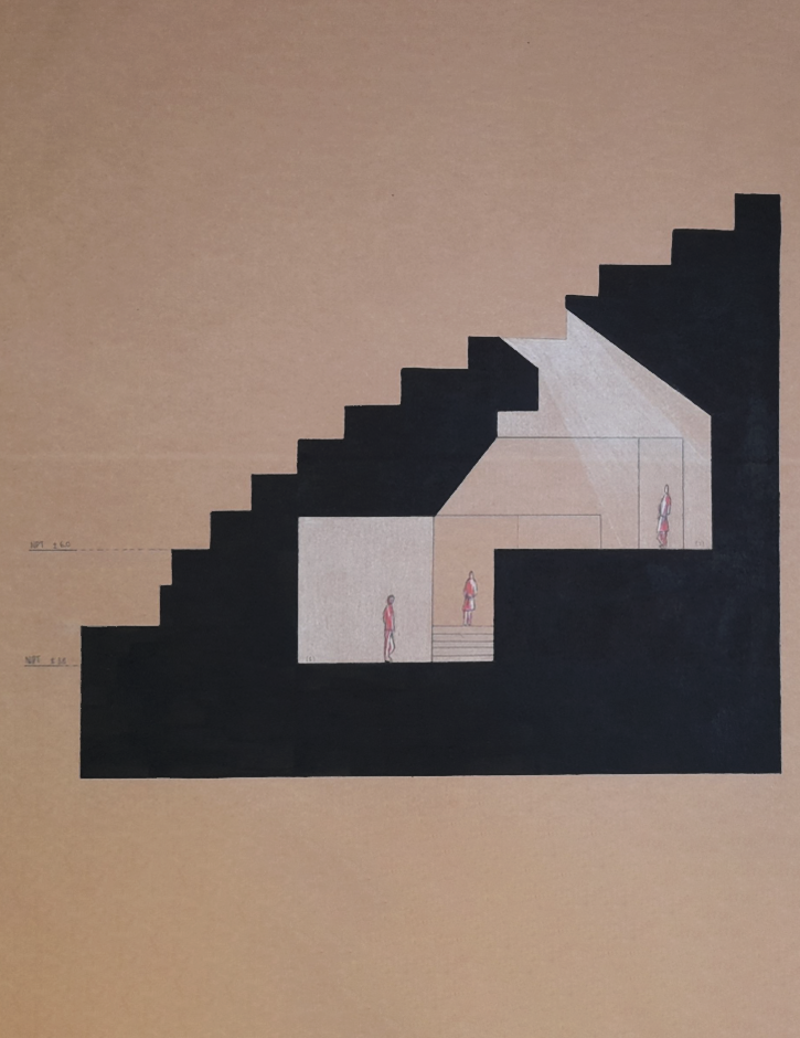 El proyecto consiste en una maqueta topográfica que representa la Bajada de Baños de Barranco, desarrollada con un diseño que aprovecha el terreno mediante excavaciones para crear una serie de espacios subterráneos innovadores. El objetivo de este enfoque es integrar la arquitectura con el entorno natural y cultural, que respete las características únicas del lugar y genere una propuesta sostenible y funcional, en sintonía con los ideales del movimiento Solarpunk.