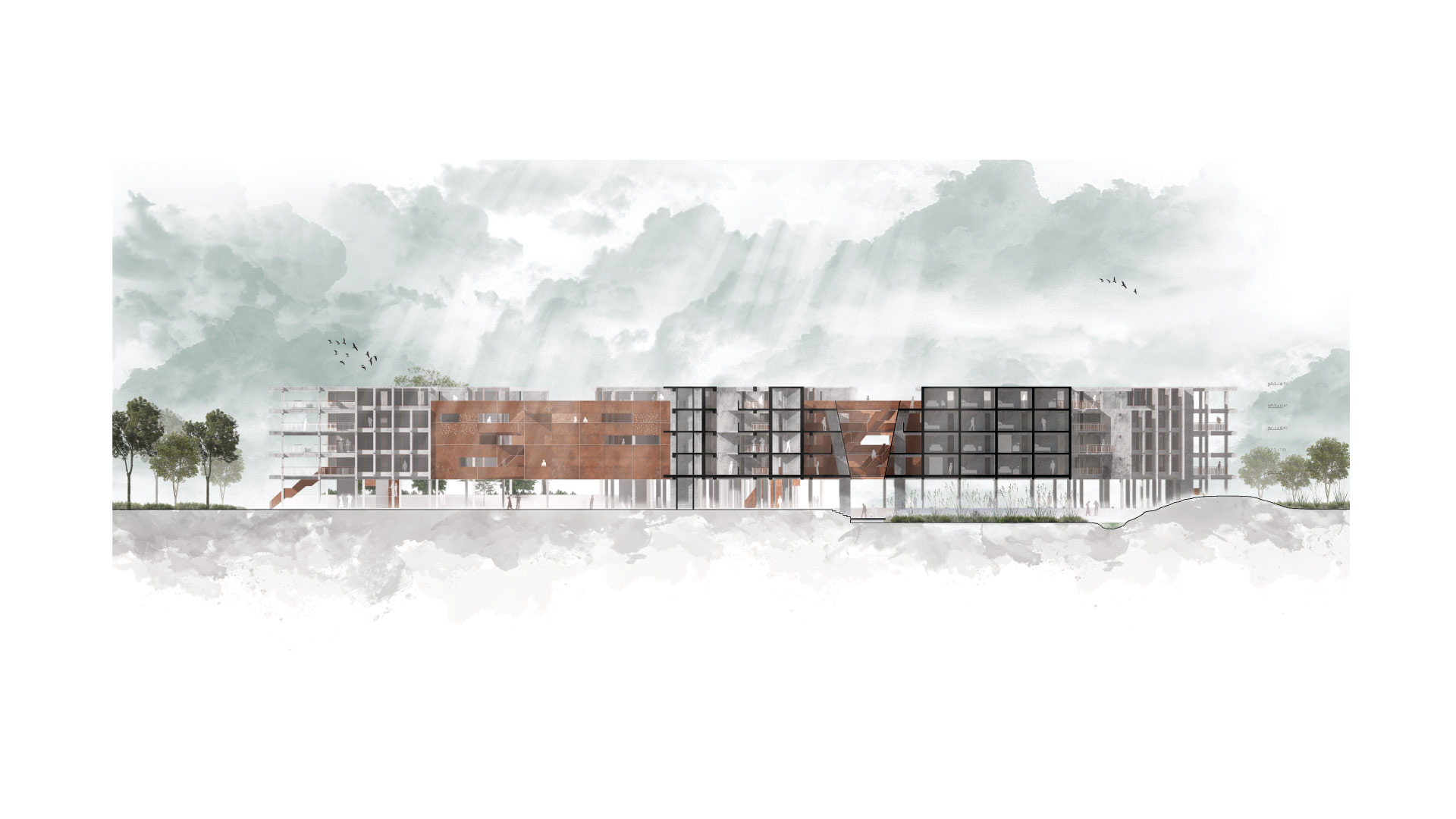 Estos atraviesan el proyecto y los volumenes; así, generan intersecciones en los espacios y la continuidad visual, la cual permite recibir la luz en los edificios. Finalmente, estos, a su vez, diversifican el contacto del edficio con el suelo y dinamizan la interacción necesaria para los estudiantes; de esta forma, genera espacios comunes que apoyan a la residencia con las necesidades básicas que requieren los estudiantes.
