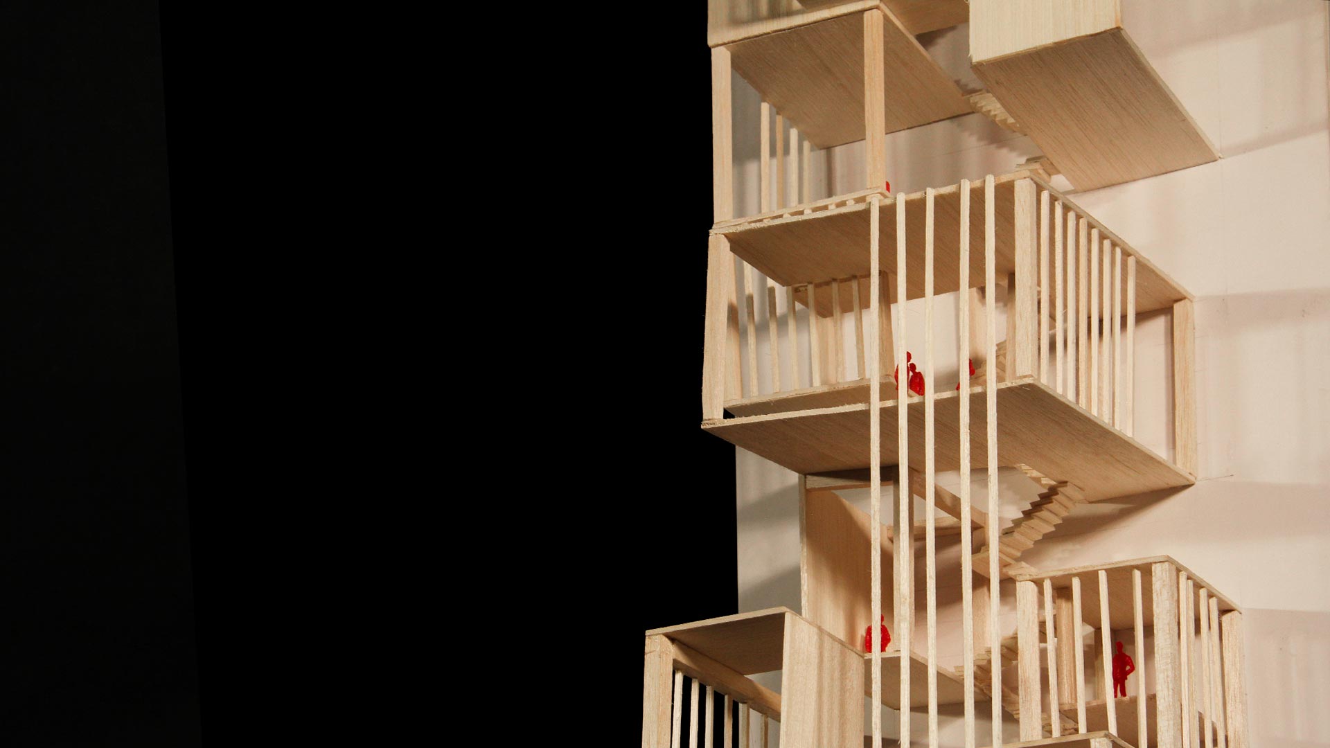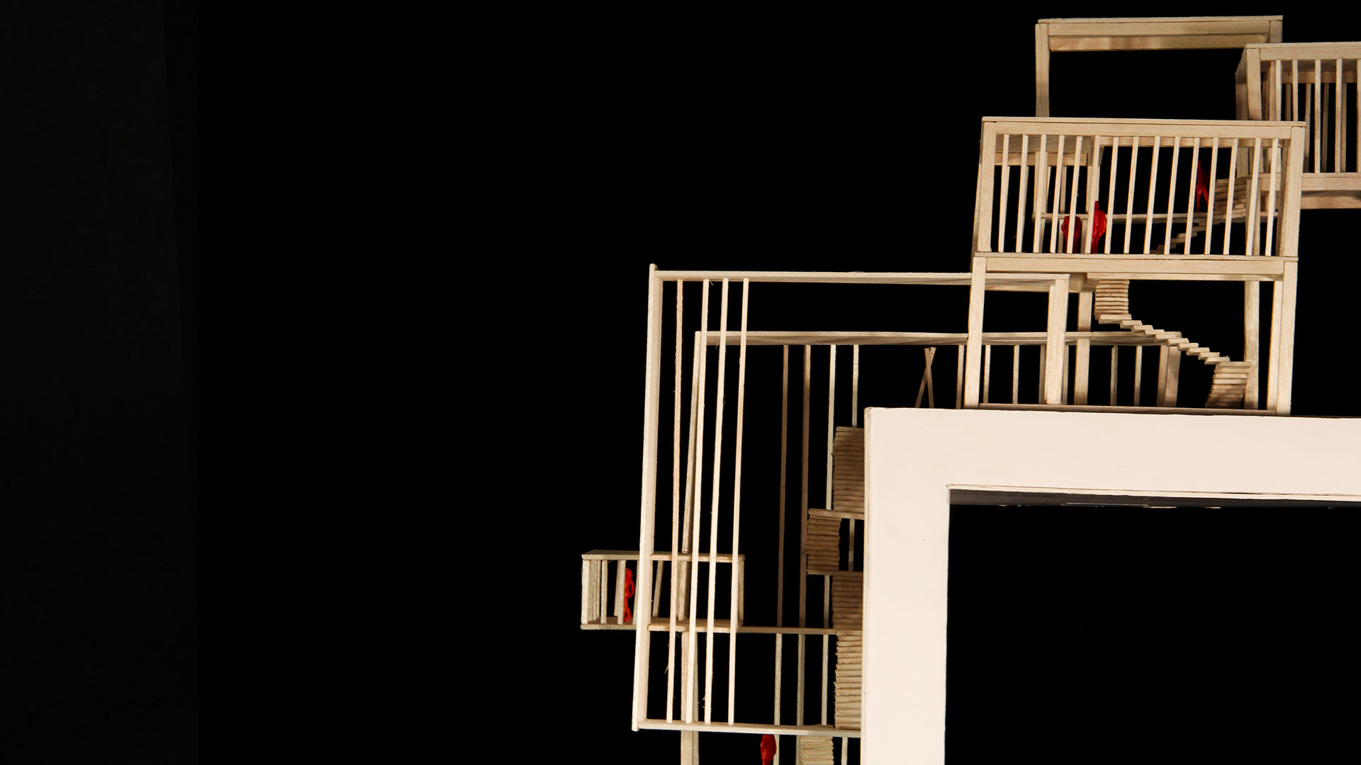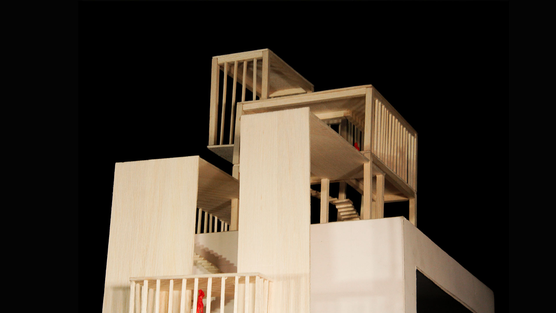 Se trabajó con madera balsa. Para las superficies, como pisos y techos, se usaron láminas de esta madera de 3 mm, mientras que los cerramientos y detalles se realizan con varillas del mismo material. También, la madera fue usada para diseñar las escaleras, a fin de mantener la coherencia en todo el proyecto.