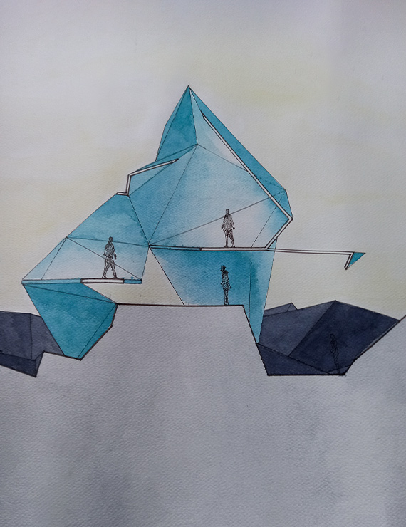 Esto hasta alcanzar el espacio de llegada, desde donde se ingresa al habitáculo. Dentro se observa la relación conexa entre el tercer espacio en el habitáculo, el espacio interior y el espacio de llegada de los peregrinos. El proyecto plantea un territorio complejo donde se descubren partes del habitáculo a lo largo del recorrido mediante el lenguaje de las plegaduras para formarlos.