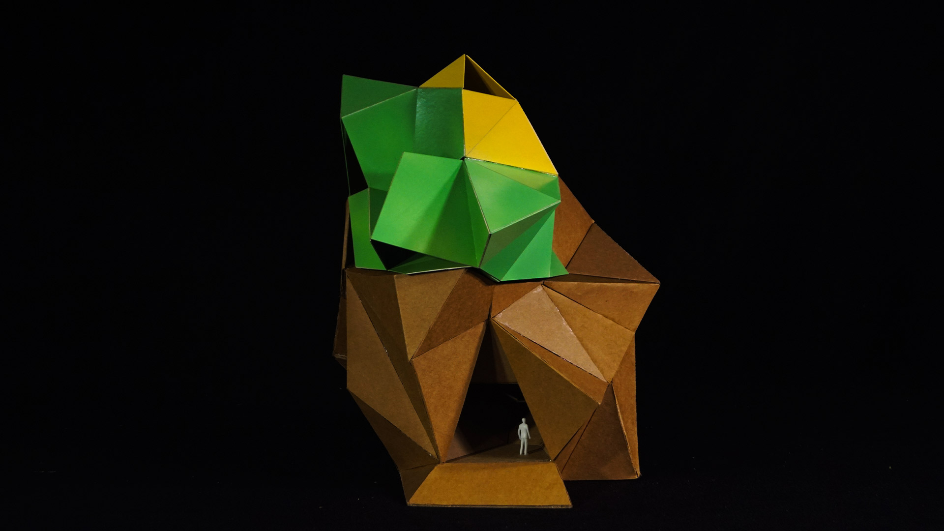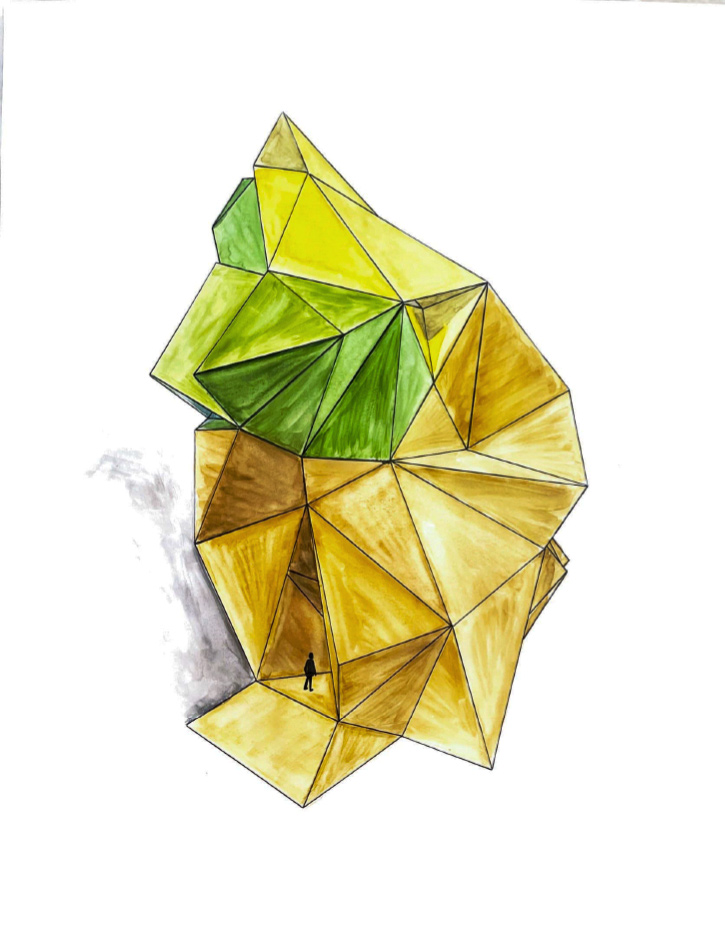 Finalmente, se diseñó un pedestal para este objeto a modo de territorio excavado. Este territorio cuenta con un espacio de llegada desde el exterior y tres espacios adicionales, uno de los cuales conecta con el habitáculo.